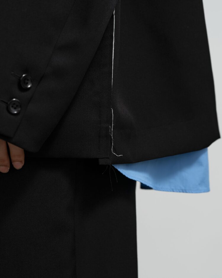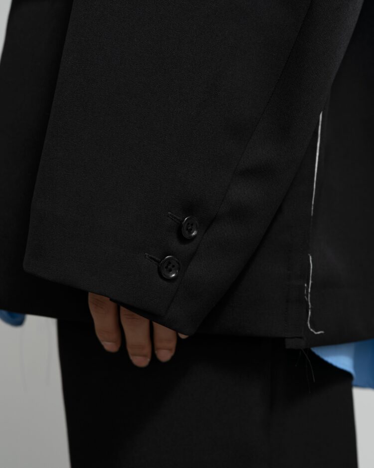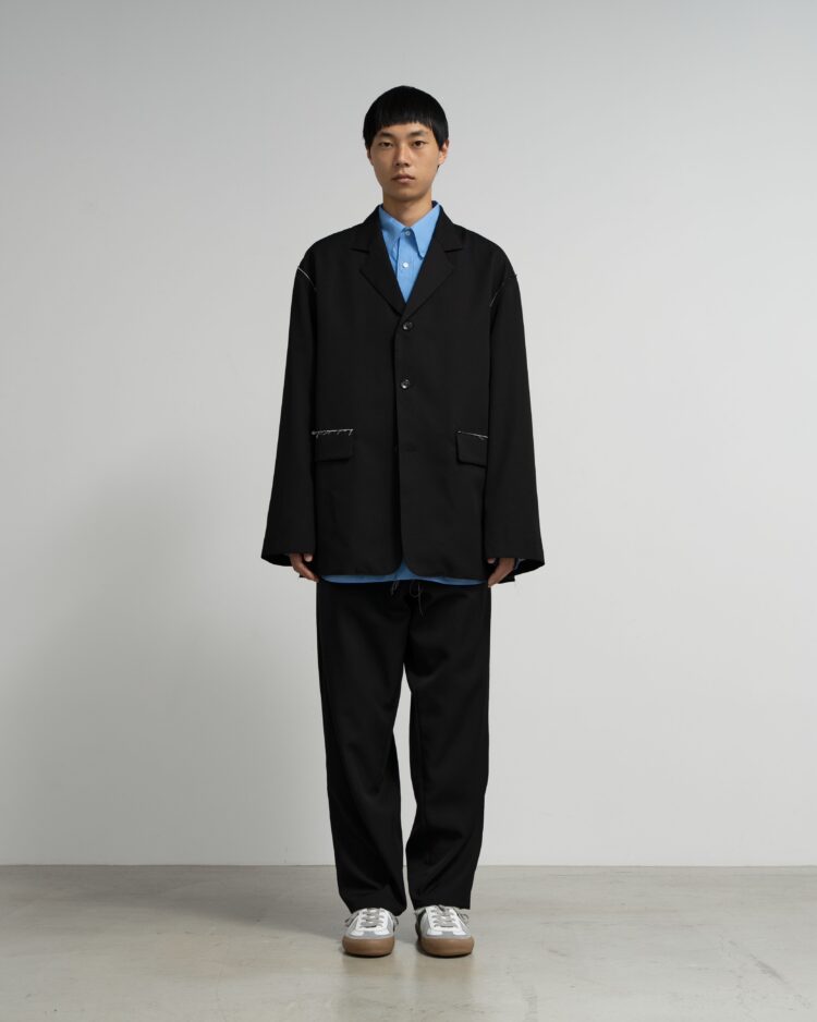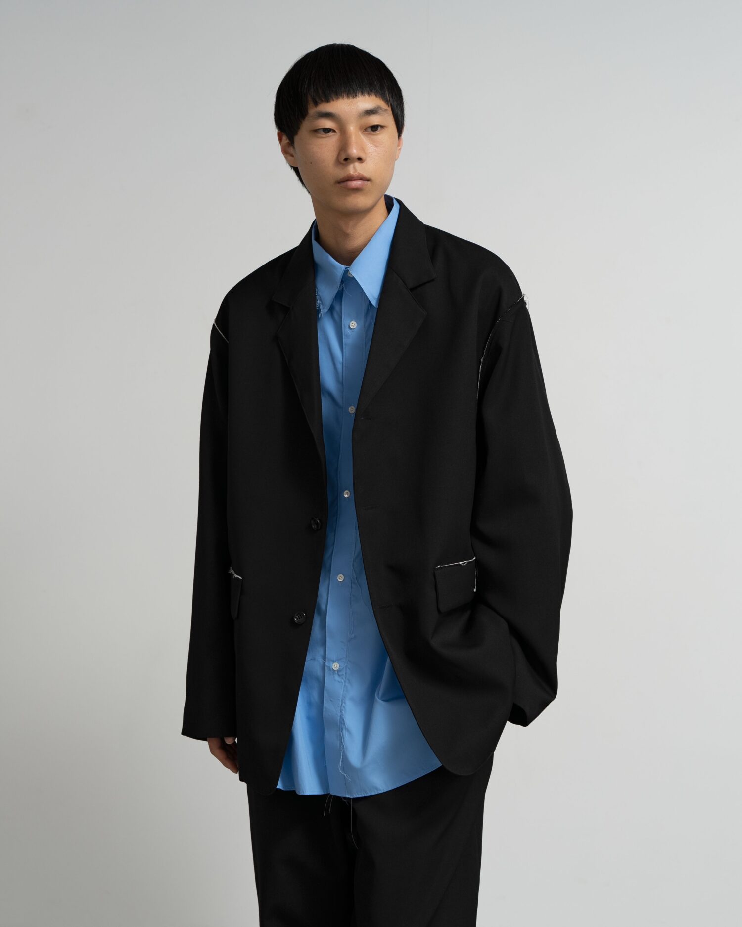 端正なテーラリングに対し、Camiel Fortgensらしい切りっぱなしの縫い付けをアームホールやポケットに施しディテールが際立つ一着。無染色のシーチング生地を使用したライニングが印象的です。※本製品は、素材の風合いやデザインを活かすため、袖口や裾に断ち切りの仕様を施しています。着用を重ねることで生地端にほつれが生じる場合がございますが、製品特性としてご理解ください。※生産工程の一部に手作業を取り入れているため、形やサイズには個体差があり、寸法数値と実際のサイズに差が生じる場合がございます。