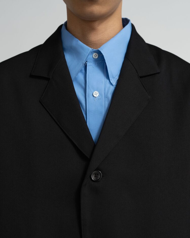 3ボタンのオーバーサイズジャケット。高密度に織り上げたギャバジンをレジン加工することで、しなやかさと弾力性を両立したScale Off Wool素材を使用。