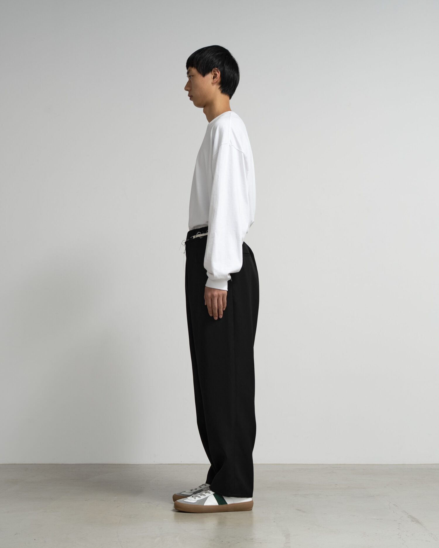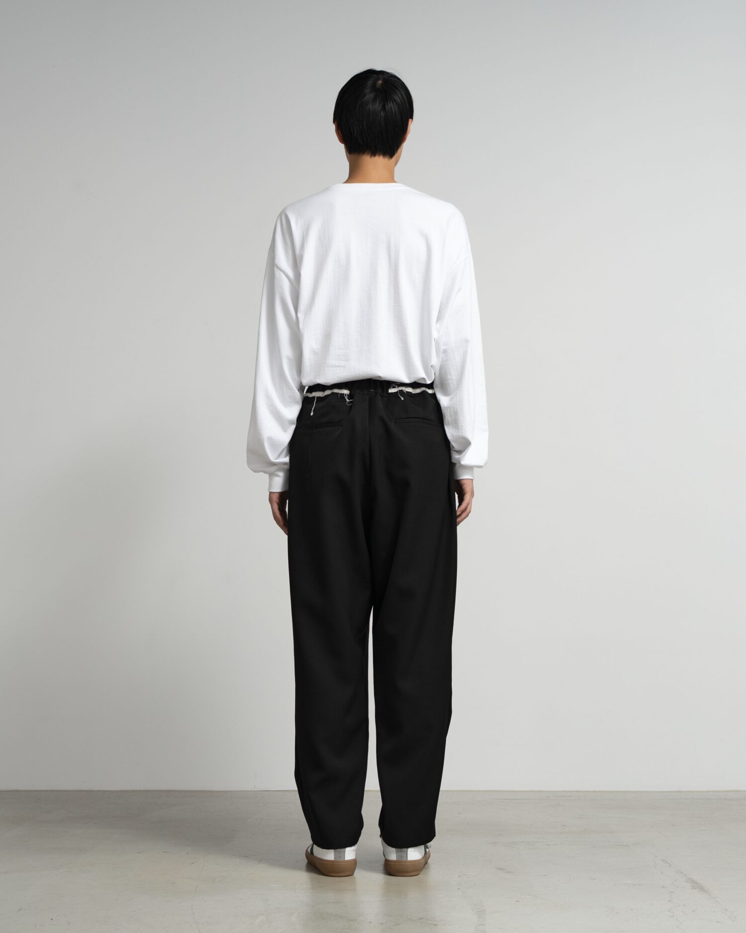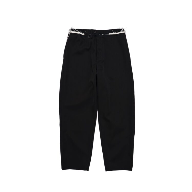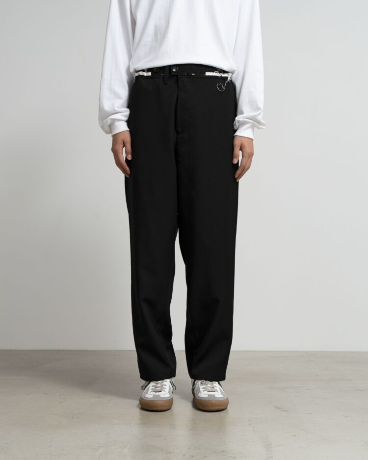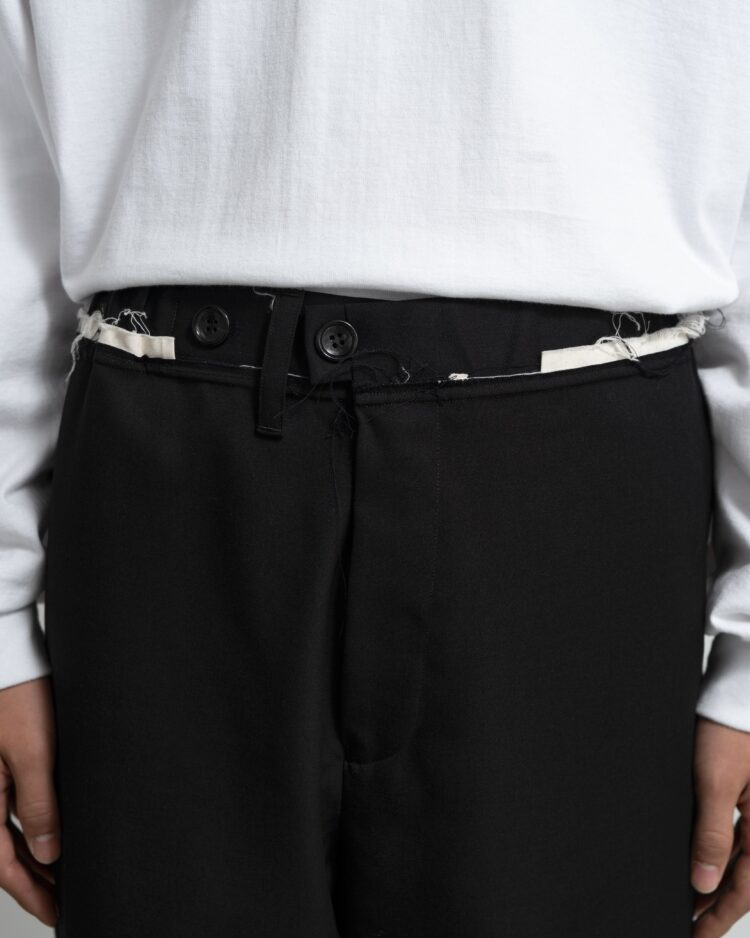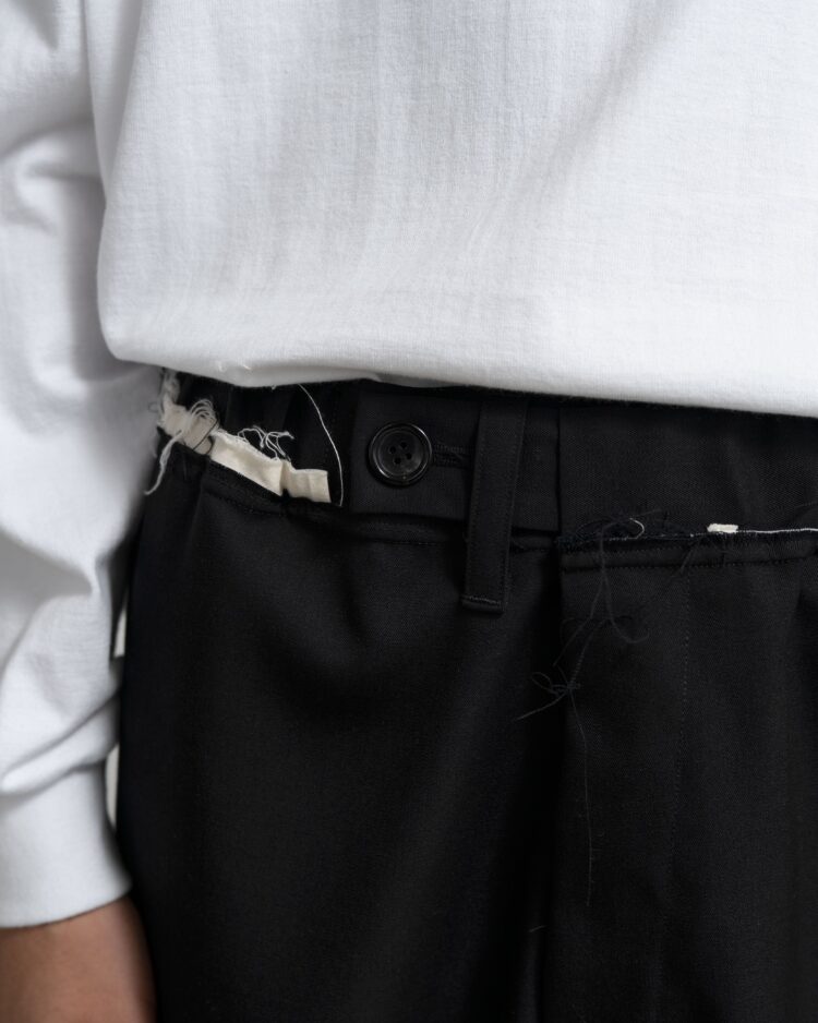 従来のベルクロ仕様をボタンタブに変更し、ウエストの袋布をあえて見せるなど、切りっぱなしディテールを追加。素材にはScale Off Woolを使用し、軽やかな弾力を備えた高密度ギャバジンを採用しました。一部裏地をつけて仕立てることてで、着心地の良さも両立。同素材のジャケットと合わせたセットアップスタイルも可能です。