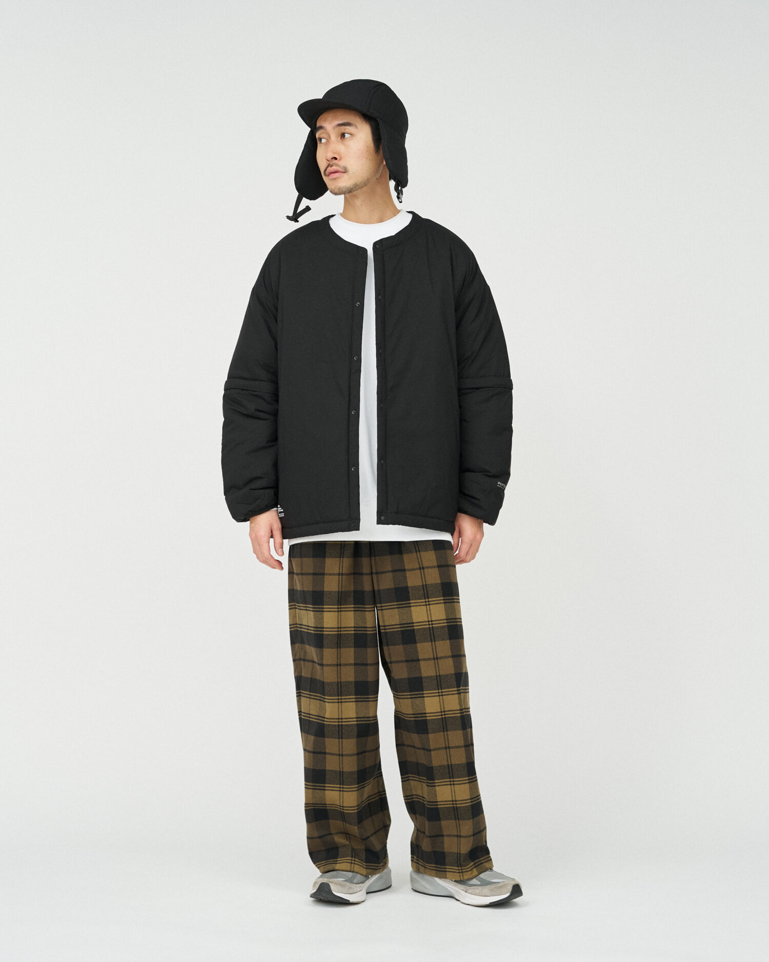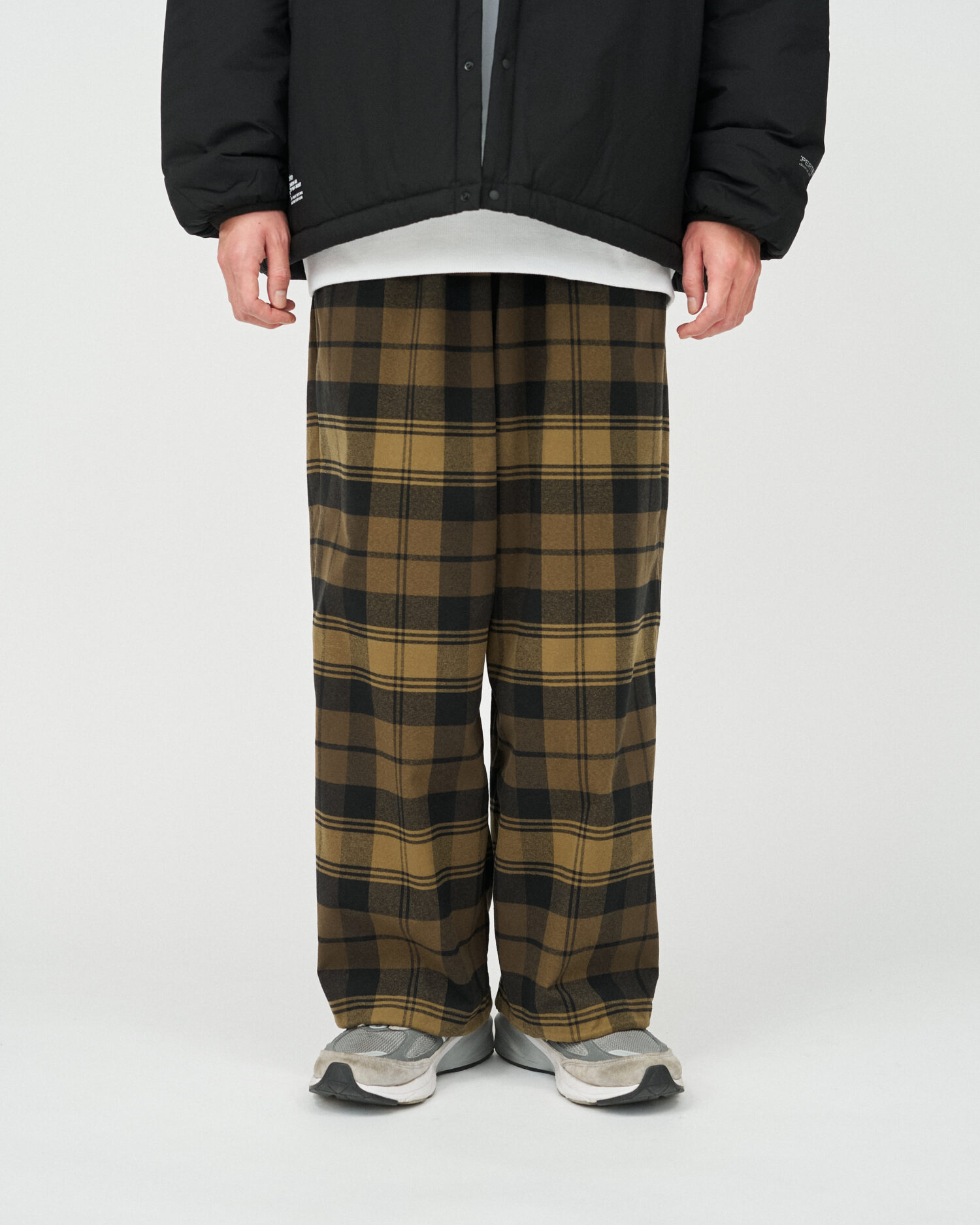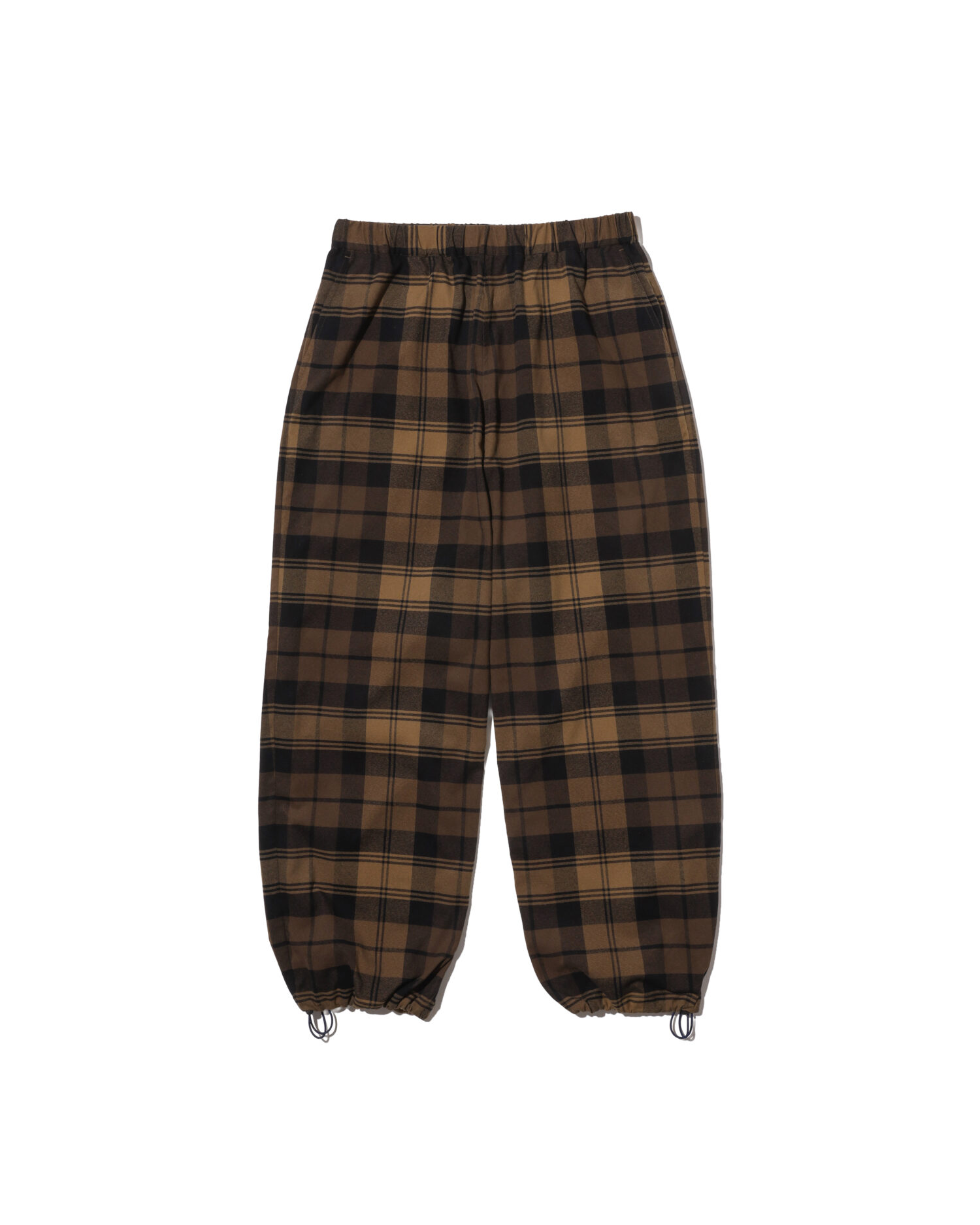 フランネルチェック生地を使用したワイドパンツ。軽さと暖かさに加え、イージーケアも備えた機能素材をチョイス。ゆったりとしたストレートシルエットに、裾のドローコードでシルエットのアレンジも可能。ウエストはゴムとドローコード仕様で快適な穿き心地をキープ。