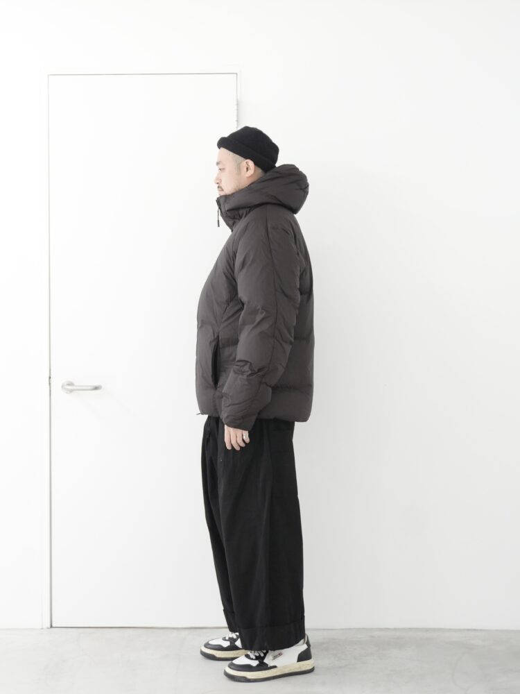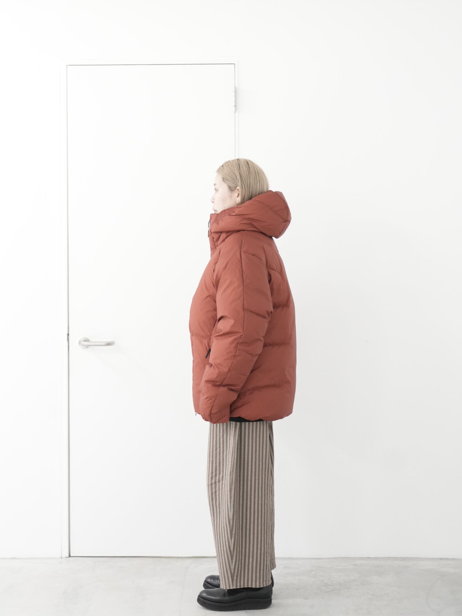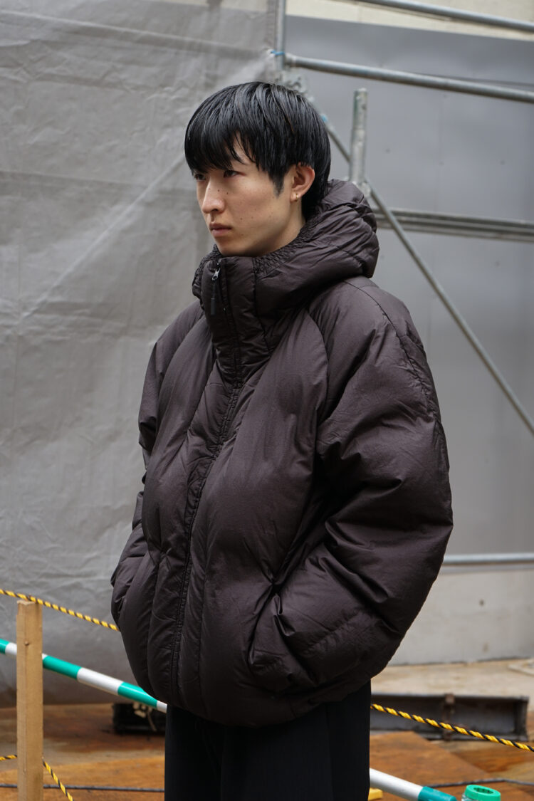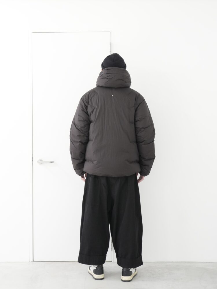 PERTEX QUANTUM AIR / DIAMOND FUSE生地を使用した軽量で撥水加工を施したダウンジャケットで、表面のステッチや生地の切り替えが途中で消えていく独創的なデザインのダウンジャケット。フード周りのシャーリングやミニマルな袖口など、背中には、J.L-A.Lを象徴する極小のメタルパーツを取り付けました。