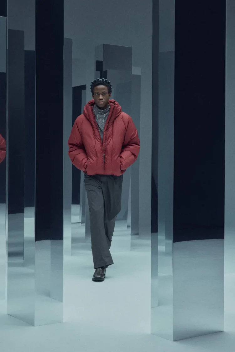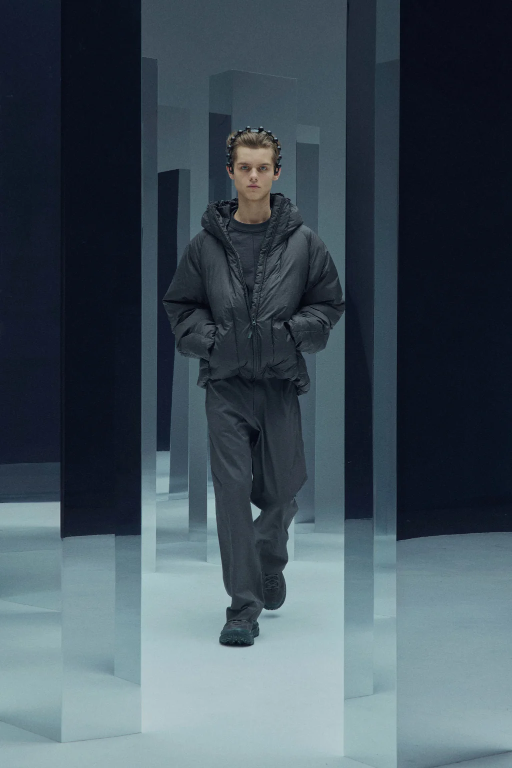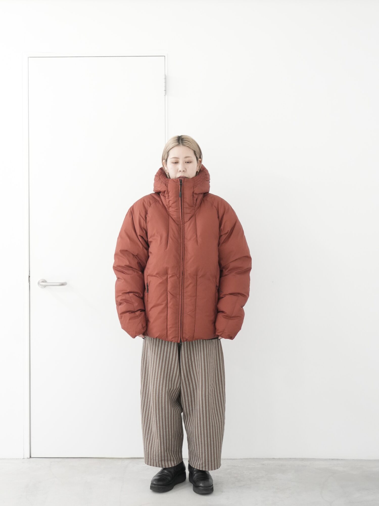 PERTEX QUANTUM AIR / DIAMOND FUSE生地を使用した軽量で撥水加工を施したダウンジャケットで、表面のステッチや生地の切り替えが途中で消えていく独創的なデザインのダウンジャケット。フード周りのシャーリングやミニマルな袖口など、背中には、J.L-A.Lを象徴する極小のメタルパーツを取り付けました。