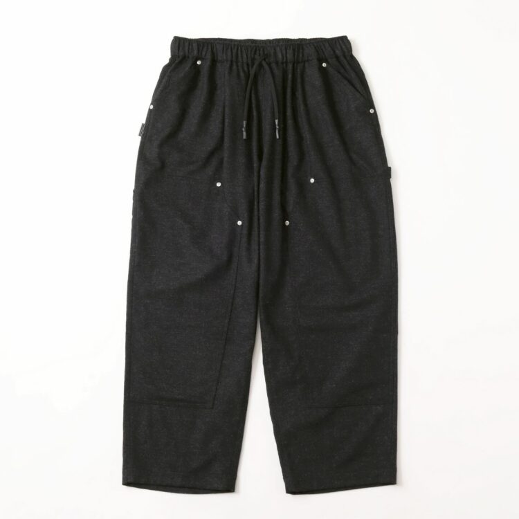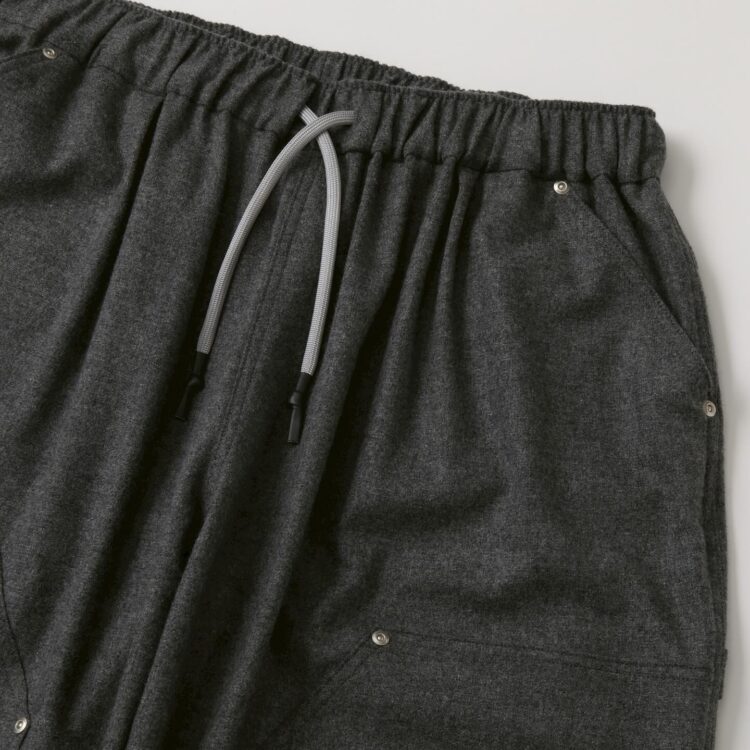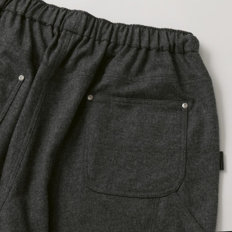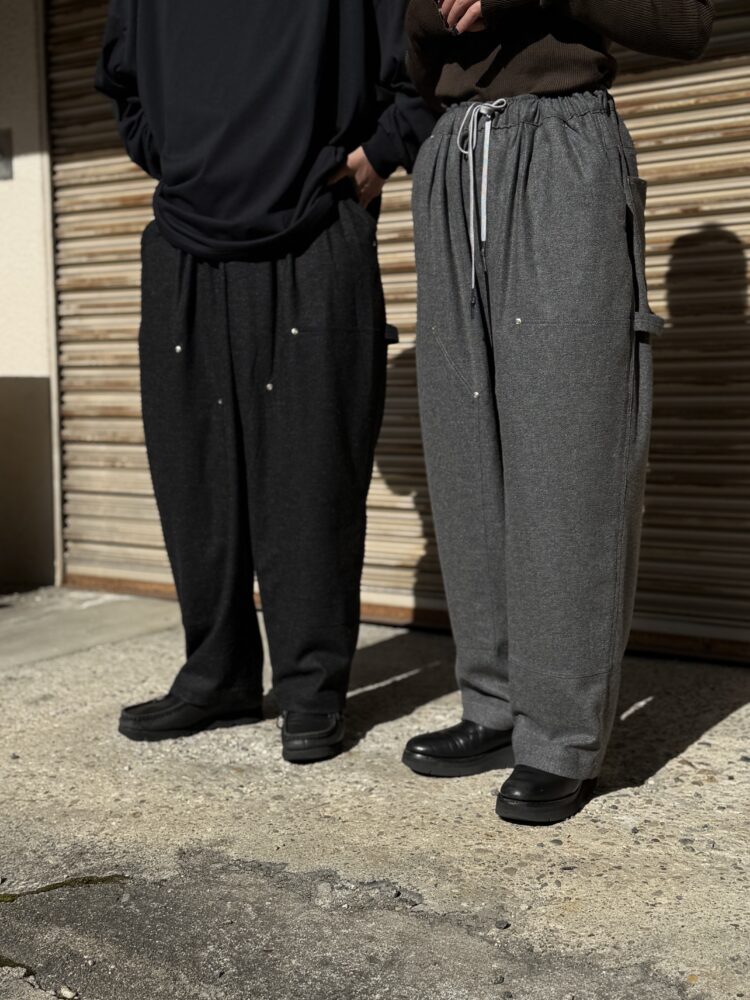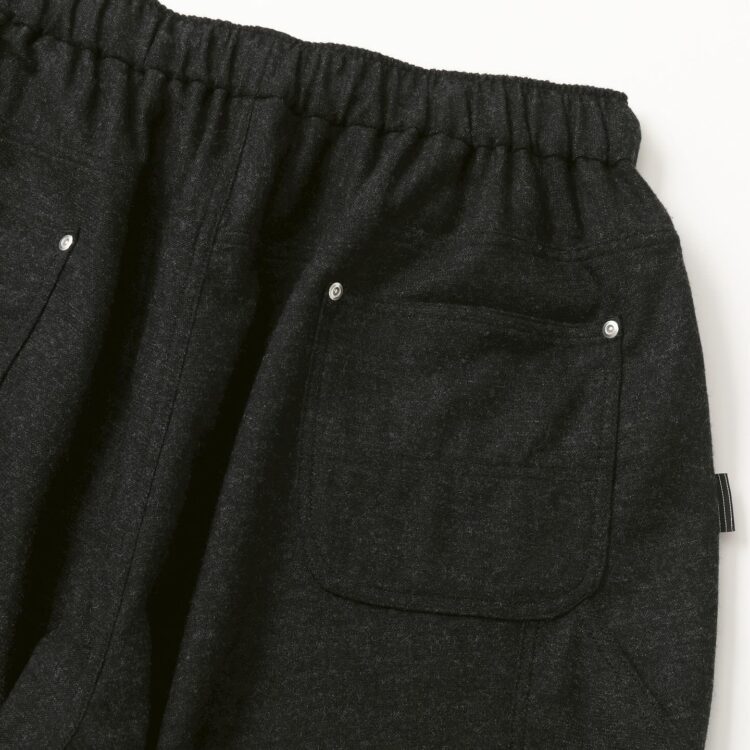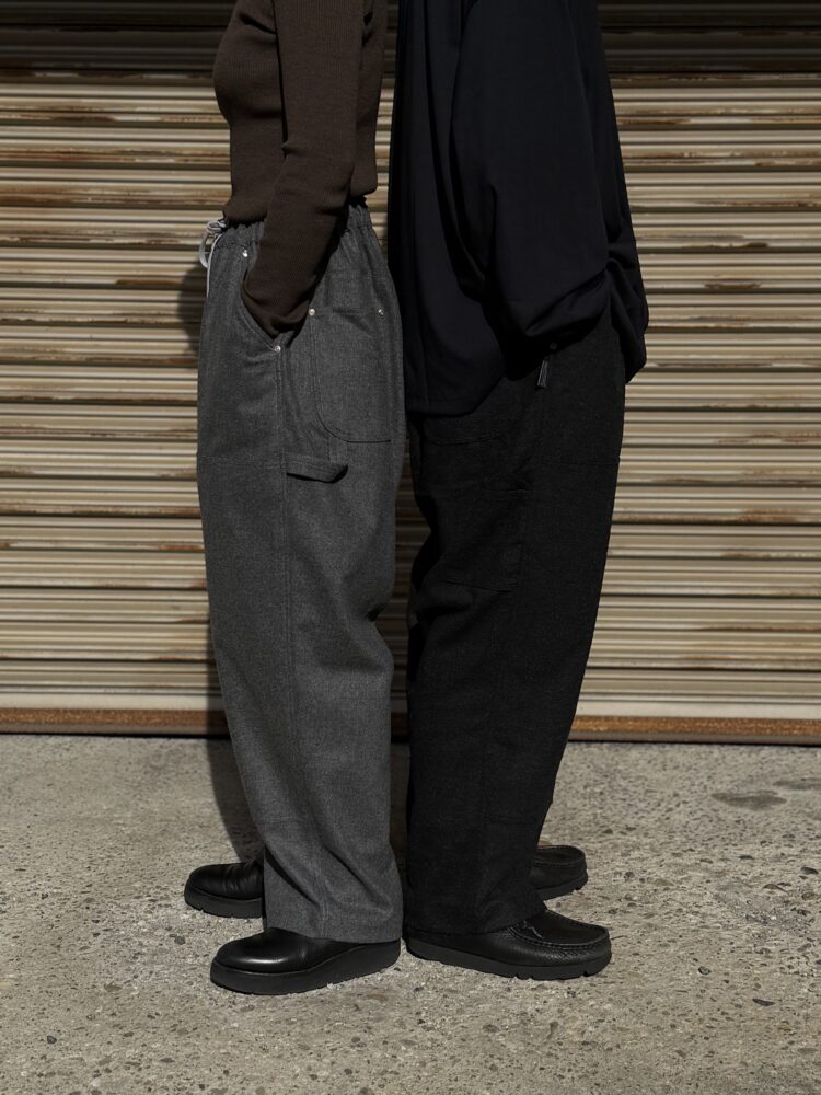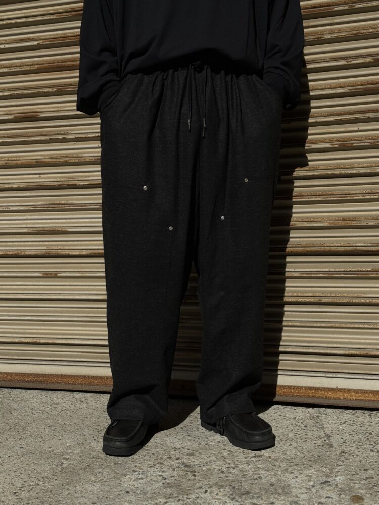SFC WIDE TAPERED EASY PANTSをさらに腰回りを大きく、裾幅を広く、スーパーワイドなシルエットにアレンジしたバギーウールパンツ。ダブルニー仕様や、ハンマーループ、ツールポケットなどのワークパンツのディテールを取り入れた新型パンツです。素材はカシミヤブレンドのWOOLで、しなやかな良質な肌触りとストレッチ性を持った上質の素材です。