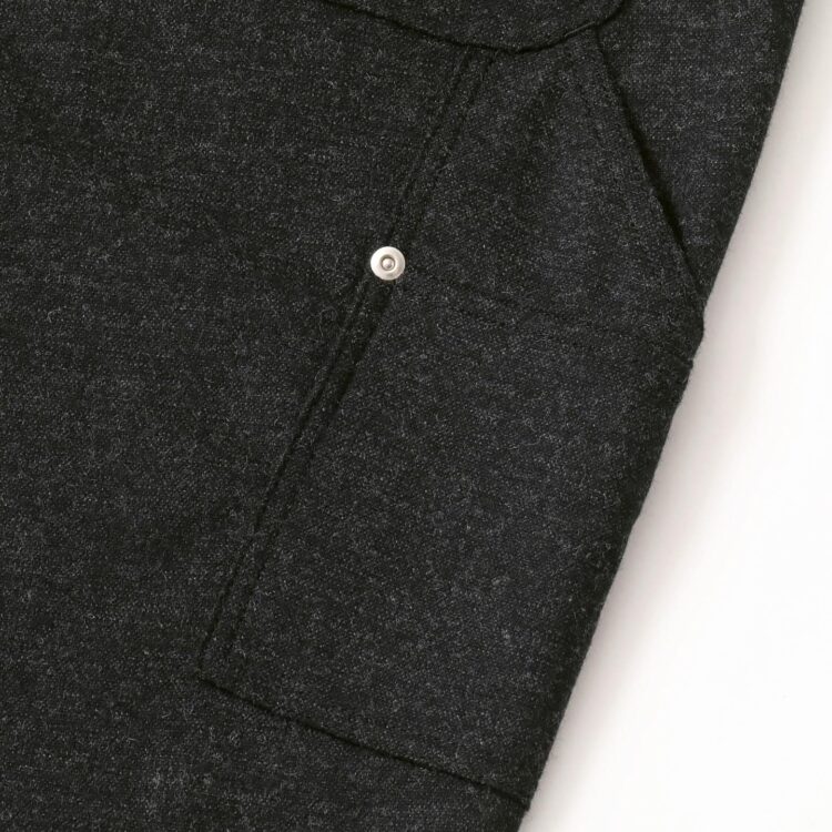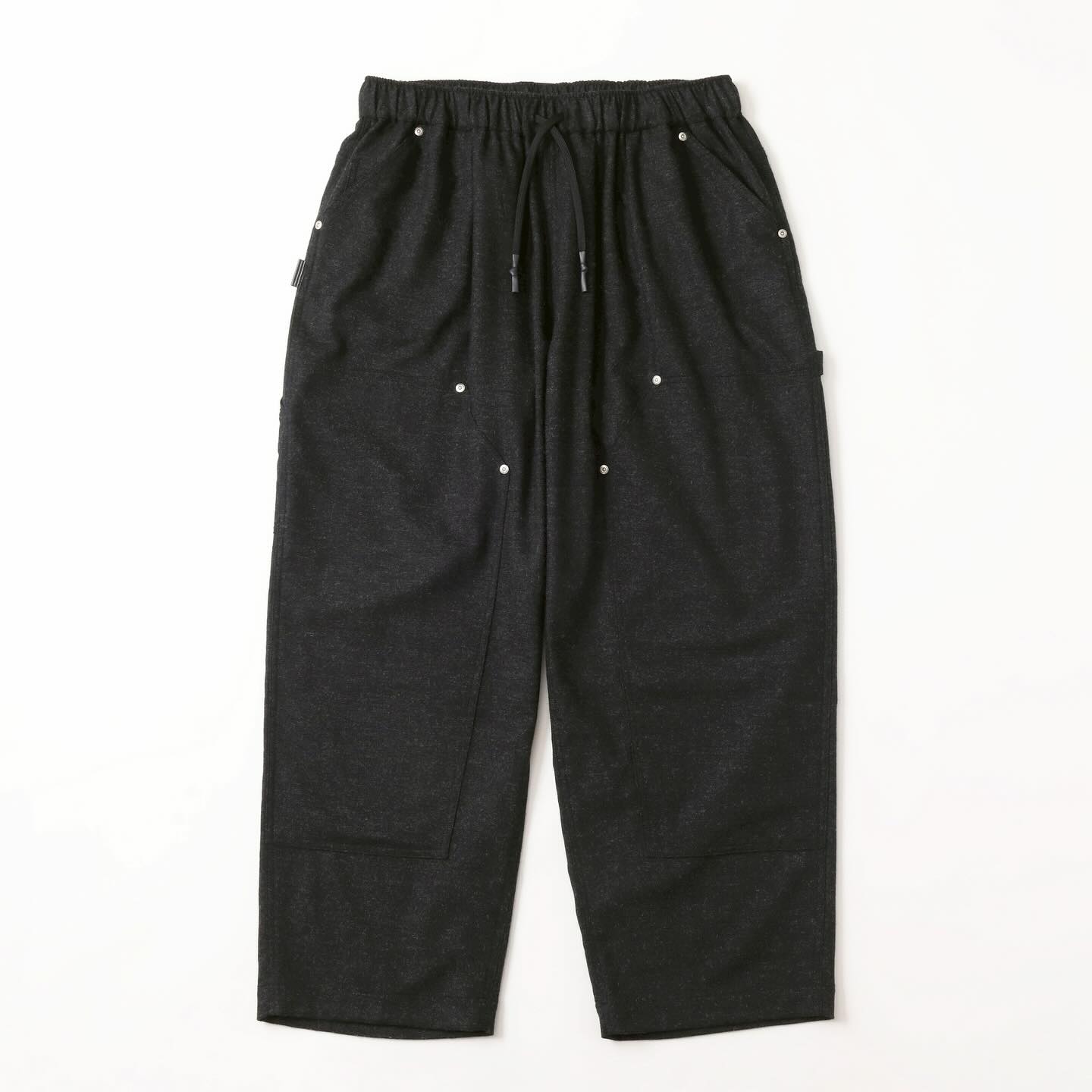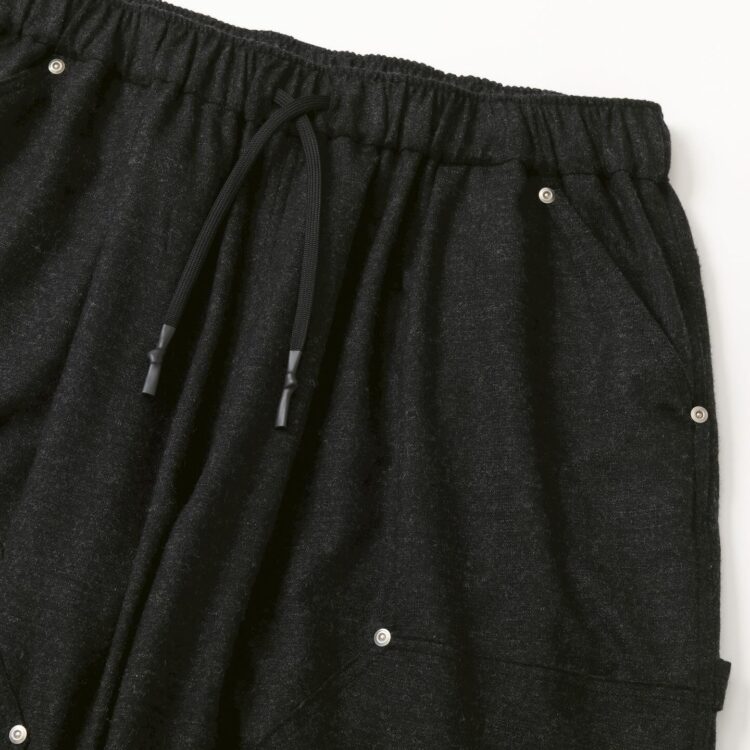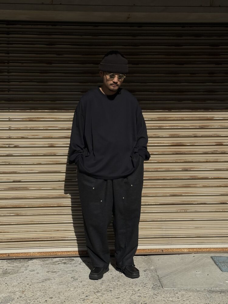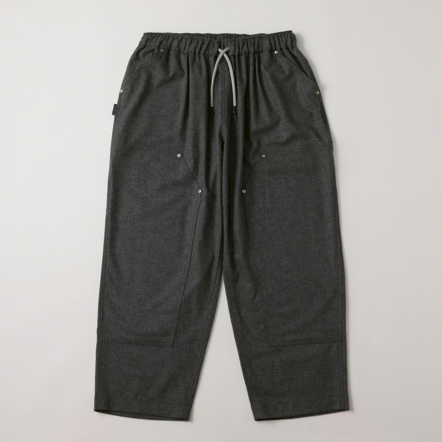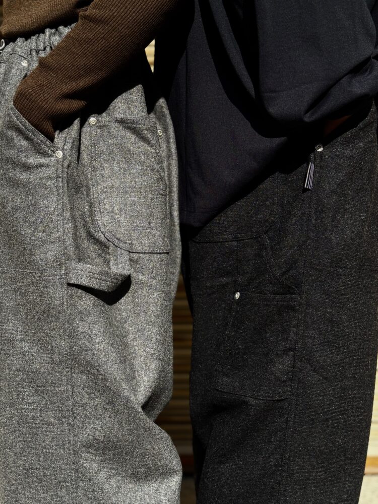 SFC WIDE TAPERED EASY PANTSをさらに腰回りを大きく、裾幅を広く、スーパーワイドなシルエットにアレンジしたバギーウールパンツ。ダブルニー仕様や、ハンマーループ、ツールポケットなどのワークパンツのディテールを取り入れた新型パンツです。素材はカシミヤブレンドのWOOLで、しなやかな良質な肌触りとストレッチ性を持った上質の素材です。