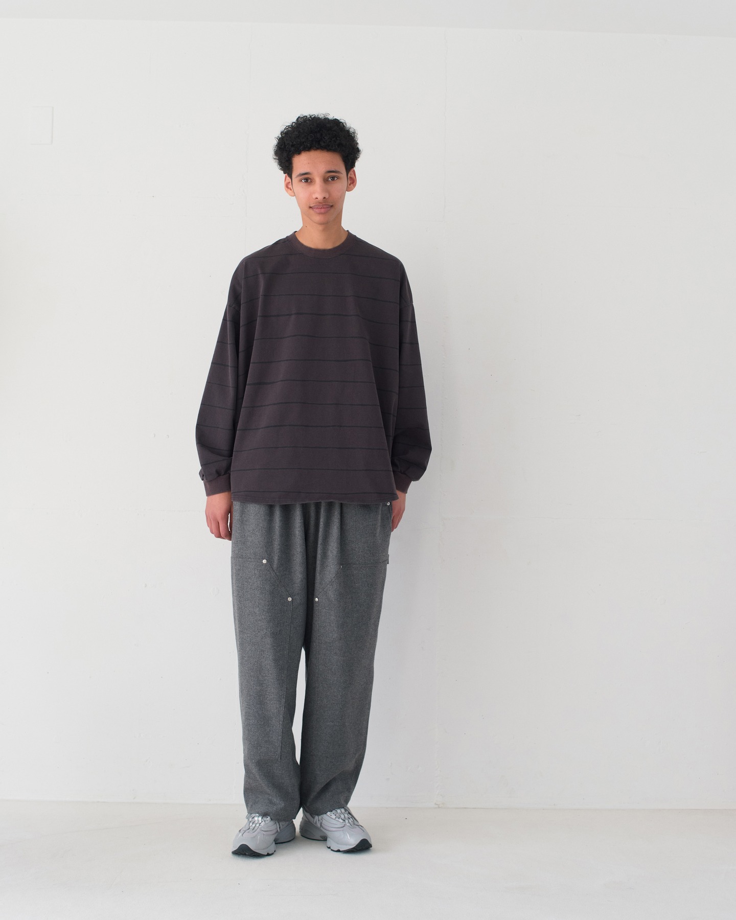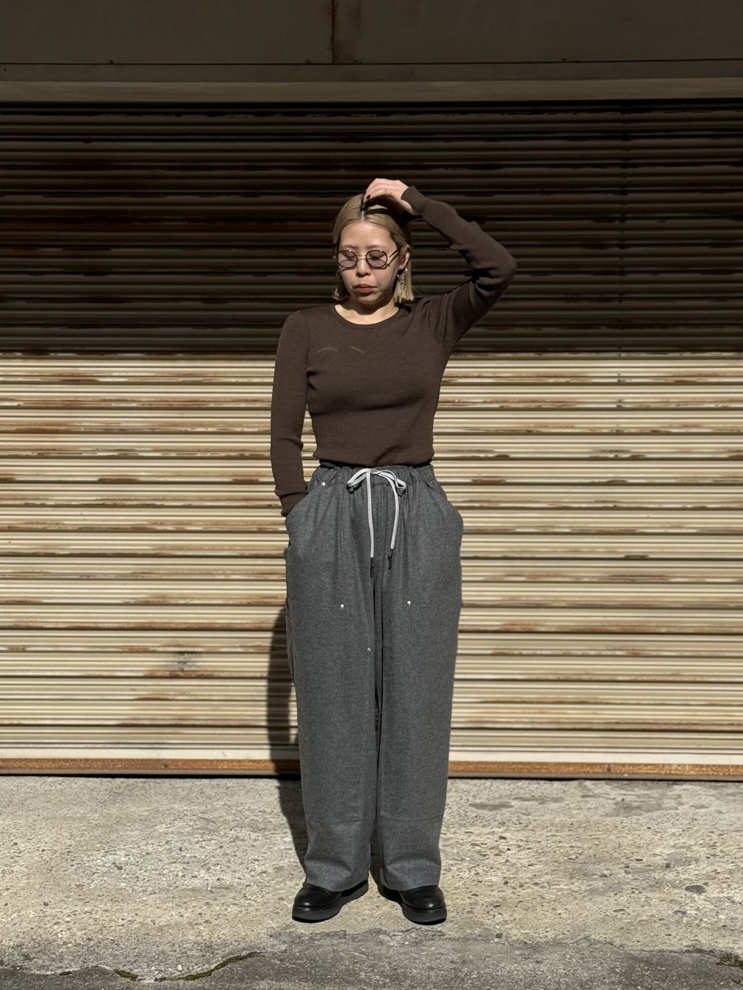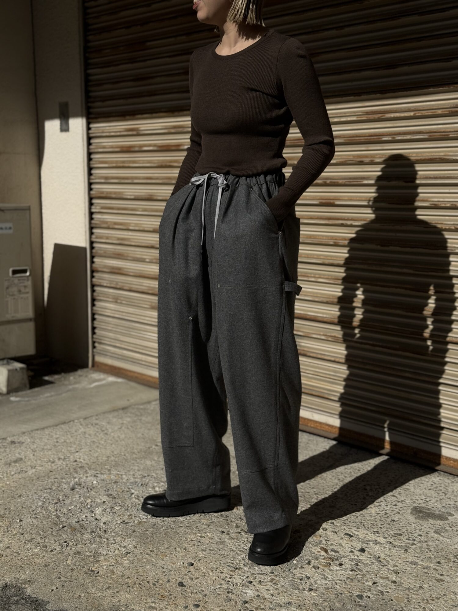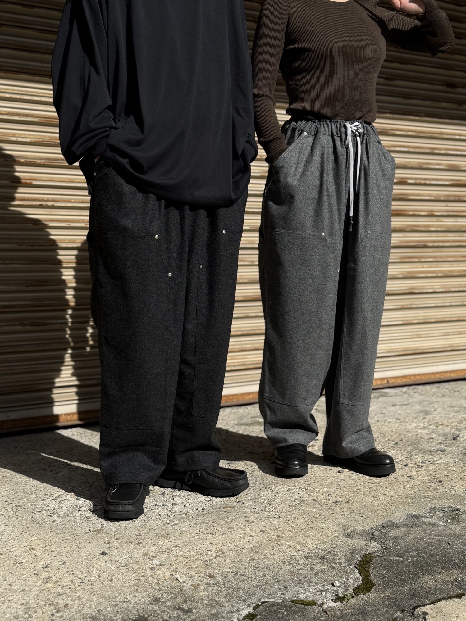 SFC WIDE TAPERED EASY PANTSをさらに腰回りを大きく、裾幅を広く、スーパーワイドなシルエットにアレンジしたバギーウールパンツ。ダブルニー仕様や、ハンマーループ、ツールポケットなどのワークパンツのディテールを取り入れた新型パンツです。素材はカシミヤブレンドのWOOLで、しなやかな良質な肌触りとストレッチ性を持った上質の素材です。