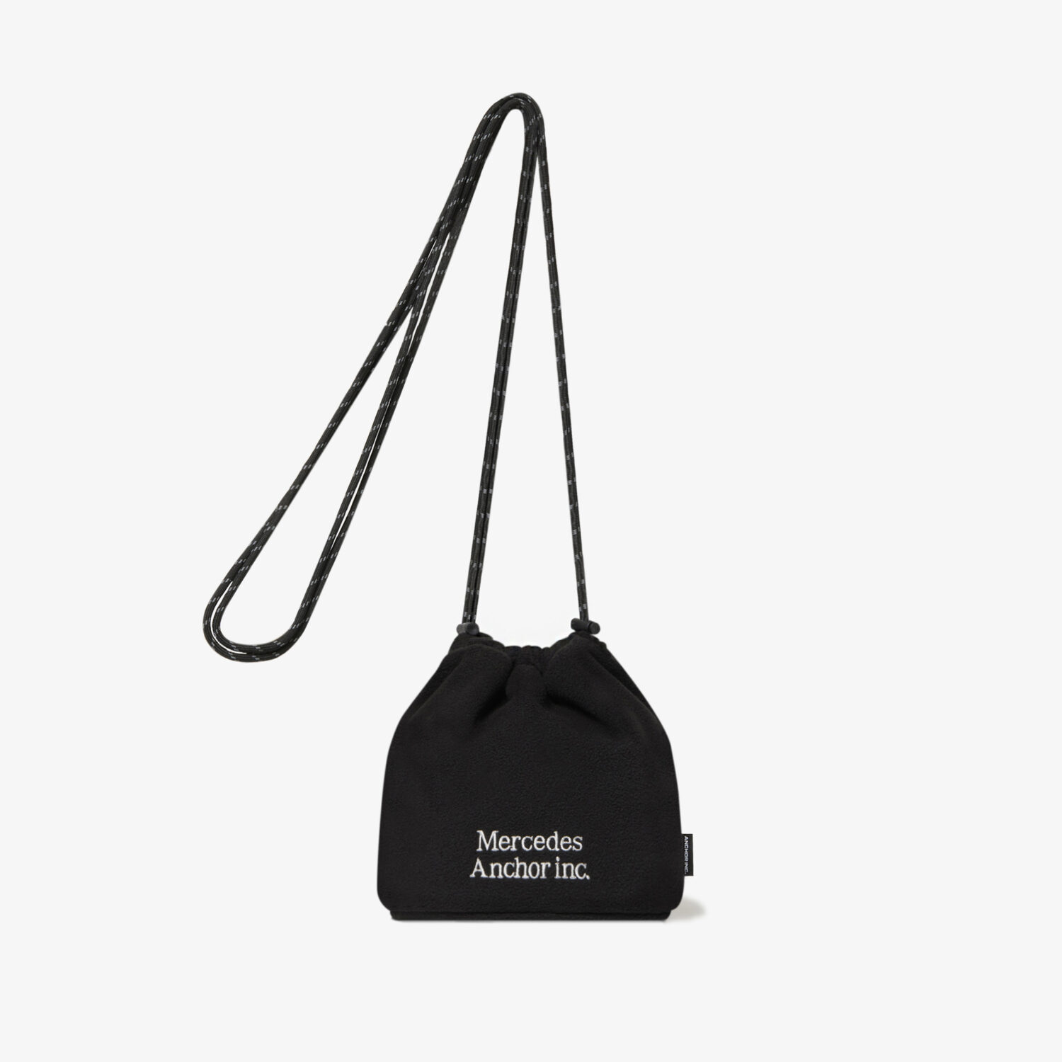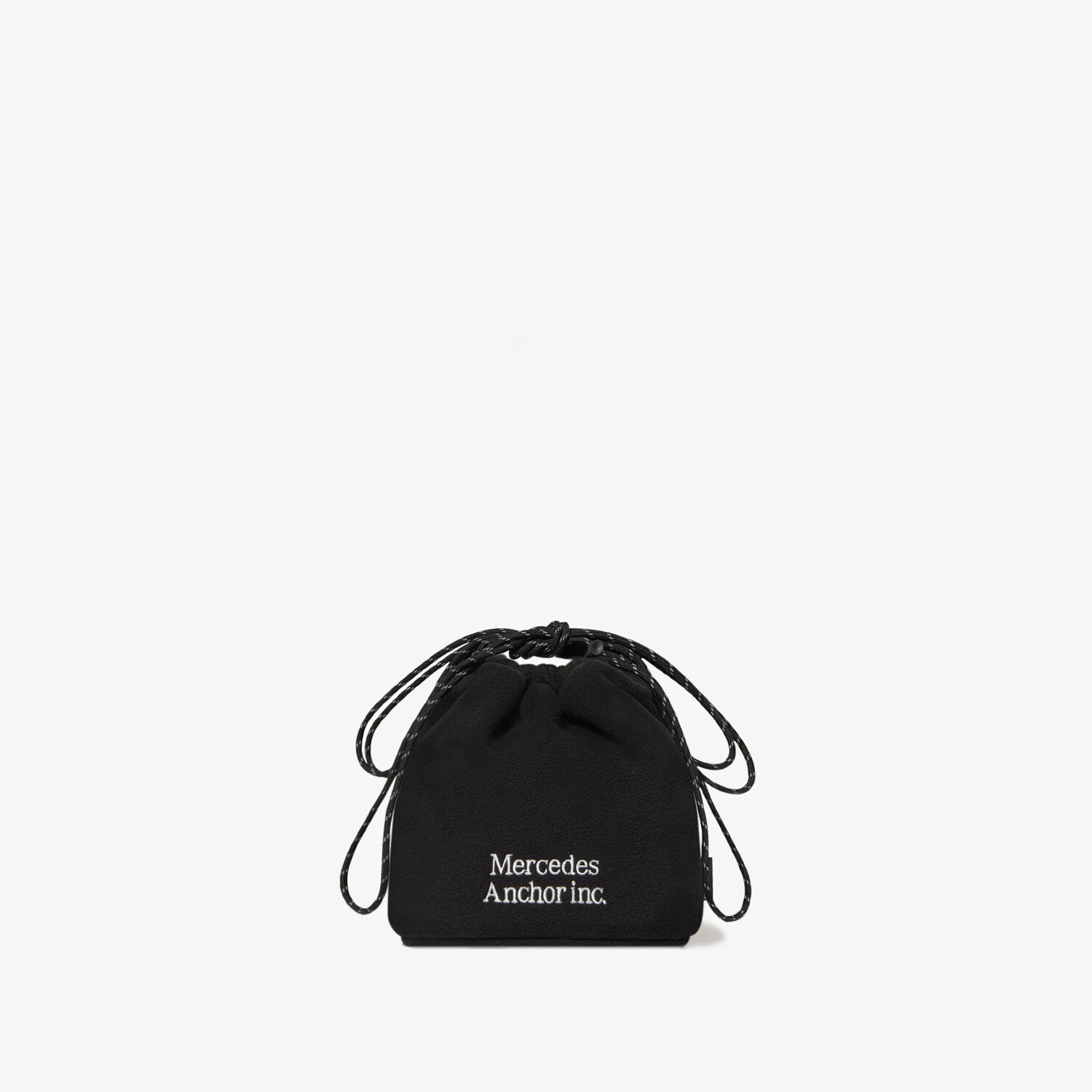 フリース生地を使用したドローストリングバッグ。 フロントにはロゴの刺繍とピスネーム。