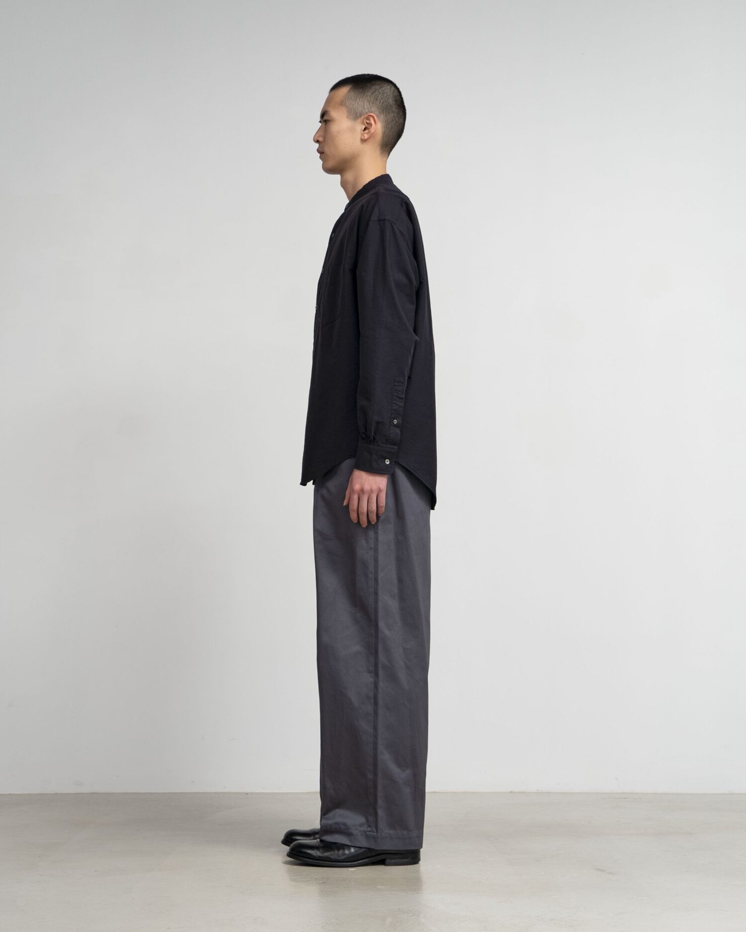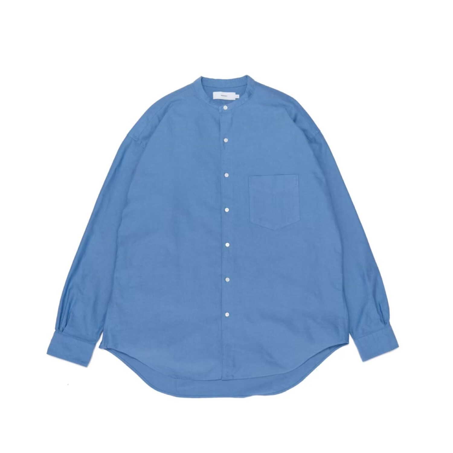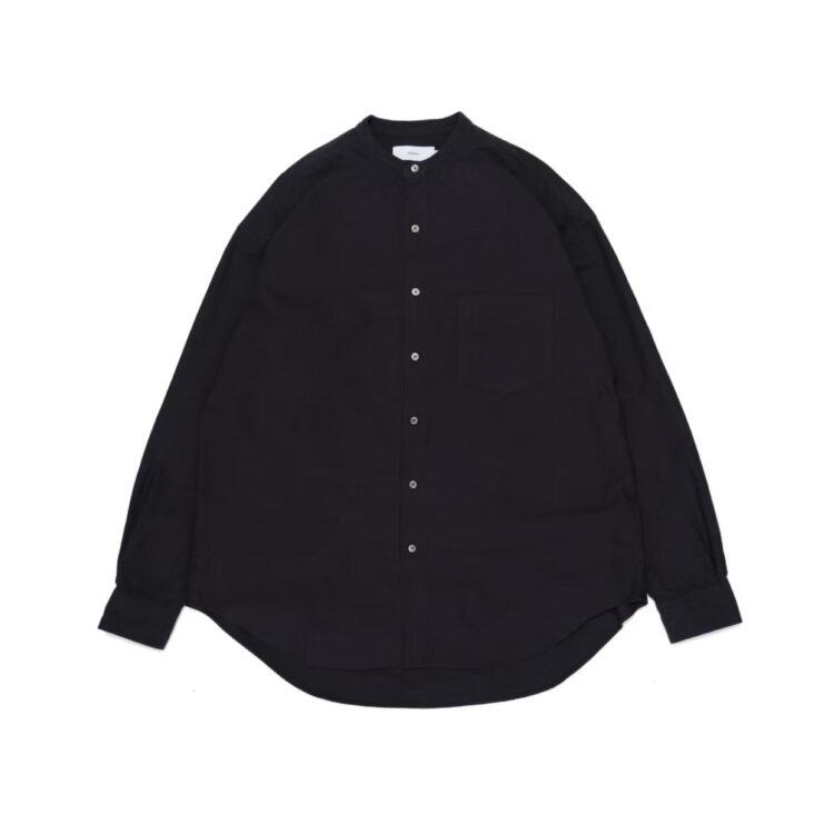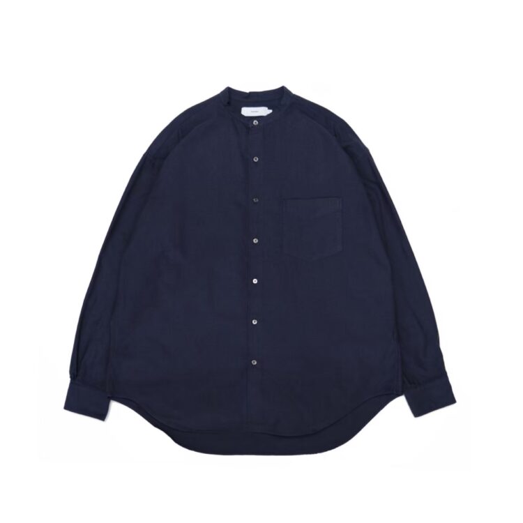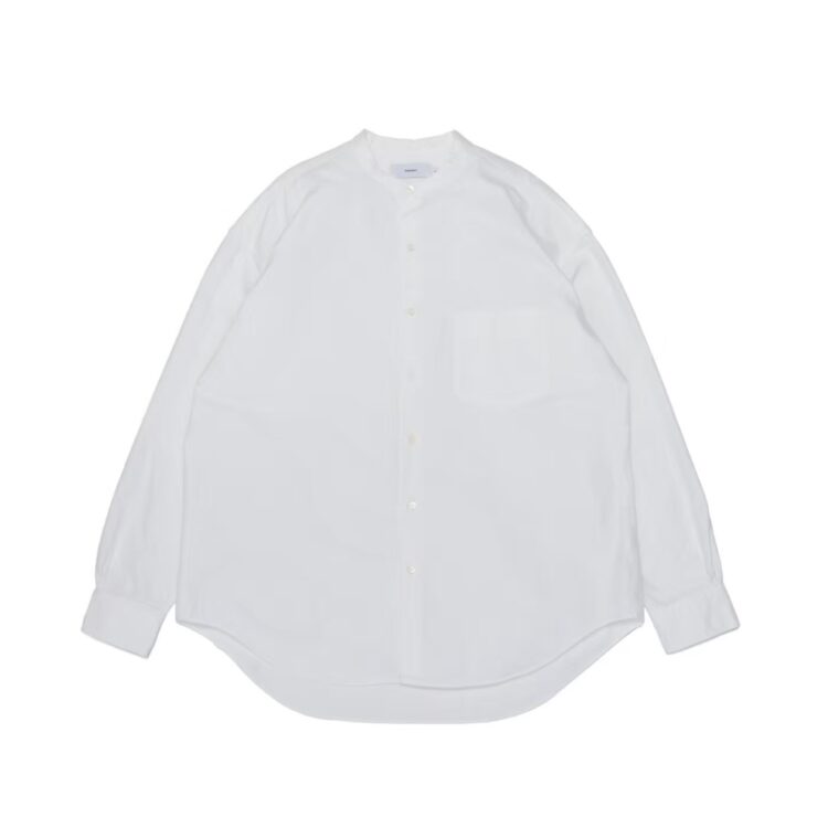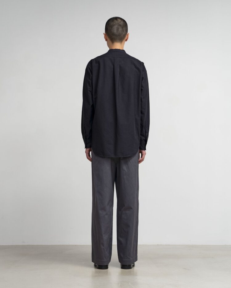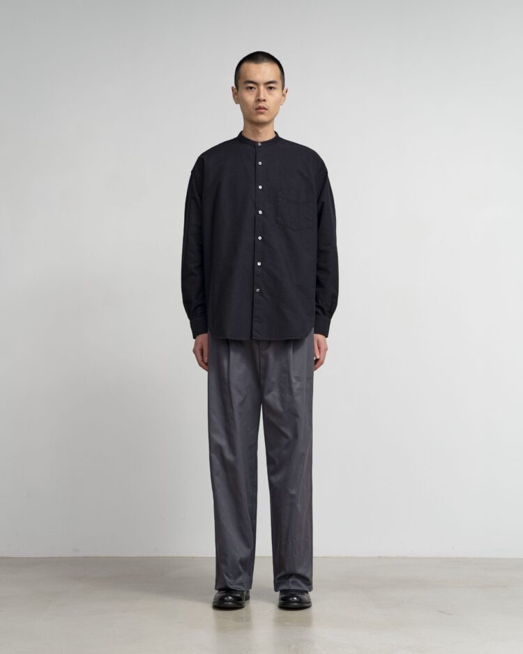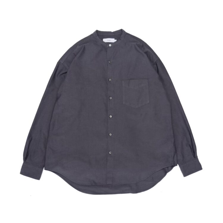 太めの綿糸を使用し肉厚に仕上げたオックスフォード生地。クラシックな印象が強いボックスシルエットの長袖バンドカラーシャツ。