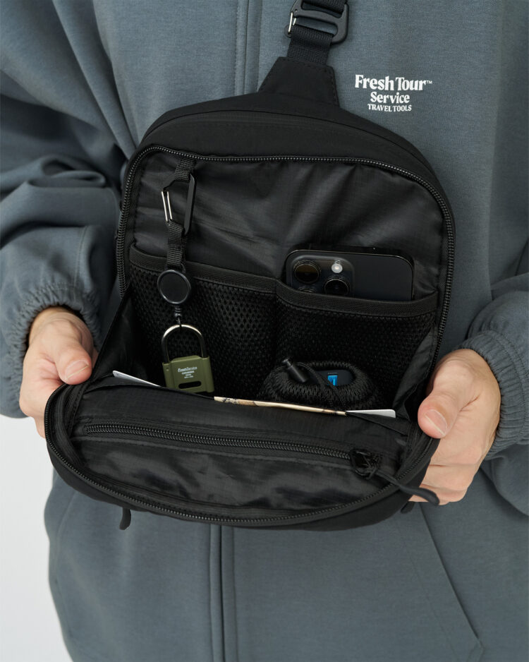 旅を“非日常”ではなく、日常の延長として捉える。都市から自然へ、そしてまた日常へと行き来する。そんな現代のライフスタイルを前提に、旅の快適さを追求したシリーズ『Fresh Tour Service』。多機能なポケットを搭載したスリングバッグ。インナーとアウターの間に、身体にフィットするように縦と横のストラップで装着することで、盗難防止にも役に立ちます。パスポート、携帯電話、キー、財布の機能もあり、貴重品はすべて収納する事が可能。2つのメインポケットがあり、外側のポケットは大きく開いても操作しやすいところで止まるような設計に。