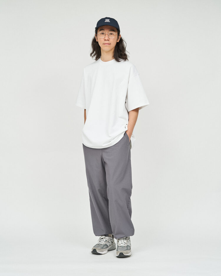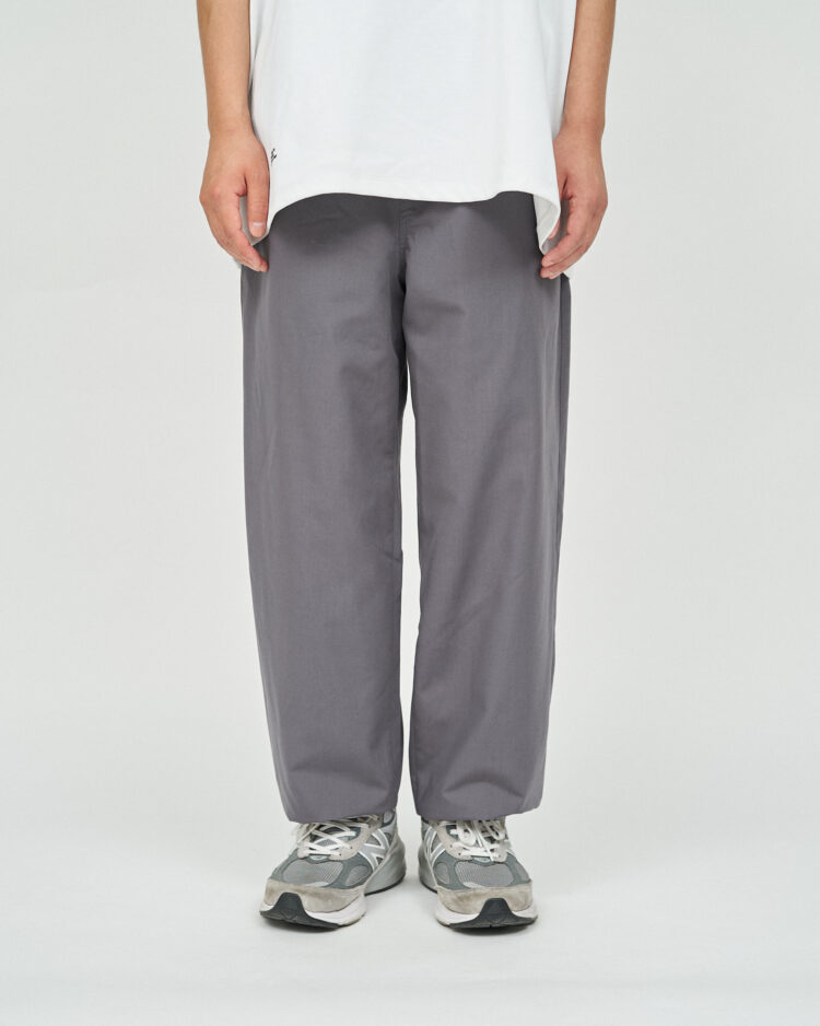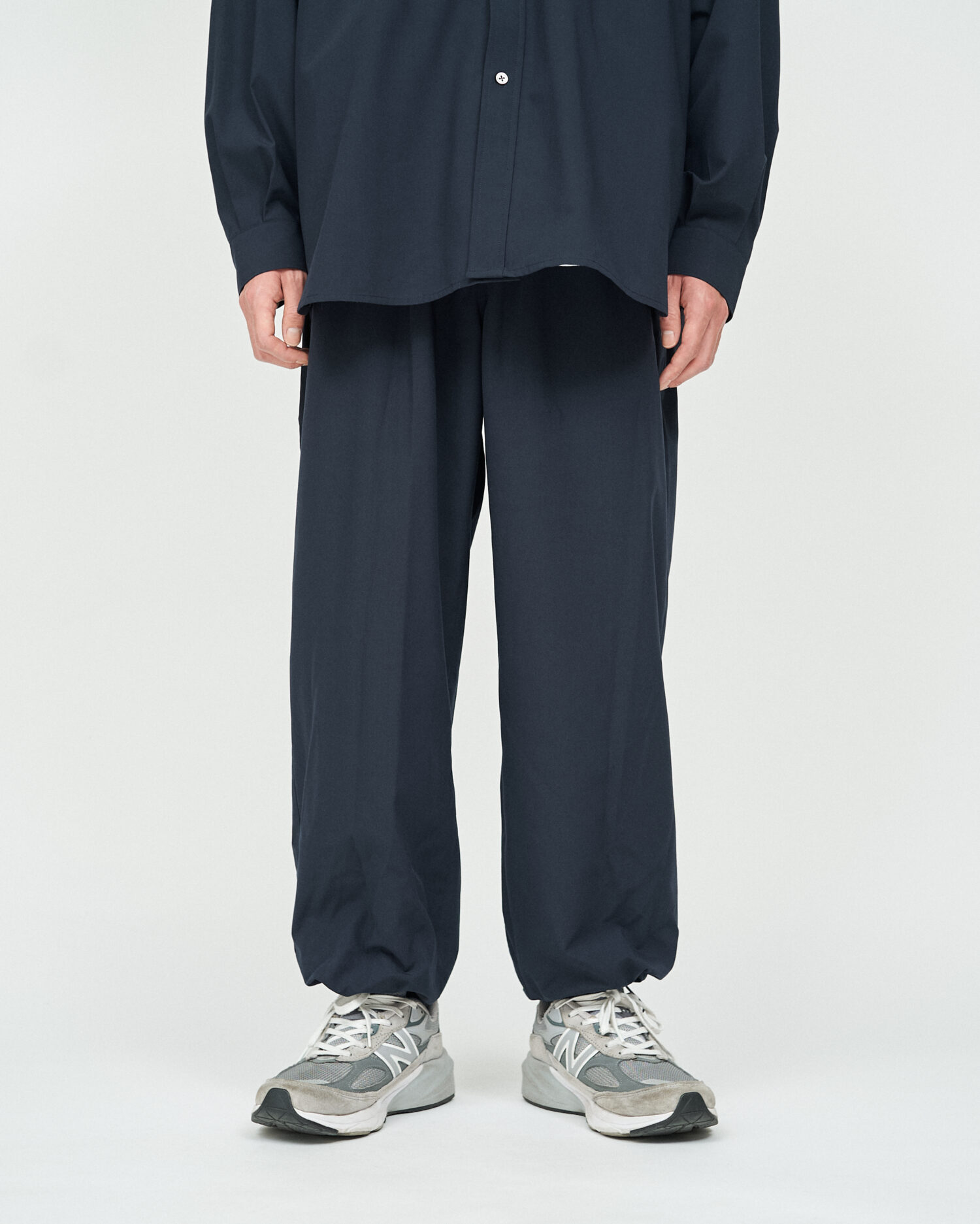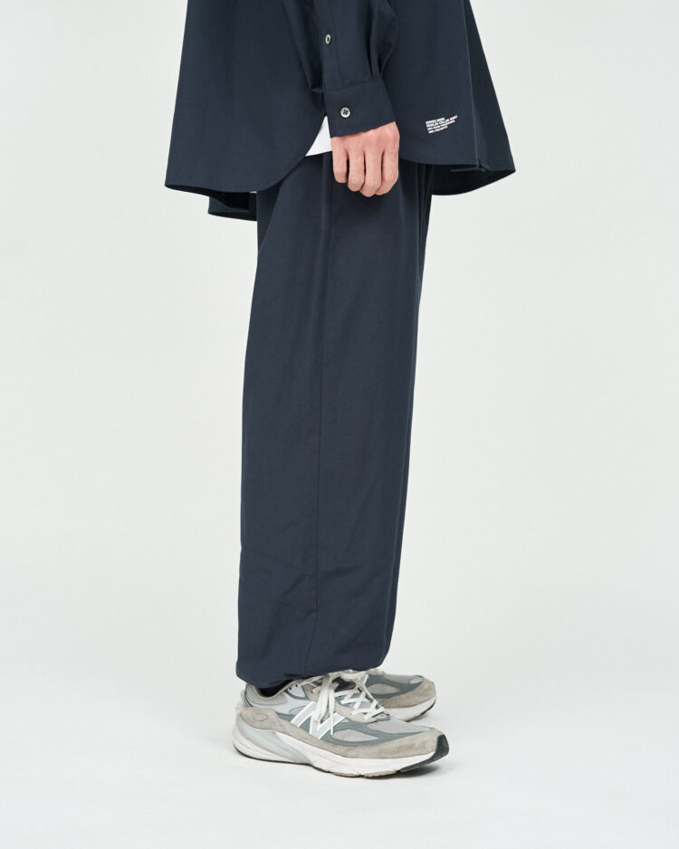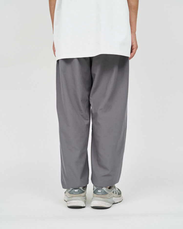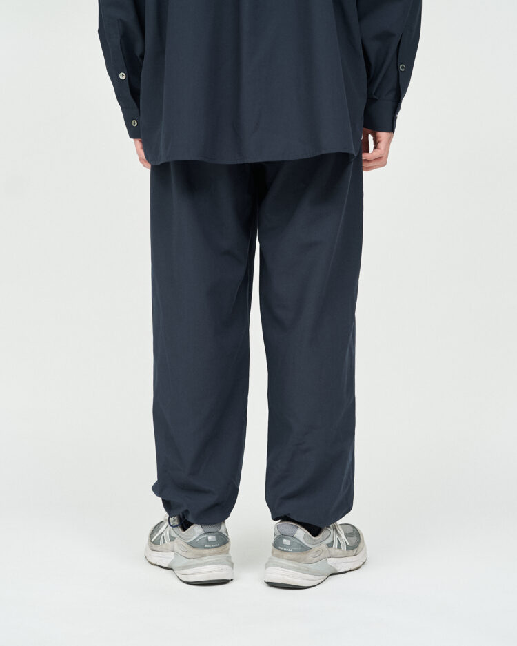 FRESH DRINK SERVICEの厨房でもホールでも映える、飲食店、サービス業に向けたユニフォームパンツ。軽量なポリエステルの平織り素材で、コットンのようなブラッシュ仕上げとマットな仕上がりが特徴。撥水性があり、汚れがつきにくく落としやすい。ゆったりとしたワイドフィットでありながら、裾には好みのシルエットに調整したり、作業を妨げないためのドローコードを備えている。