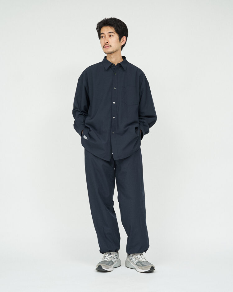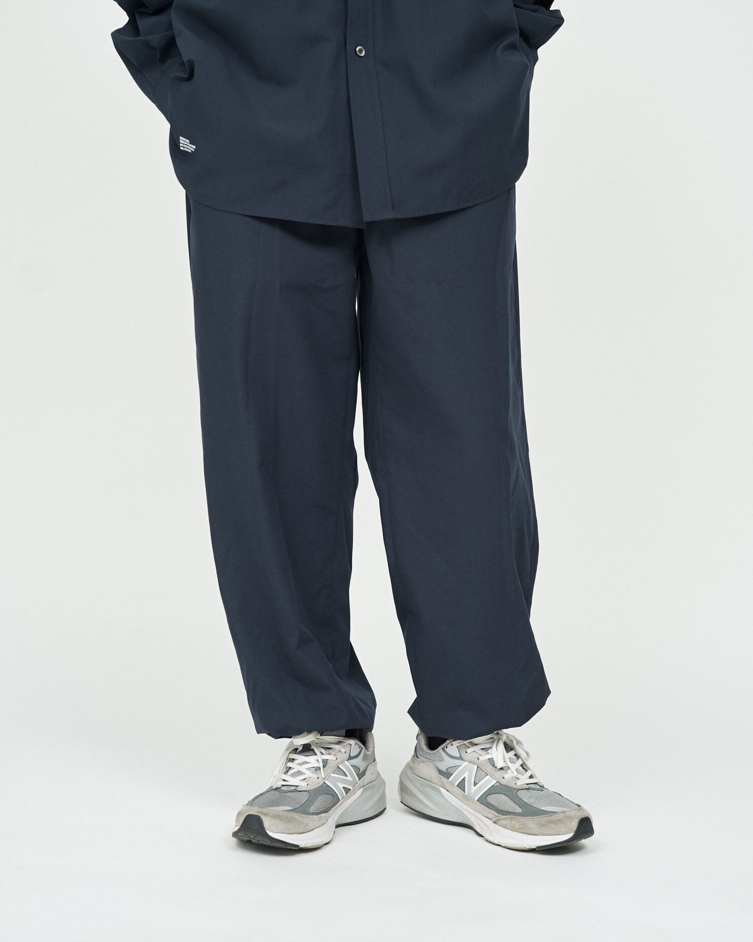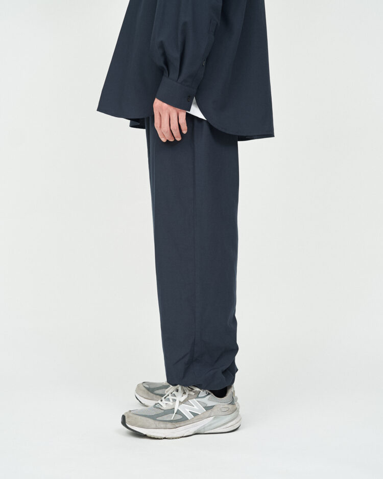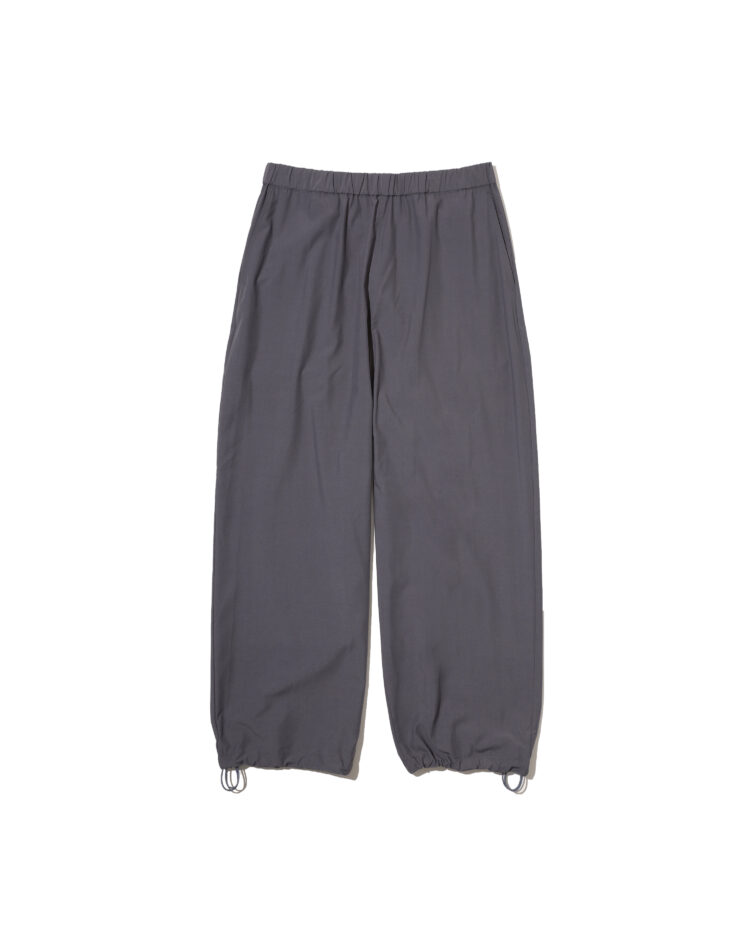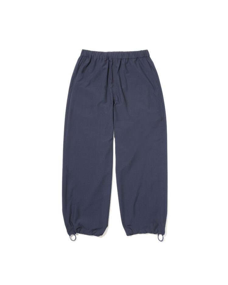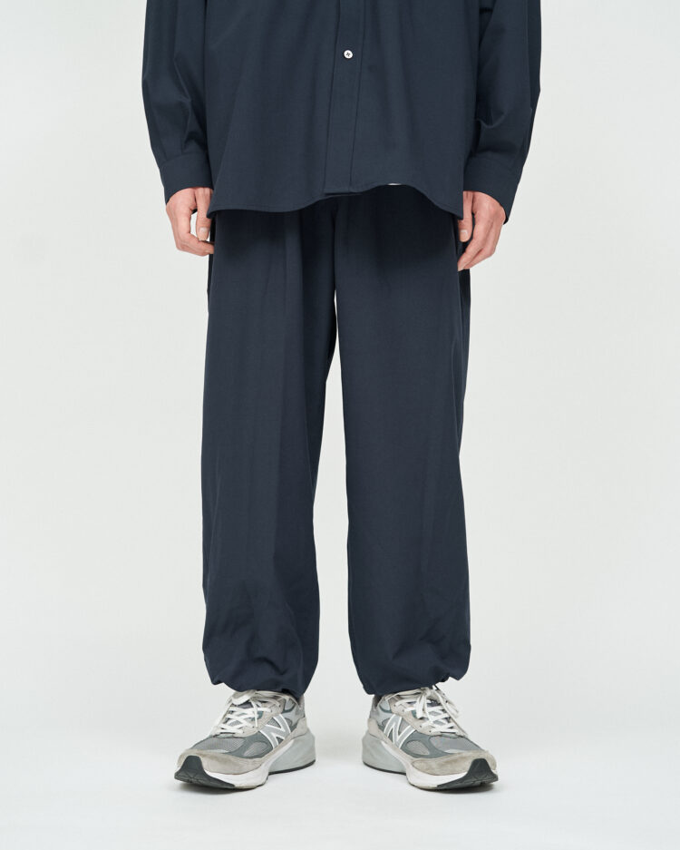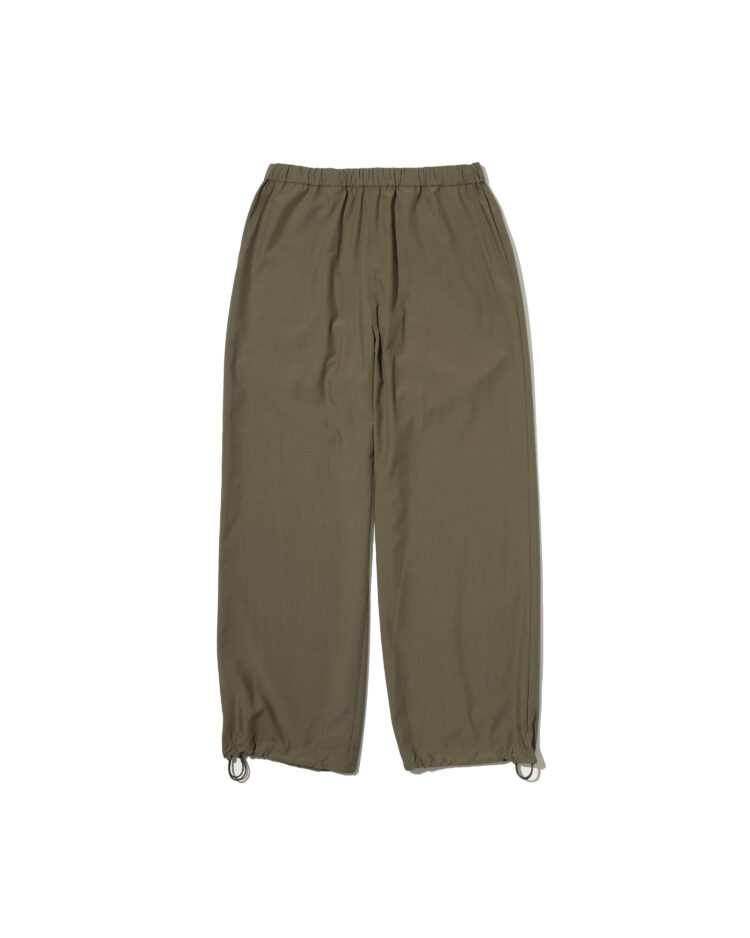 FRESH DRINK SERVICEの厨房でもホールでも映える、飲食店、サービス業に向けたユニフォームパンツ。軽量なポリエステルの平織り素材で、コットンのようなブラッシュ仕上げとマットな仕上がりが特徴。撥水性があり、汚れがつきにくく落としやすい。ゆったりとしたワイドフィットでありながら、裾には好みのシルエットに調整したり、作業を妨げないためのドローコードを備えている。