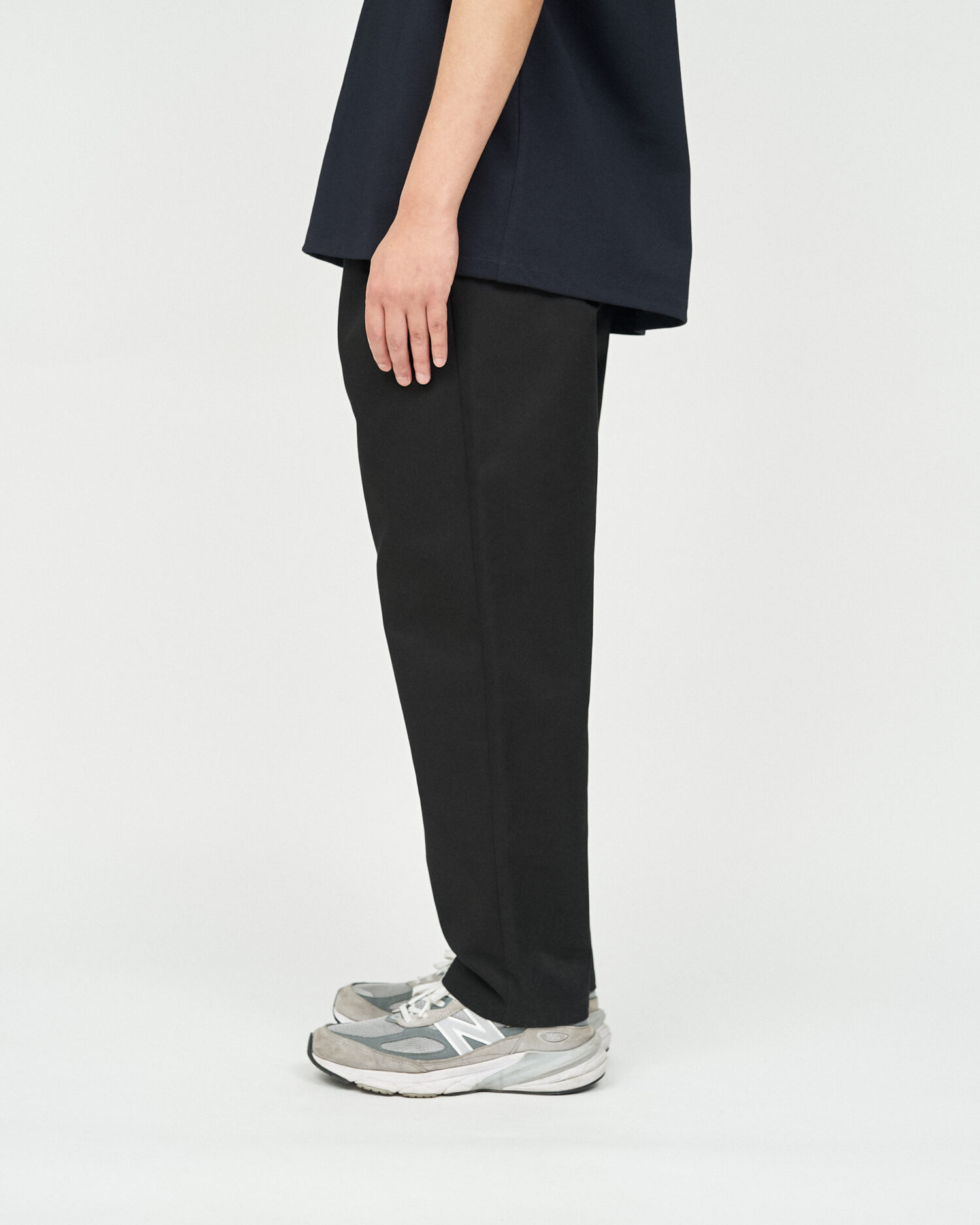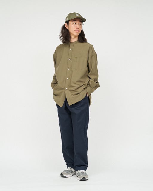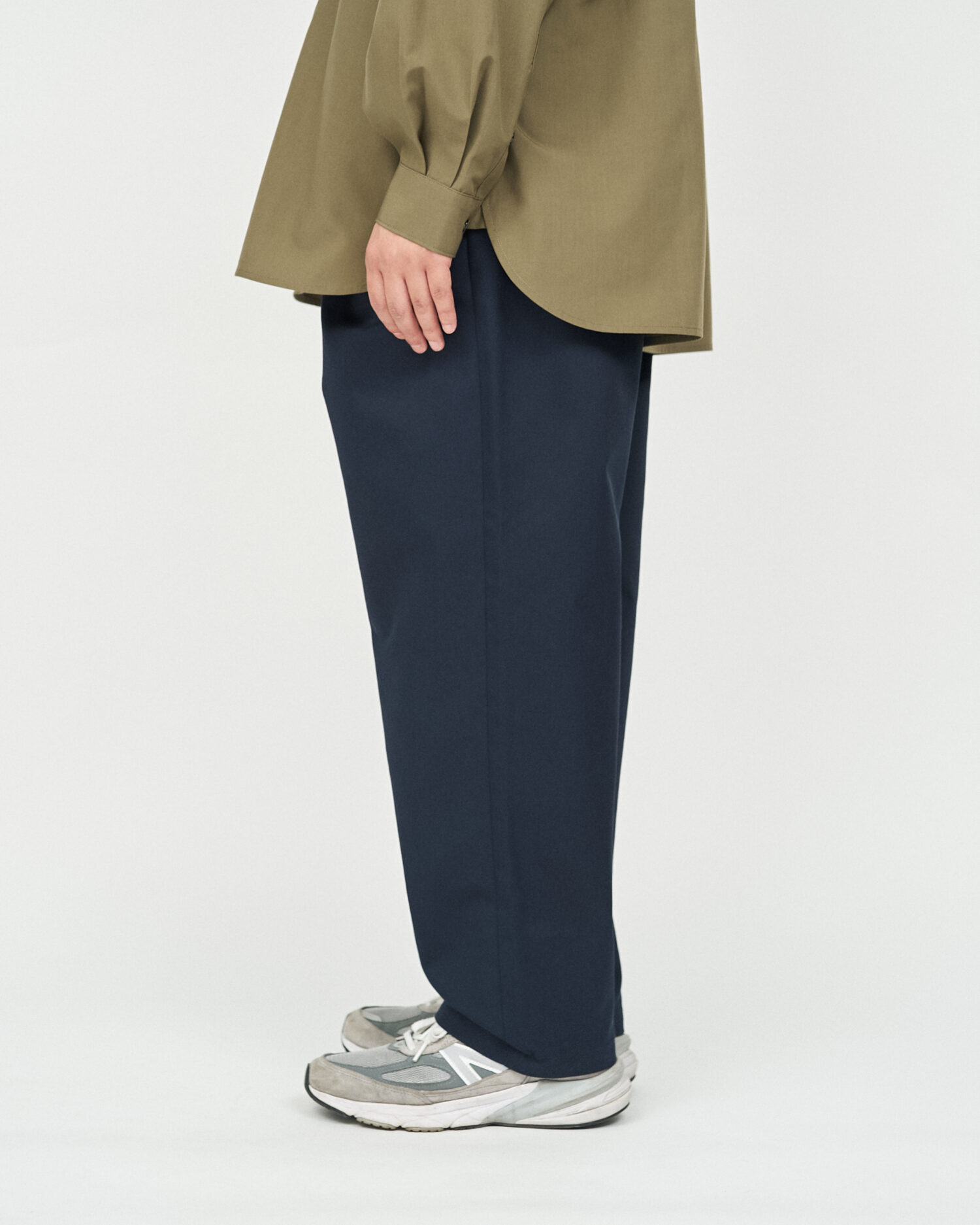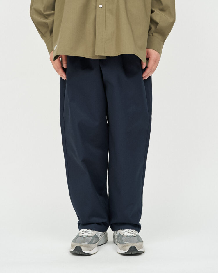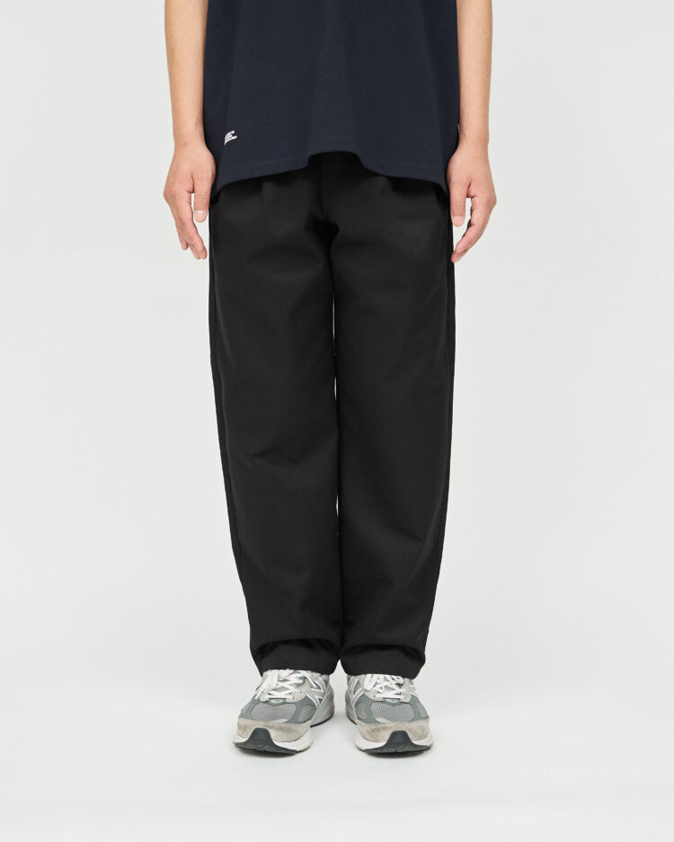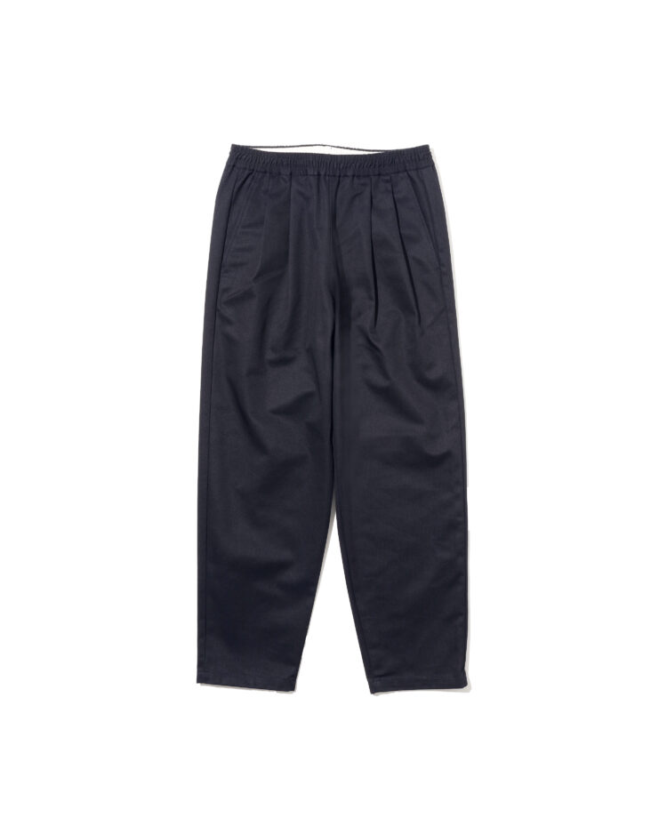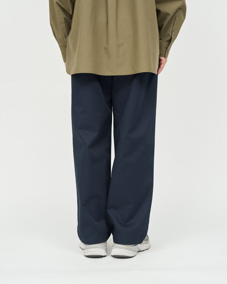 FRESH DRINK SERVICEの厨房でもホールでも映える、飲食店、サービス業向けたユニフォームチノパンツ。フロントのタックとウエストにゴムを備ゆったりとしたシルエットが特徴。耐久性があり、しわになりにくく、汚れに強い素材を使用。