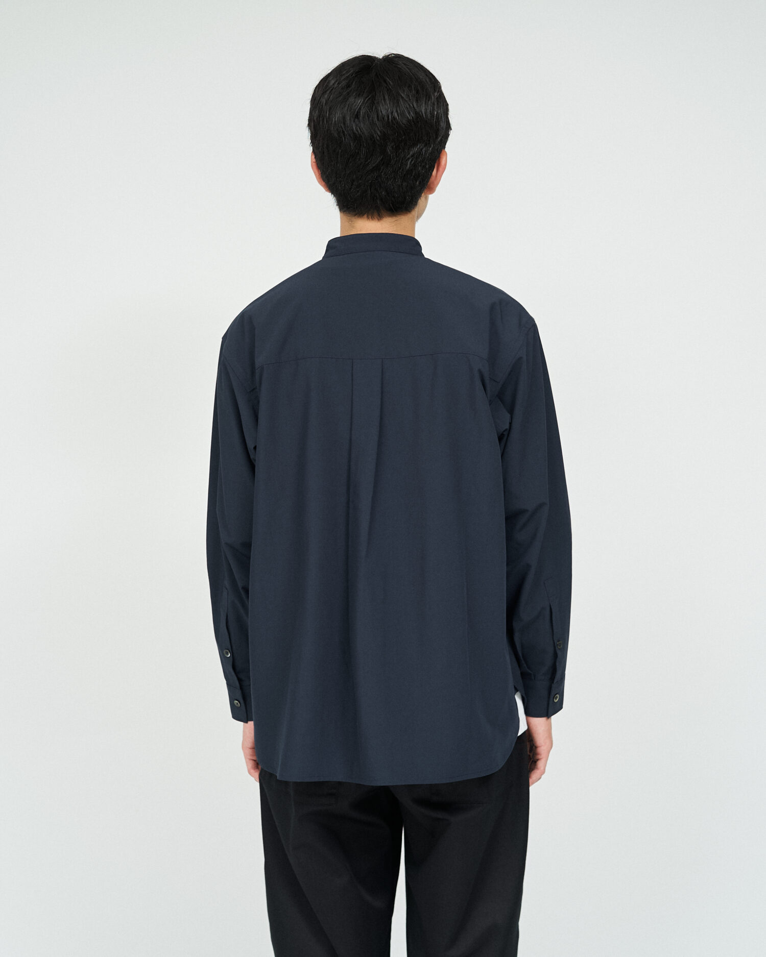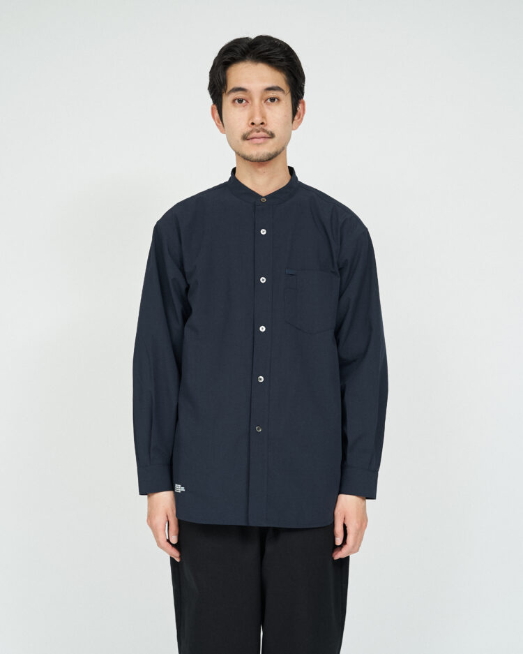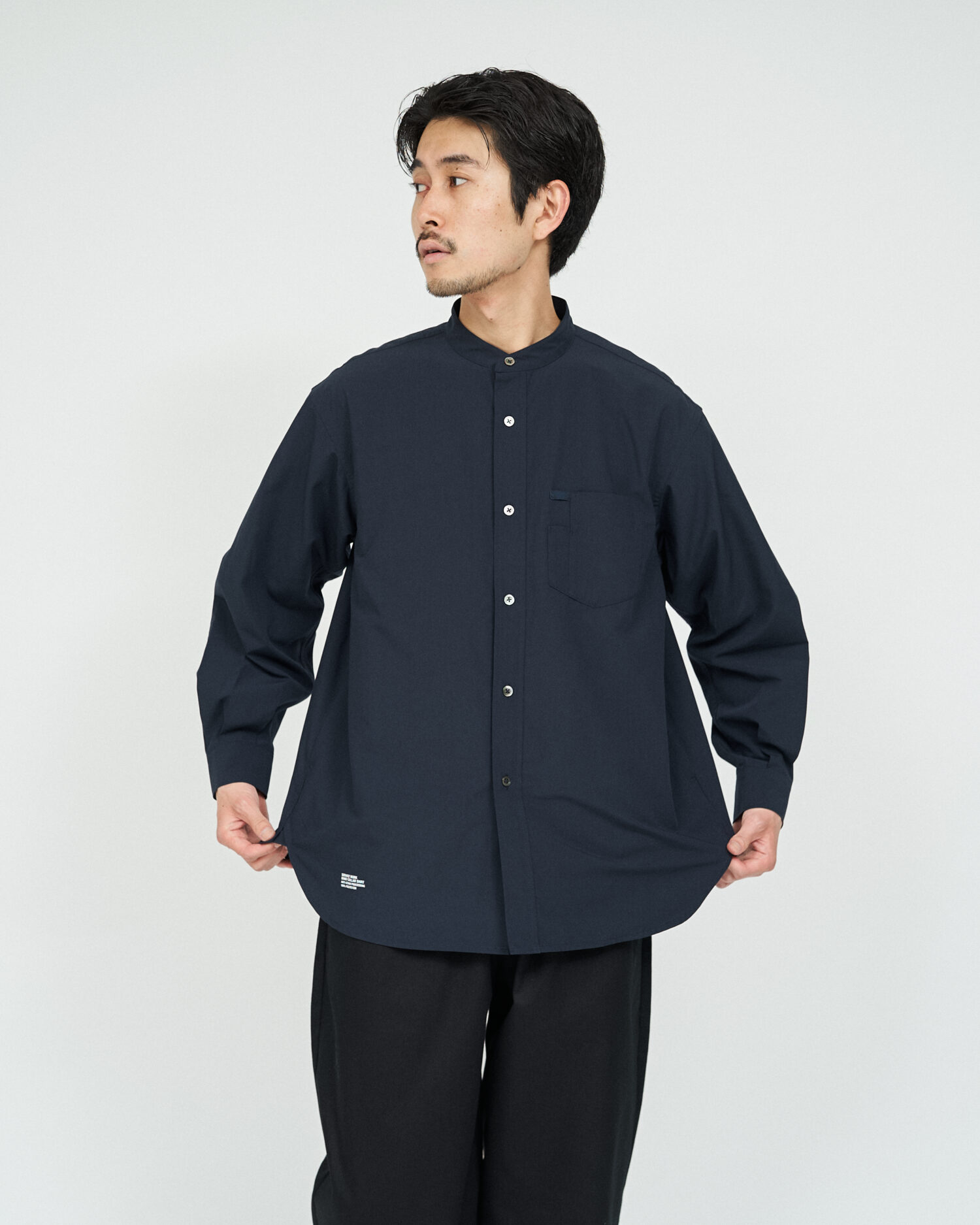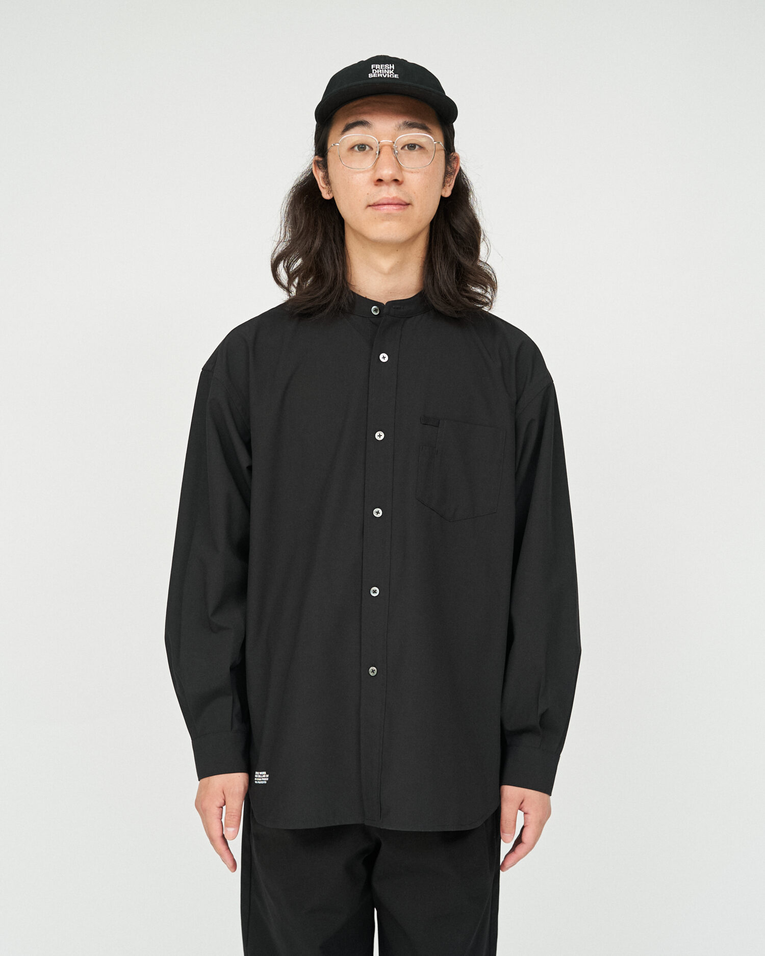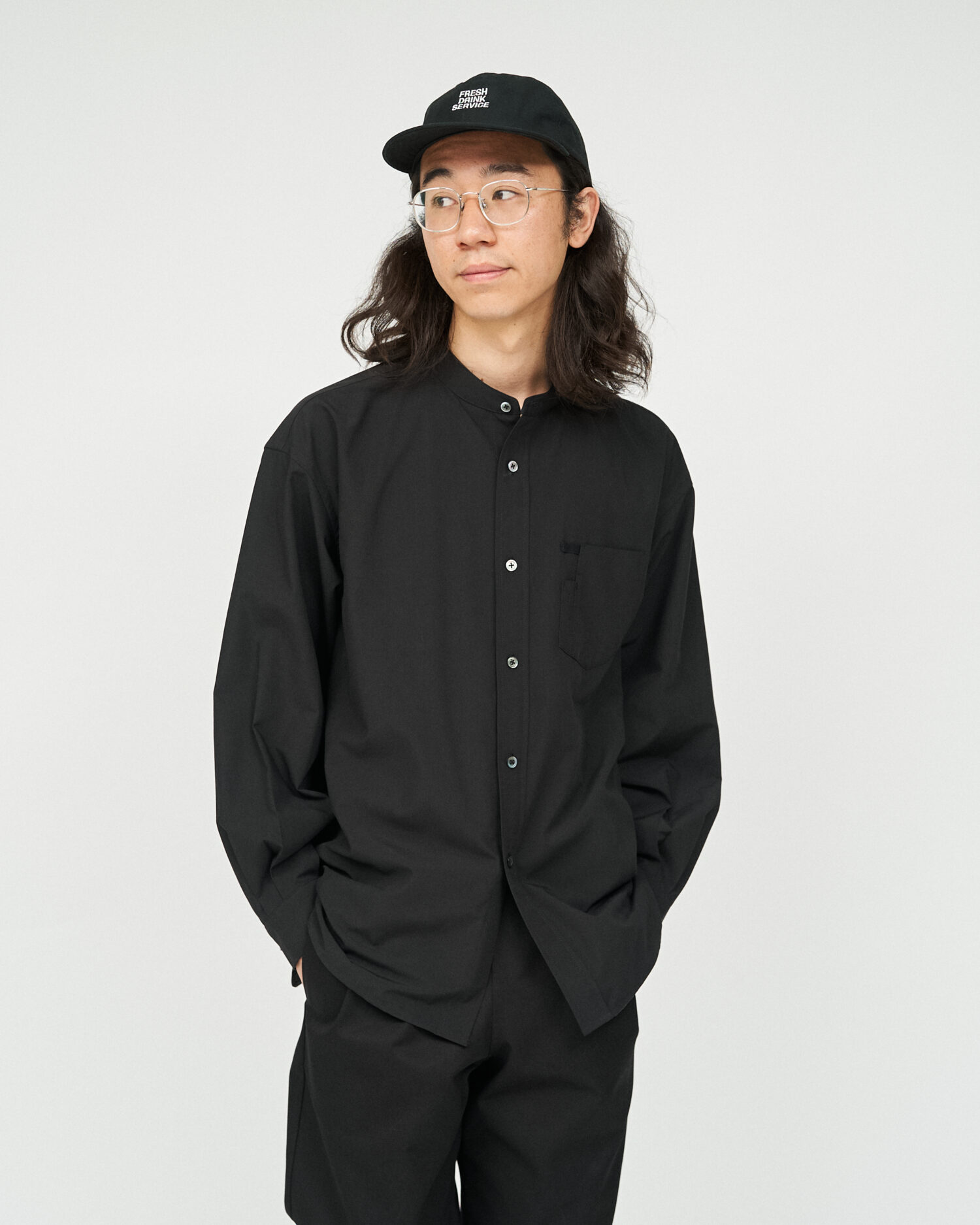 FRESH DRINK SERVICEの厨房でもホールでも映える、飲食店、サービス業に向けたバンドカラーユニフォームシャツ。フロントにはペン刺しが一体となった胸ポケットを配備。軽量なポリエステルの平織り素材で、コットンのようなブラッシュ仕上げとマットな仕上がりが特徴。撥水性があり、汚れがつきにくく落としやすい。