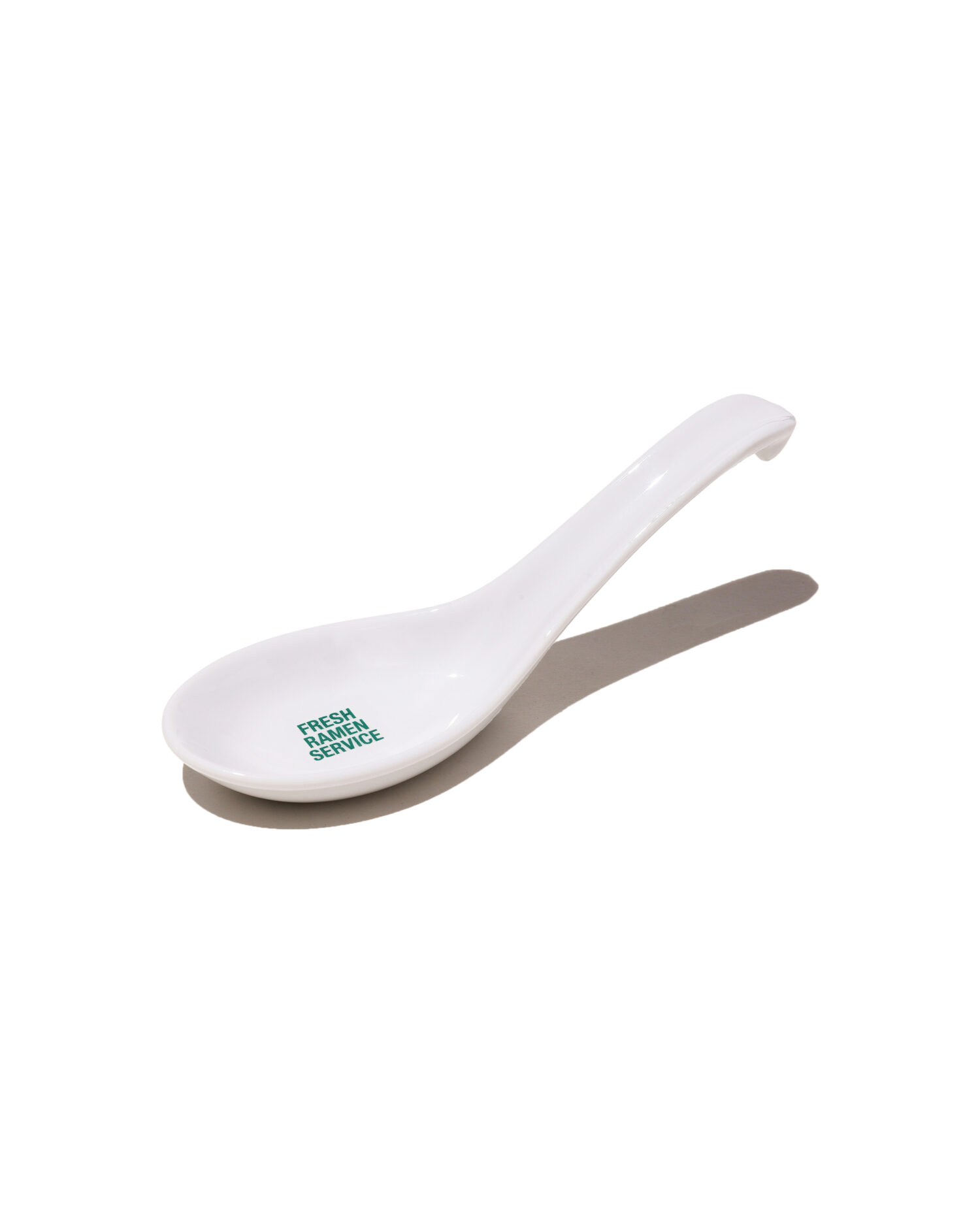 美濃焼のレンゲスプーン。クラシックなフォルムにユニークな要素を加え、シリーズの器と調和するデザイン。内側には「FRESH RAMEN SERVICE」のロゴ入り。サイズは長さ13cm、幅4.5cm。