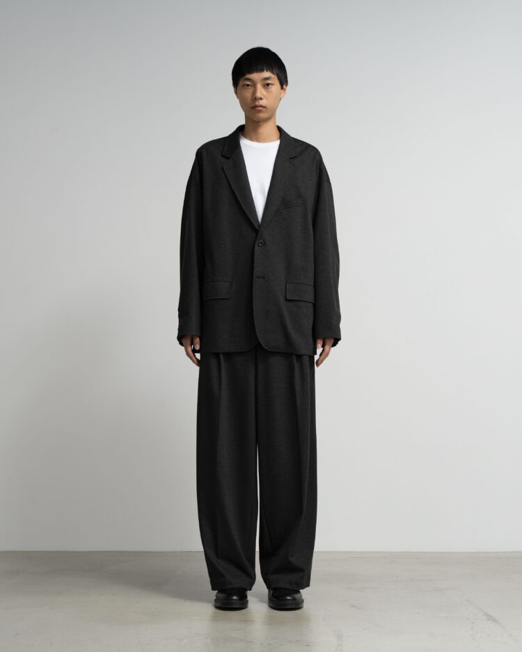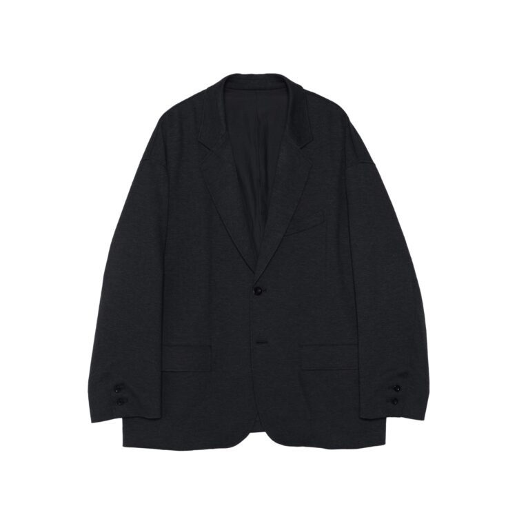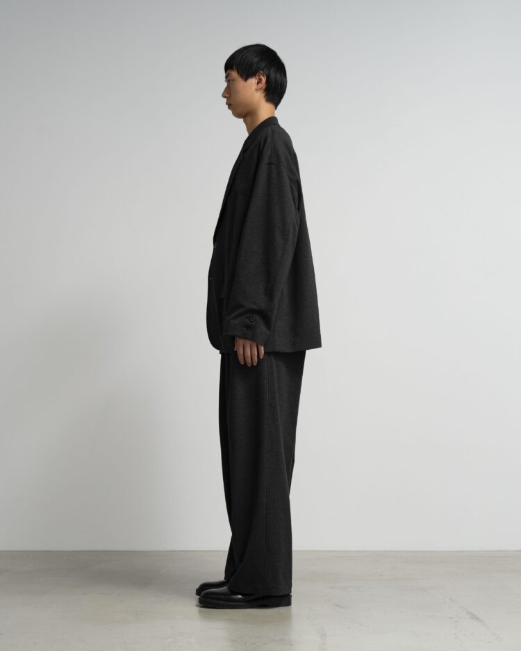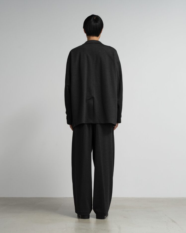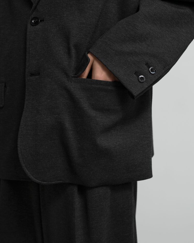 スペイン・バルセロナに拠点を持つSIDOGRAS(シドグラス)社のヴィスコースポンチを使用。布帛のような滑らかなタッチと、ハリがありながら馴染みやすいしなやかさが特徴。ドロップショルダーでボリュームのあるシルエットのジャケット。動きやすくアクティブなスーチングスタイルが楽しめる。