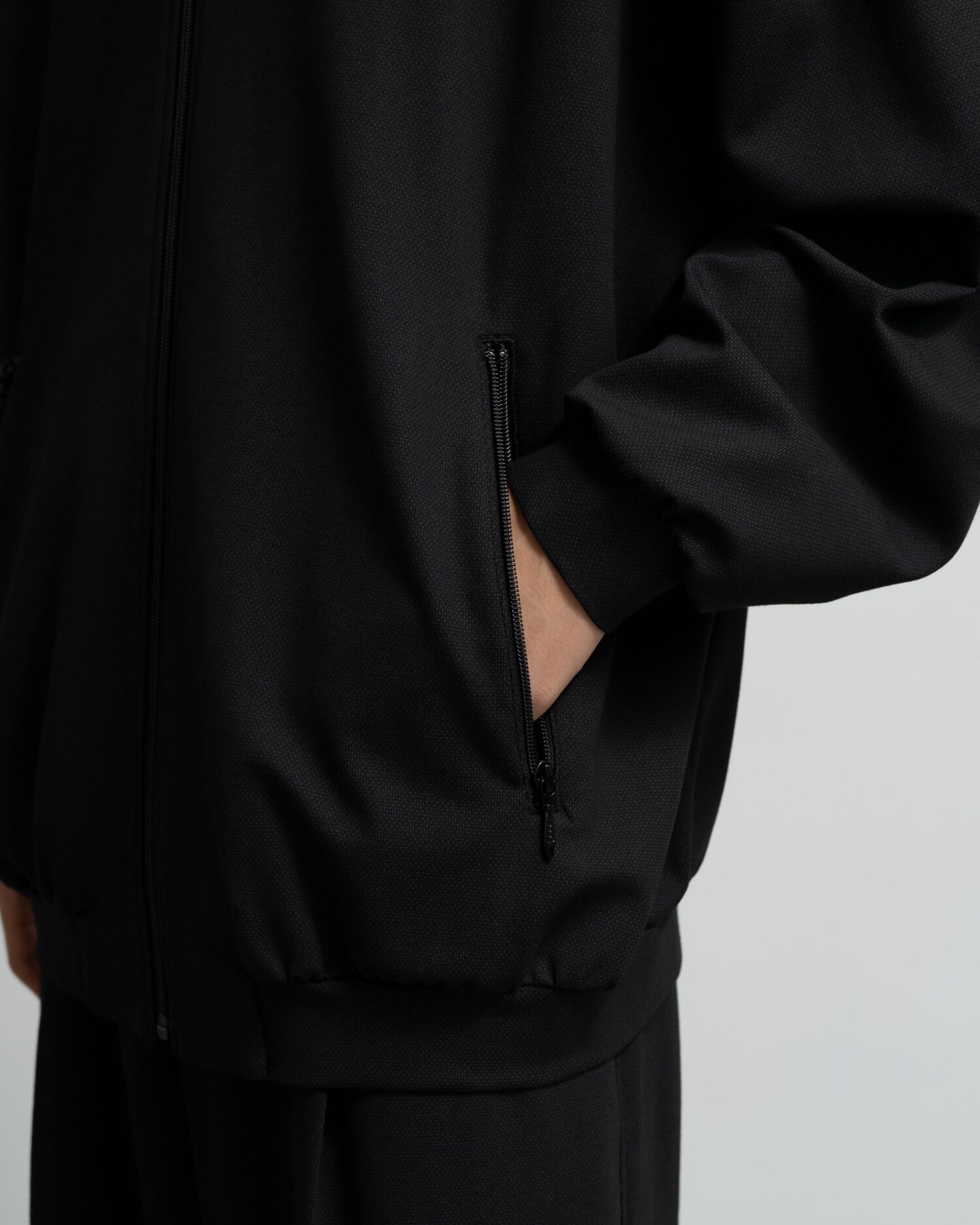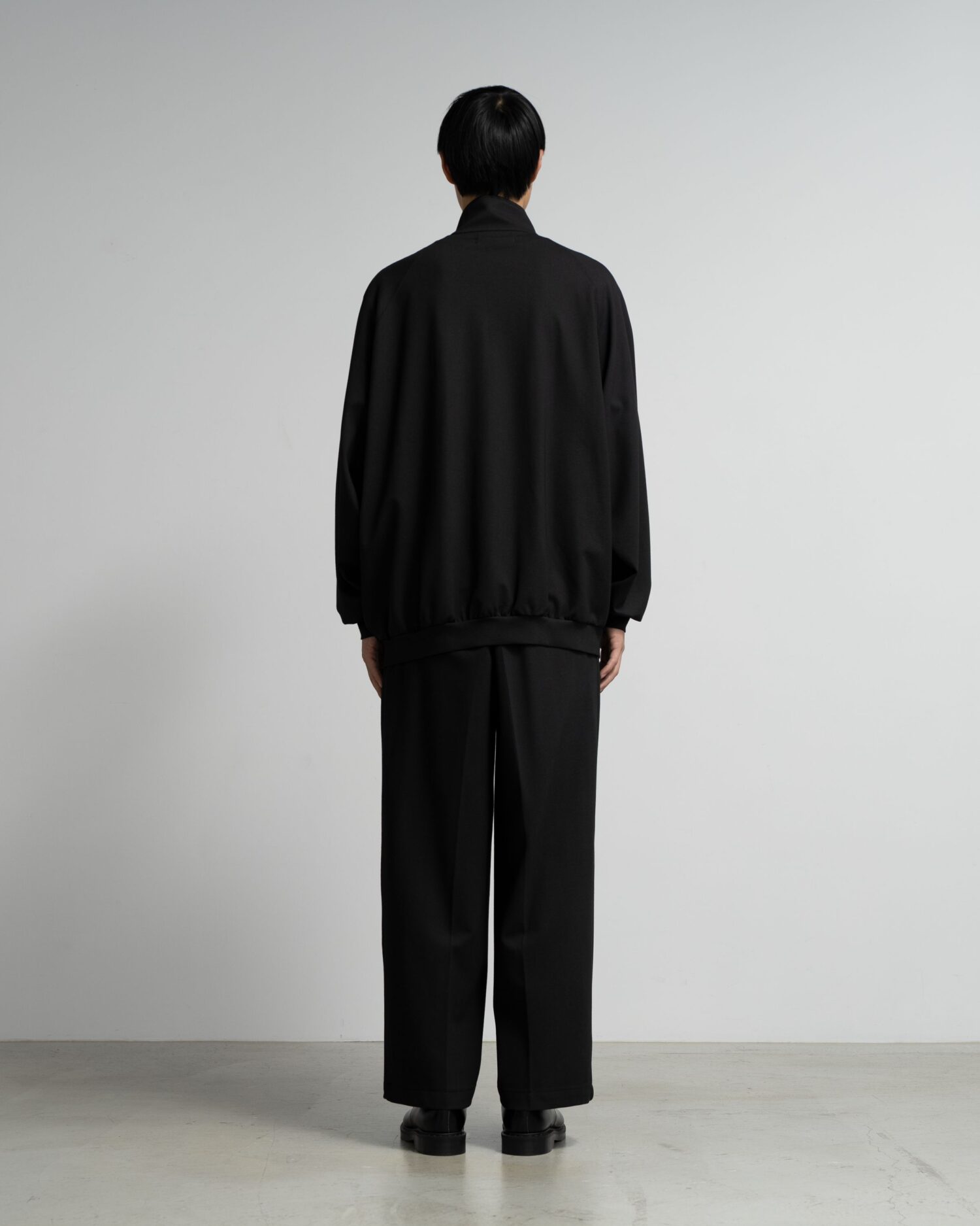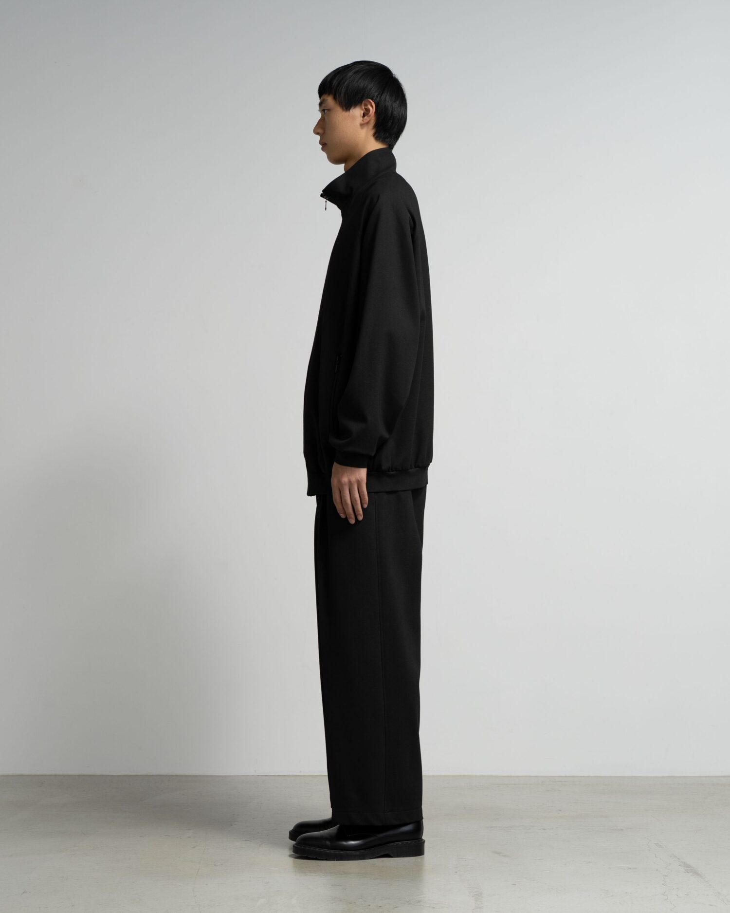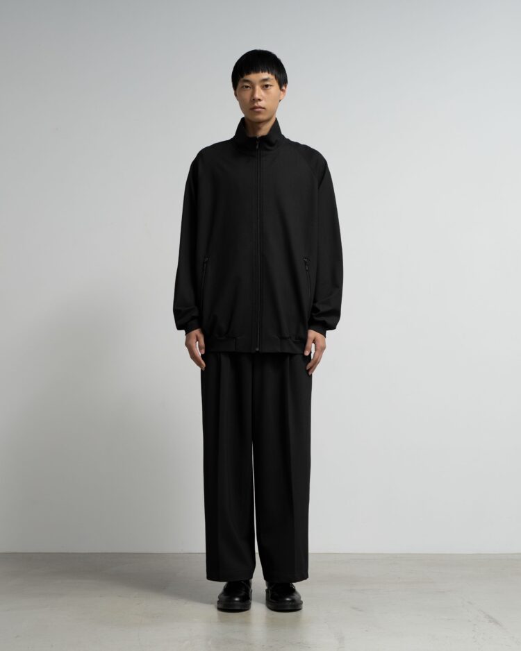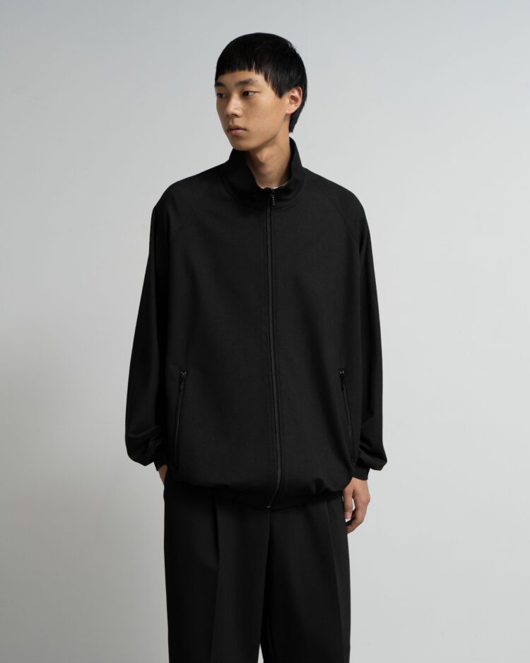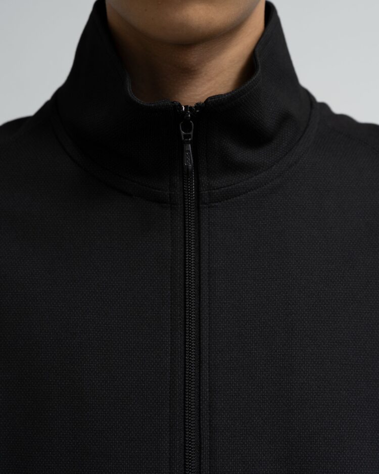 スペイン・バルセロナに拠点を持つSIDOGRAS(シドグラス)社のヴィスコースポンチを使用。布帛のような滑らかなタッチと、ハリがありながら馴染みやすいしなやかさが特徴。スタンドカラーのフルジップ仕様で、すっきりとしたデザイン。