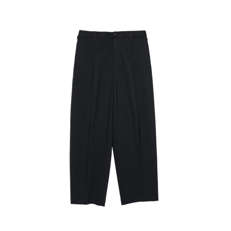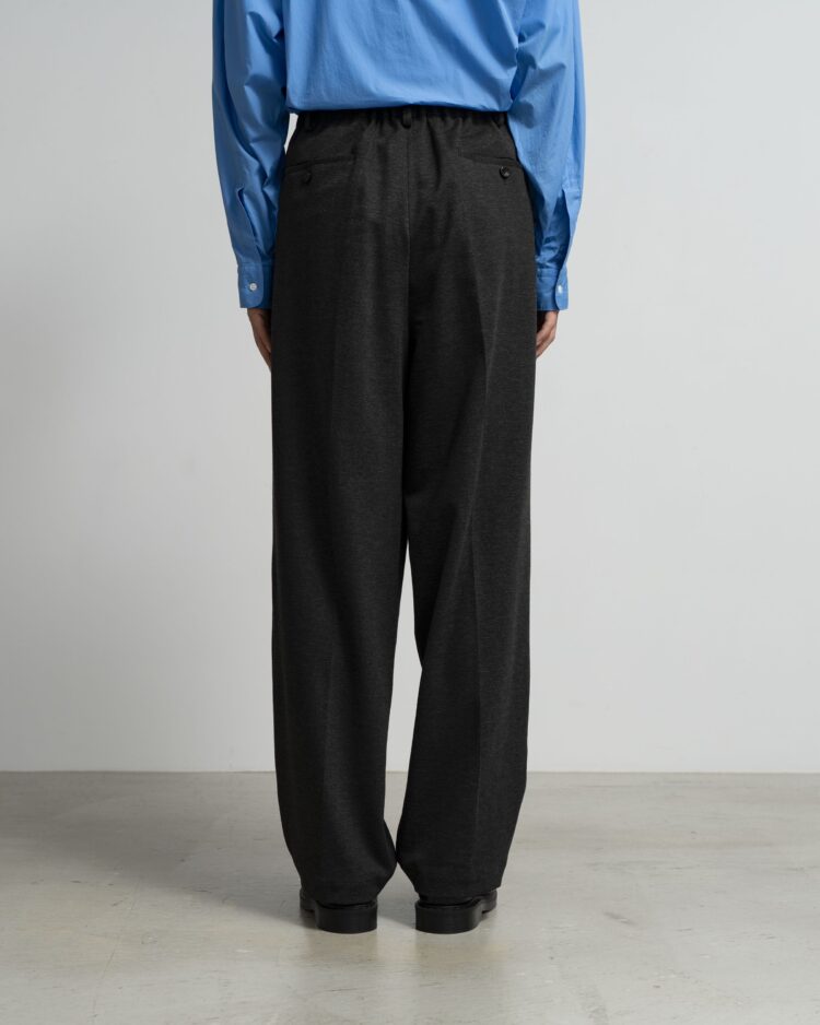 スペイン・バルセロナに拠点を持つSIDOGRAS(シドグラス)社のヴィスコースポンチを使用。布帛のような滑らかなタッチと、ハリがありながら馴染みやすいしなやかさが特徴。ウエスト後ろ側にゴムを入れイージーフィット、フロントにタックを入れてクラシックな雰囲気もありスーチングスタイルも楽しめるワイドテーパードスラックス。