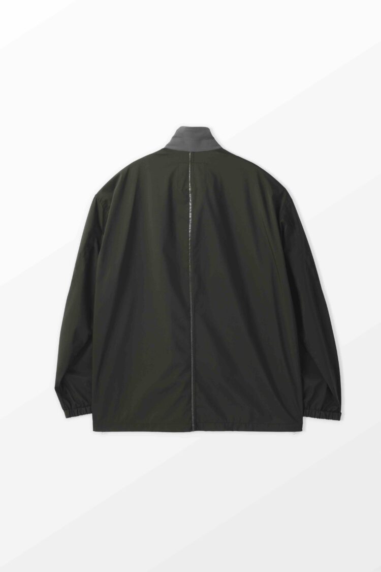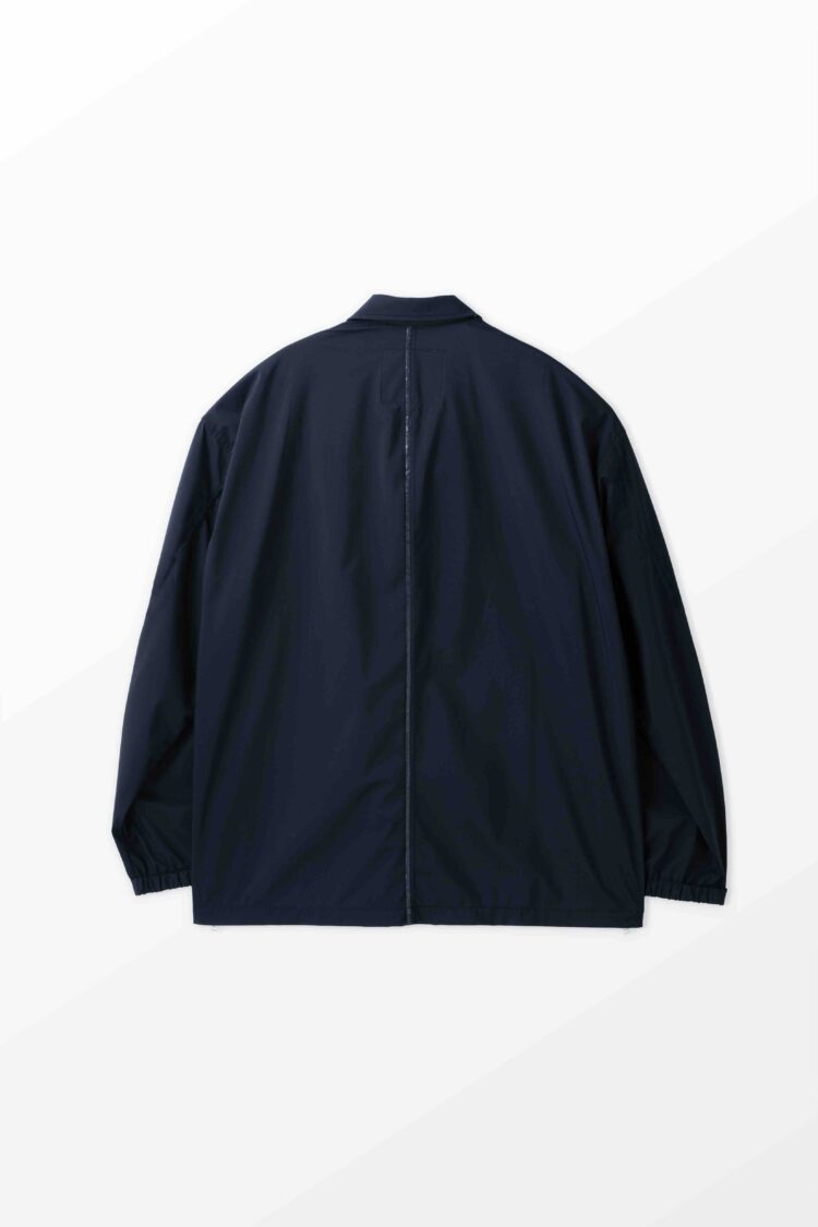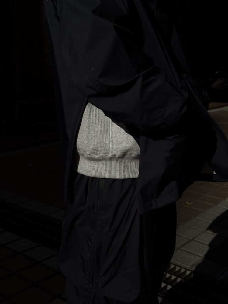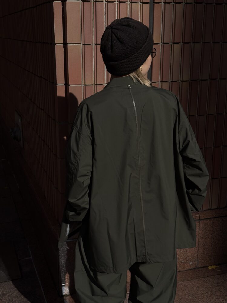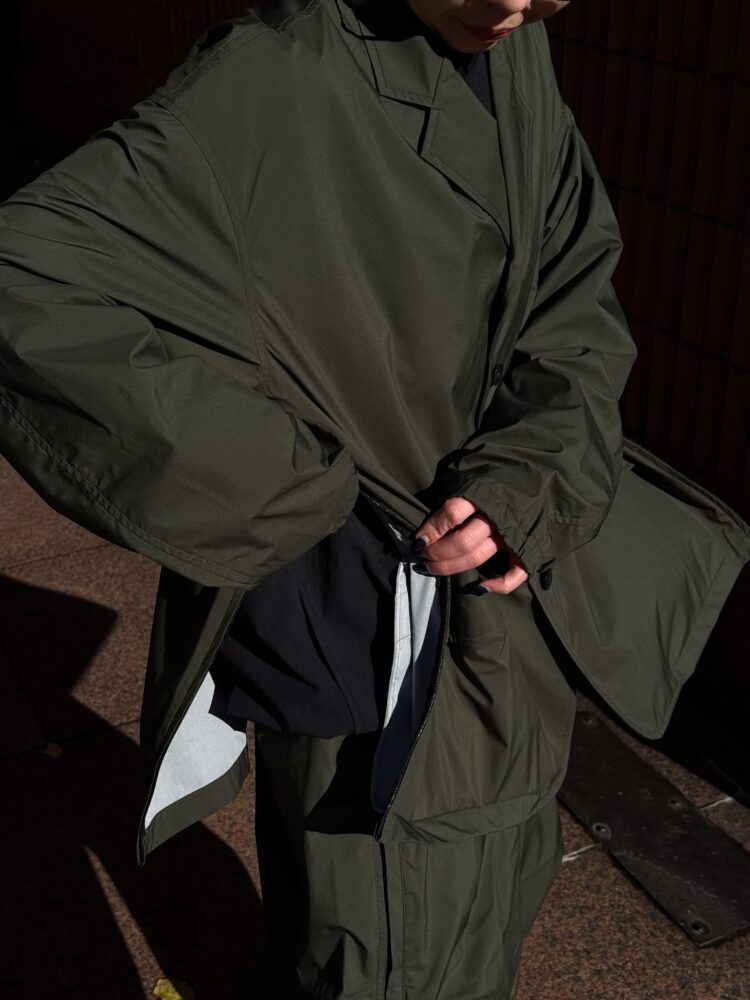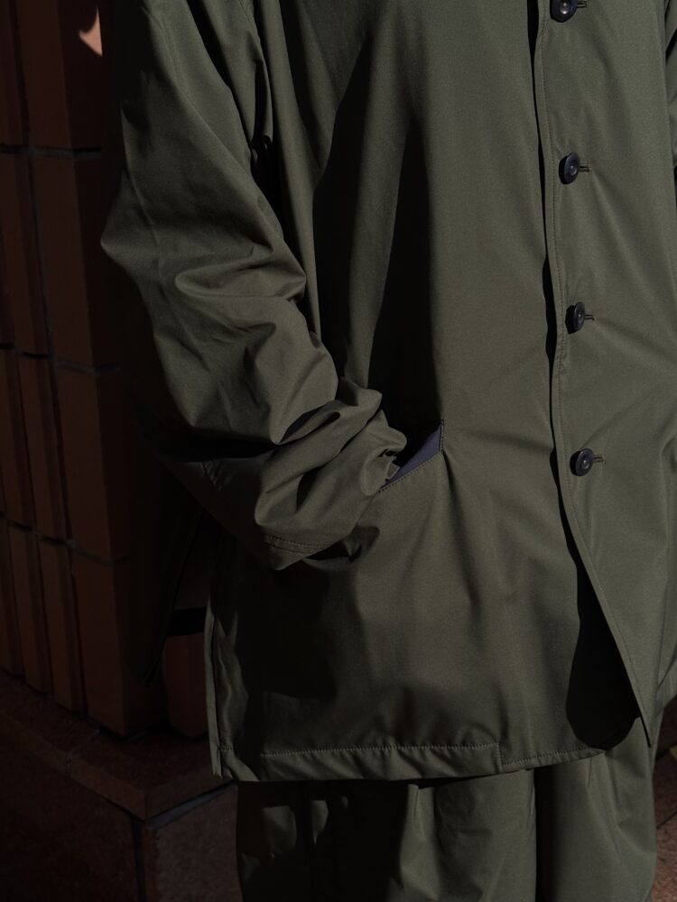薄手でしなやか、動きのある風合いが特徴です。その軽さに加え、素材本来のナチュラルストレッチにより、ストレスフリーな着心地を実現しています。透湿防水・撥水・防風といった機能性に加え、背面はインサイドアウト仕様にし、縫い目に沿って透明な縫い留めテープを貼ることで、
