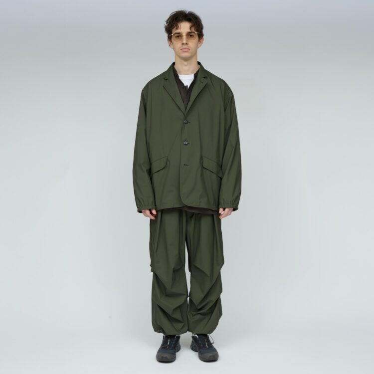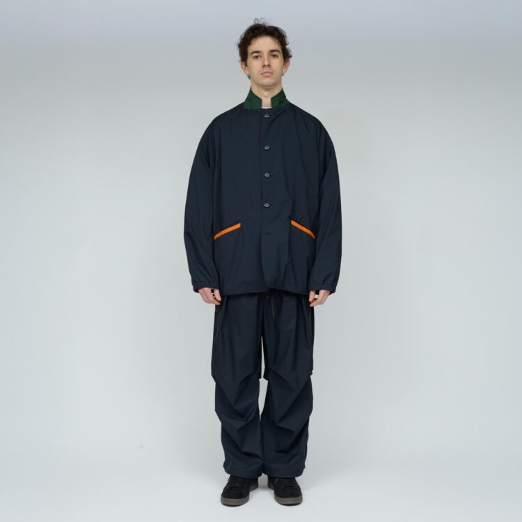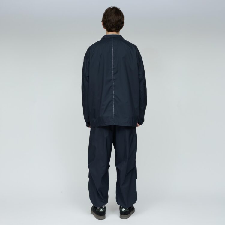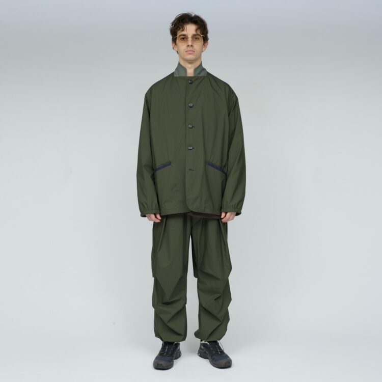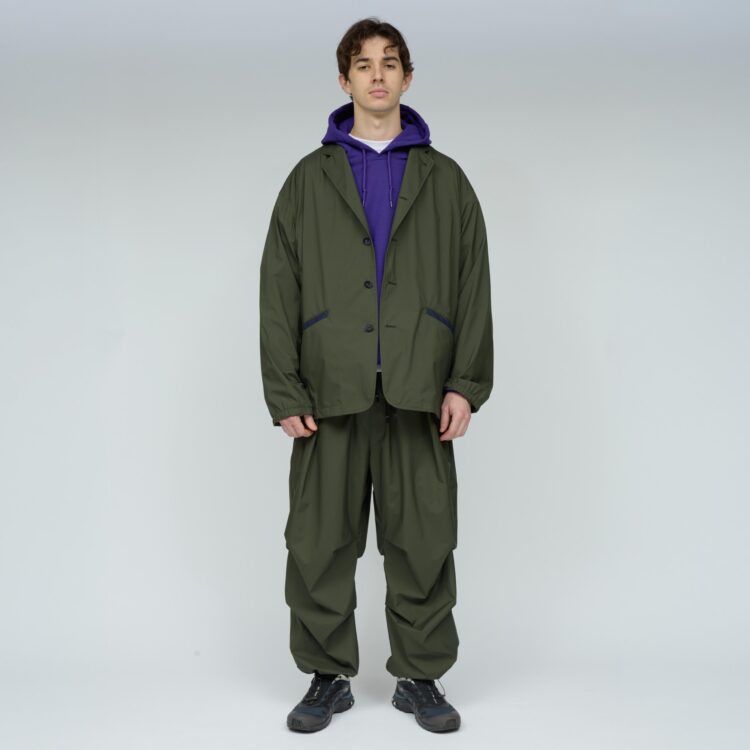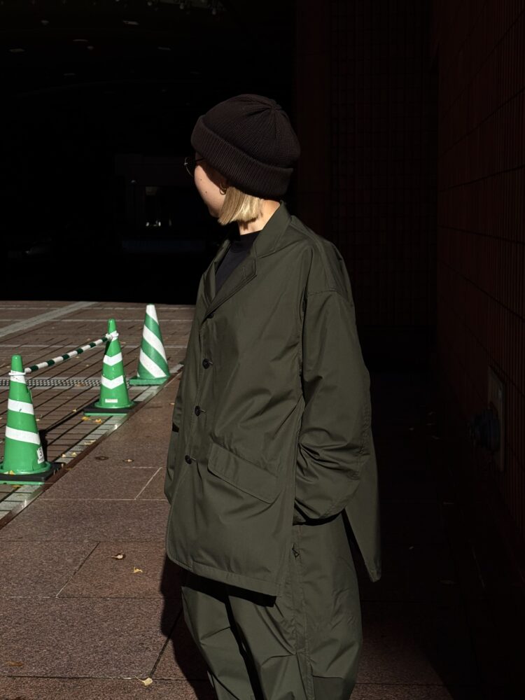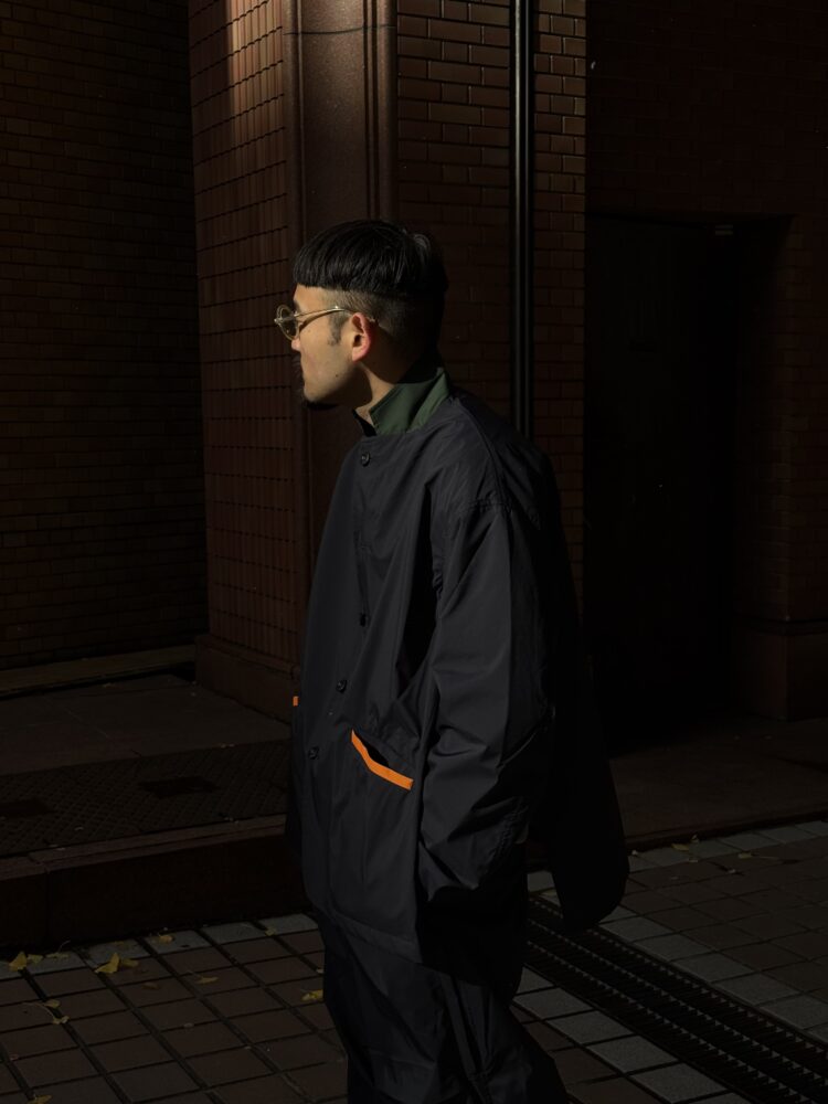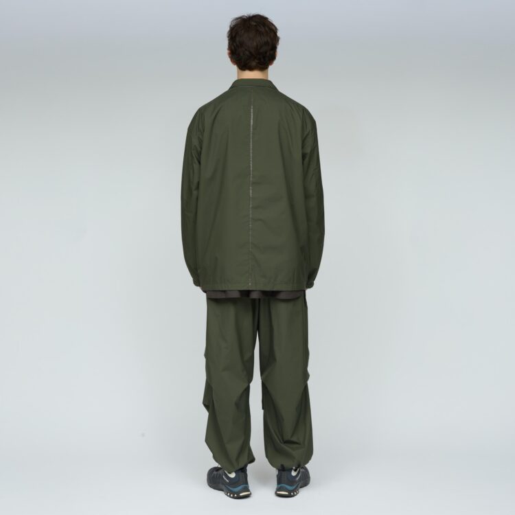 薄手でしなやか、動きのある風合いが特徴です。その軽さに加え、素材本来のナチュラルストレッチにより、ストレスフリーな着心地を実現しています。透湿防水・撥水・防風といった機能性に加え、背面はインサイドアウト仕様にし、縫い目に沿って透明な縫い留めテープを貼ることで、