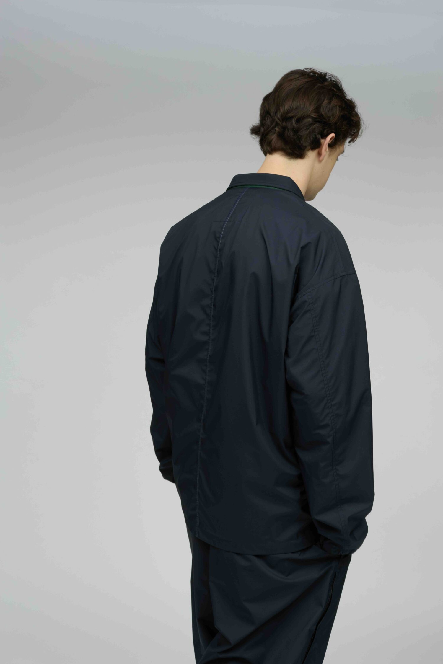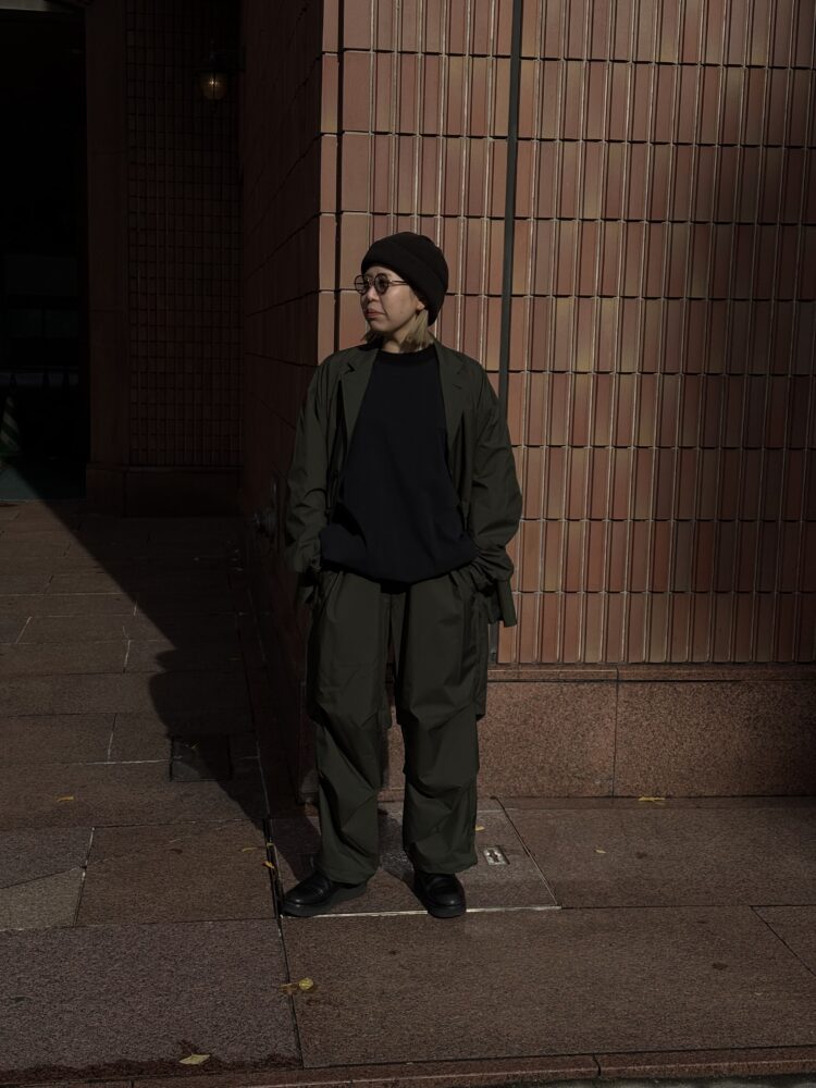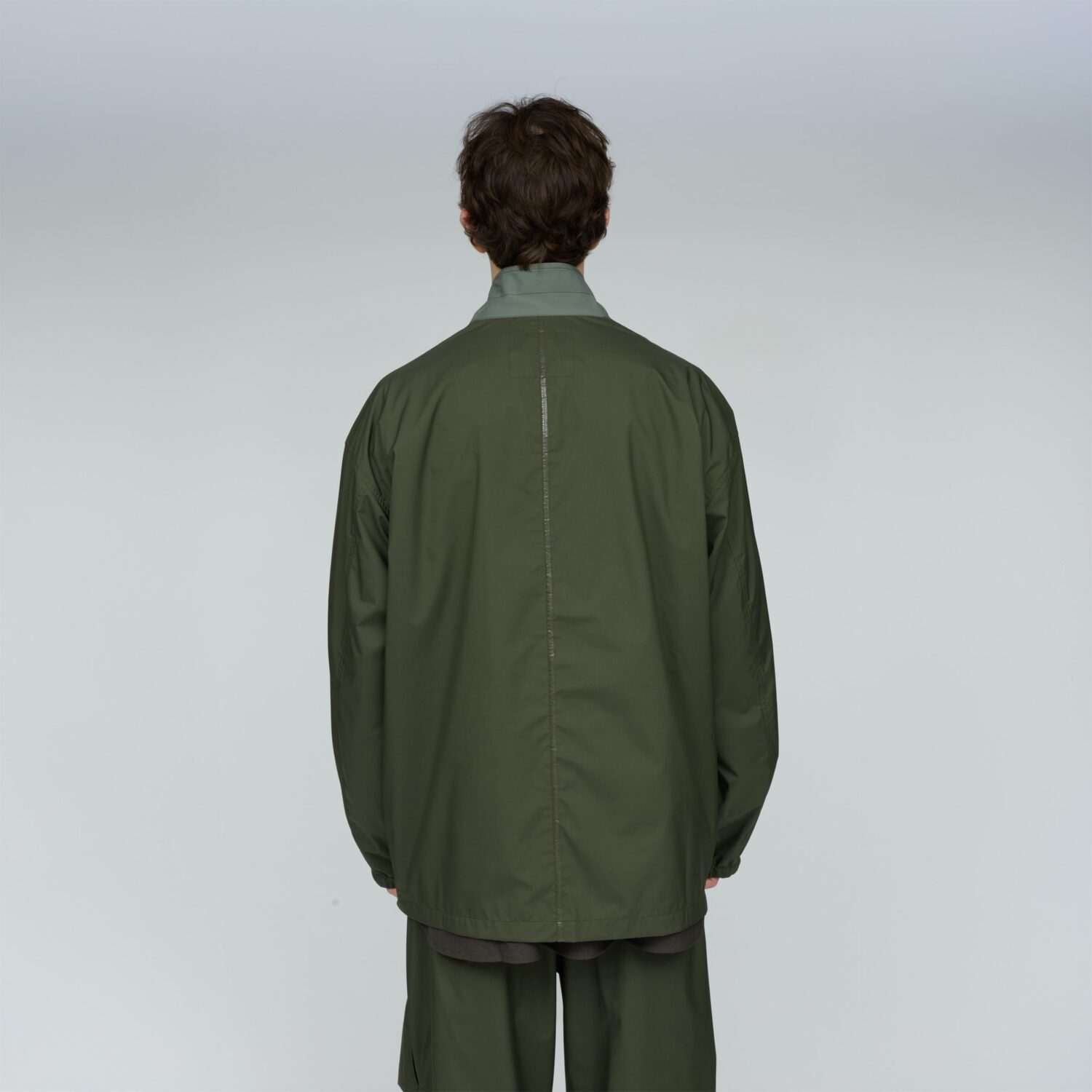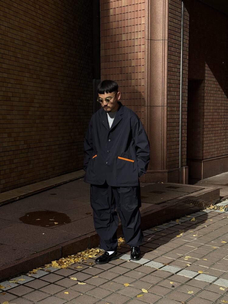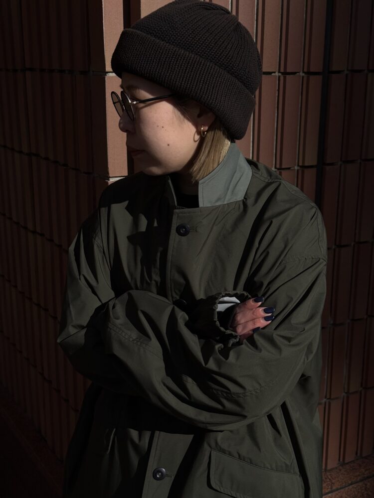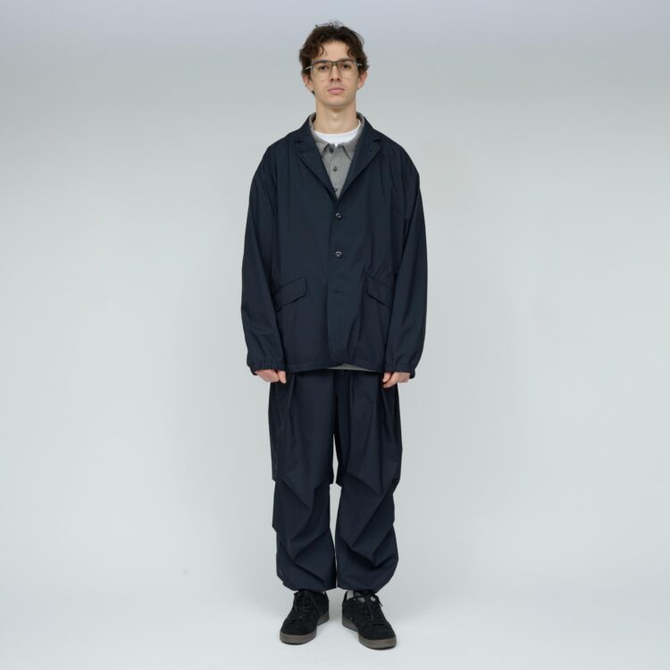 薄手でしなやか、動きのある風合いが特徴です。その軽さに加え、素材本来のナチュラルストレッチにより、ストレスフリーな着心地を実現しています。透湿防水・撥水・防風といった機能性に加え、背面はインサイドアウト仕様にし、縫い目に沿って透明な縫い留めテープを貼ることで、