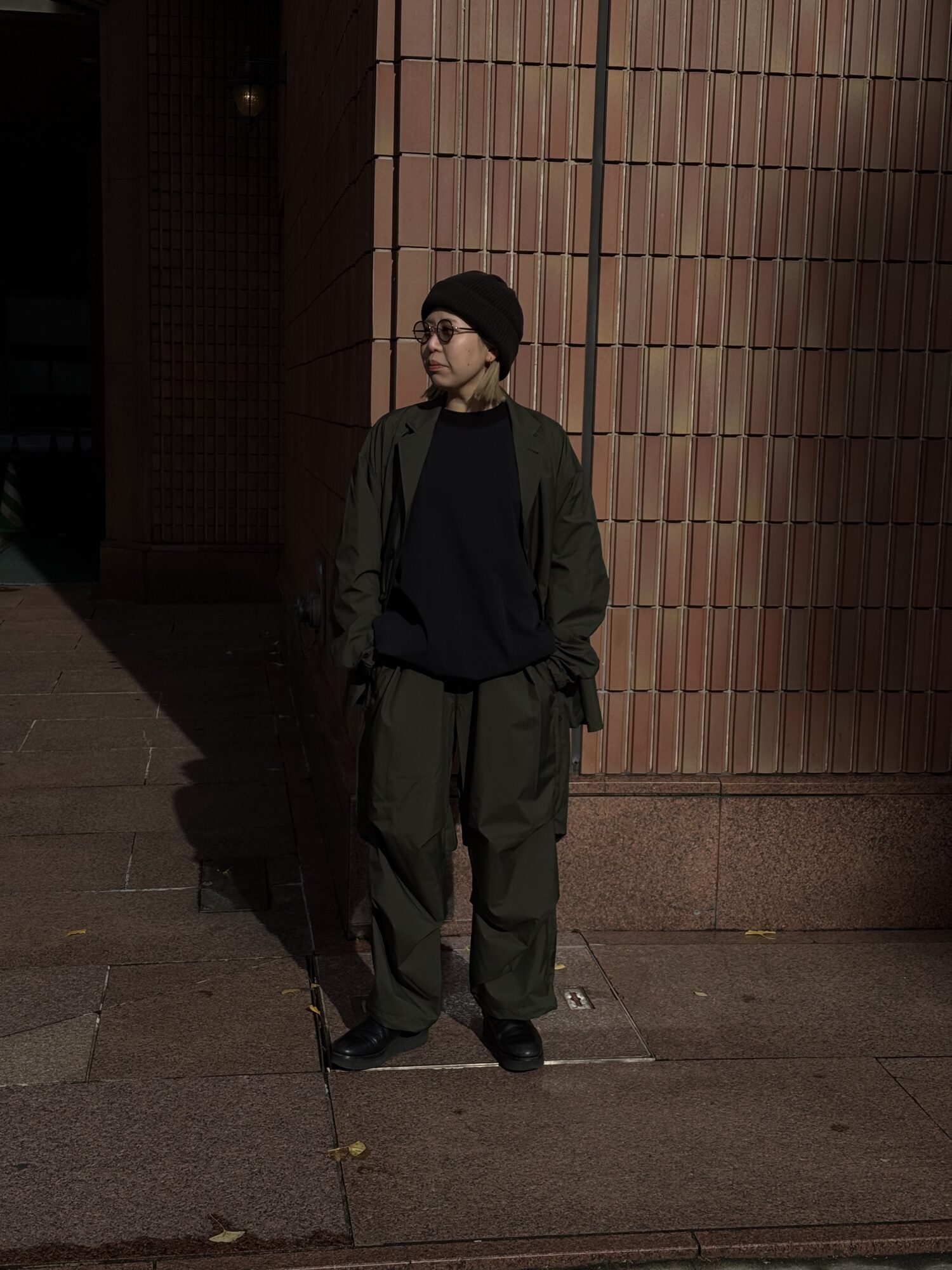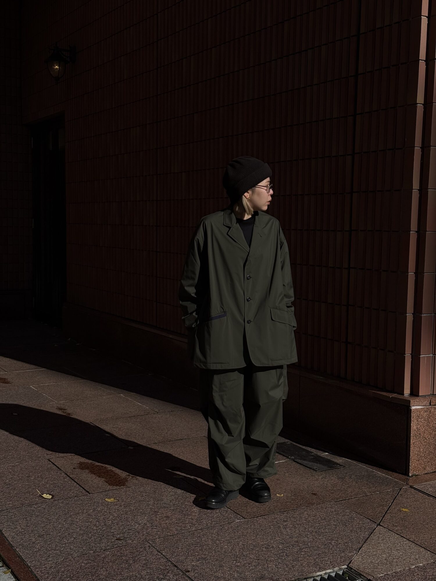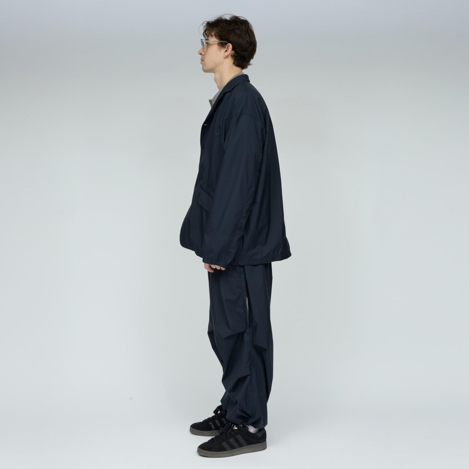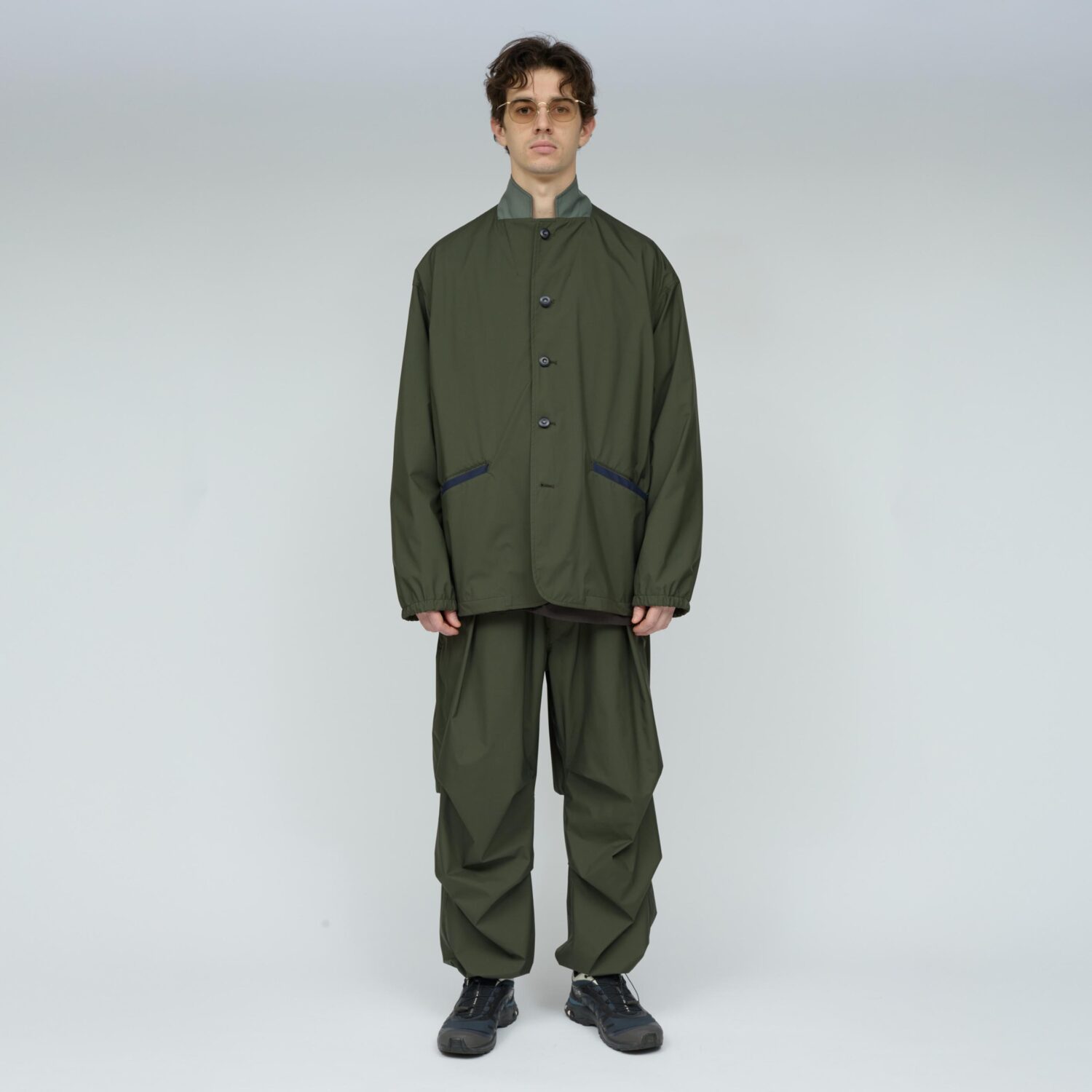 薄手でしなやか、動きのある風合いが特徴です。その軽さに加え、素材本来のナチュラルストレッチにより、ストレスフリーな着心地を実現しています。透湿防水・撥水・防風といった機能性に加え、背面はインサイドアウト仕様にし、縫い目に沿って透明な縫い留めテープを貼ることで、
