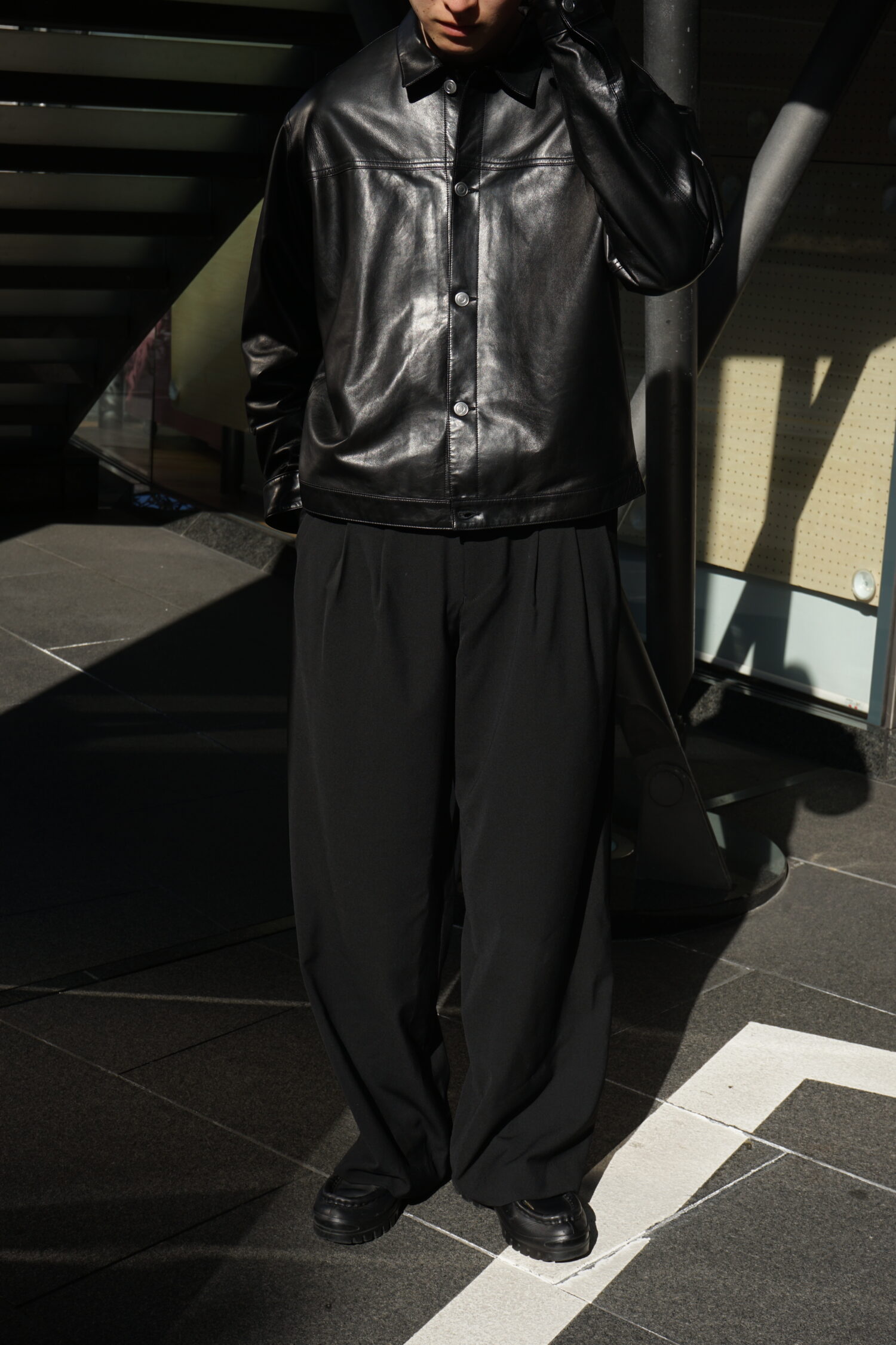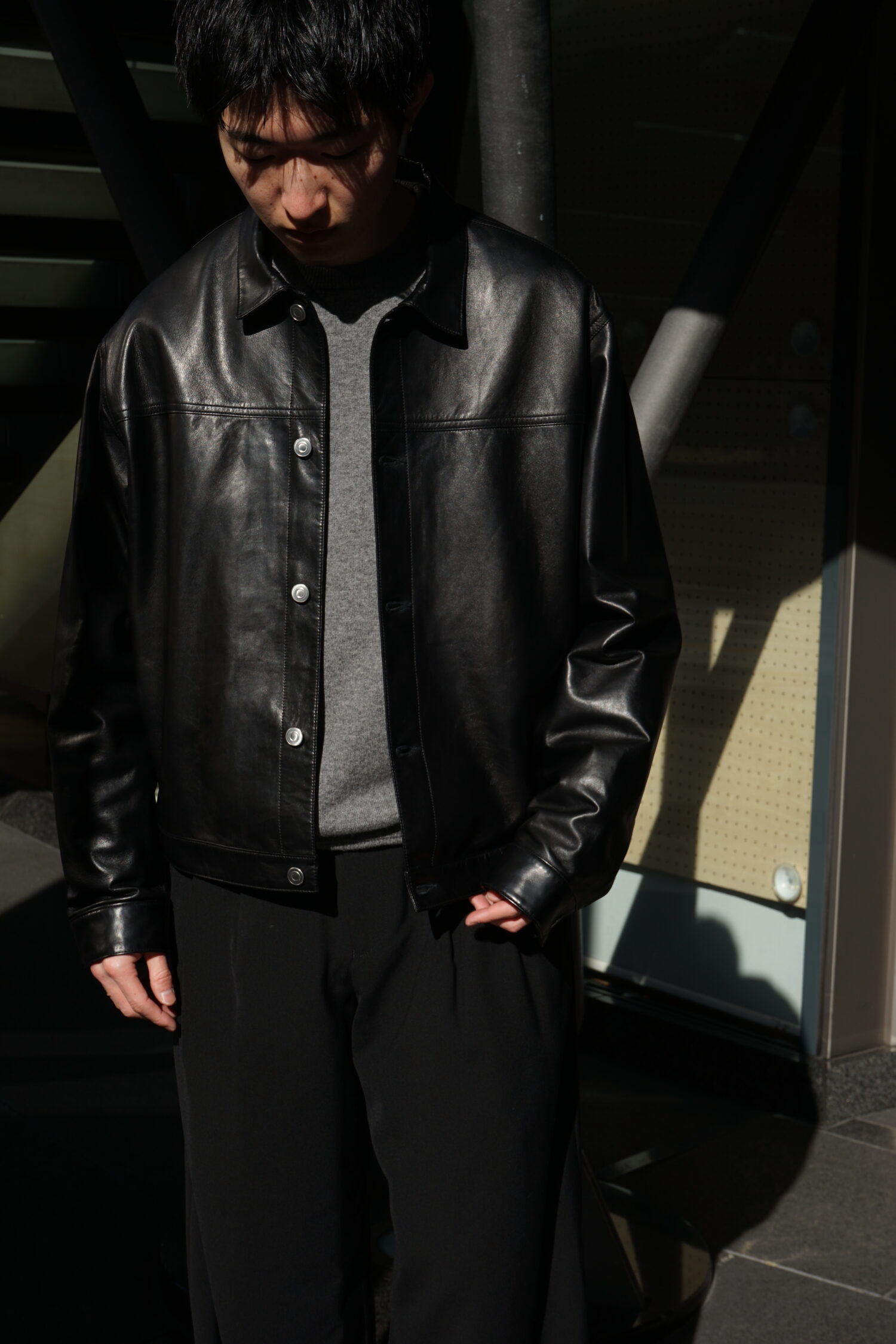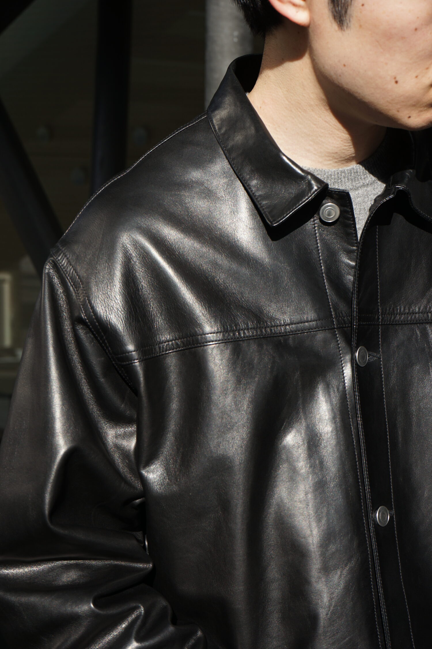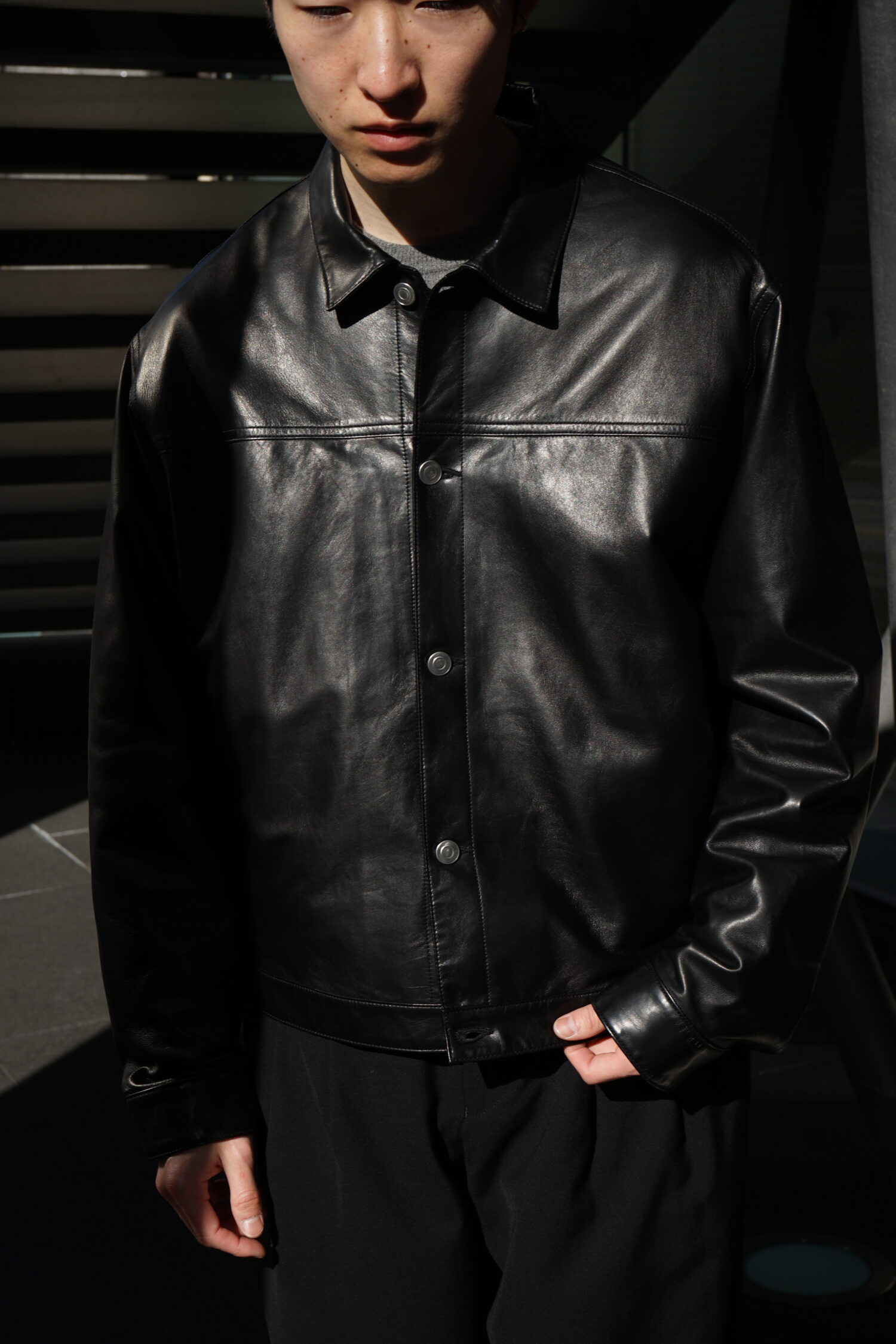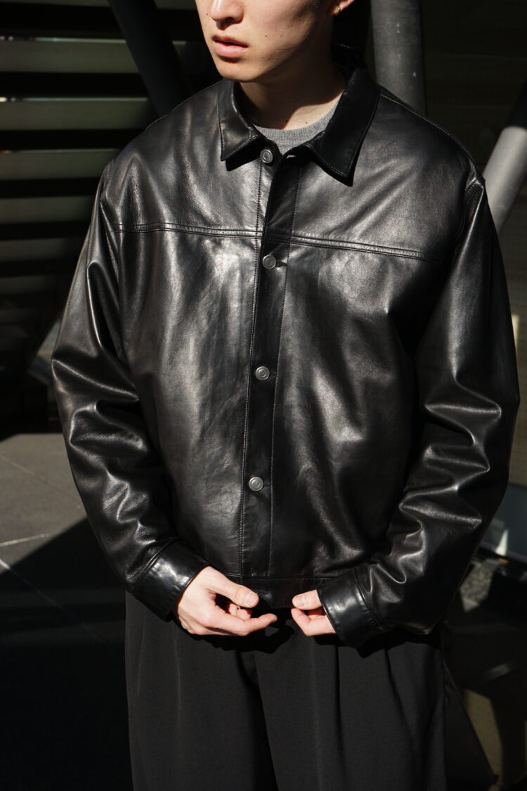 ・ディテールを可能な限り削ぎ落し、シンプルで軽く仕上げたレザートラッカージャケット」です。