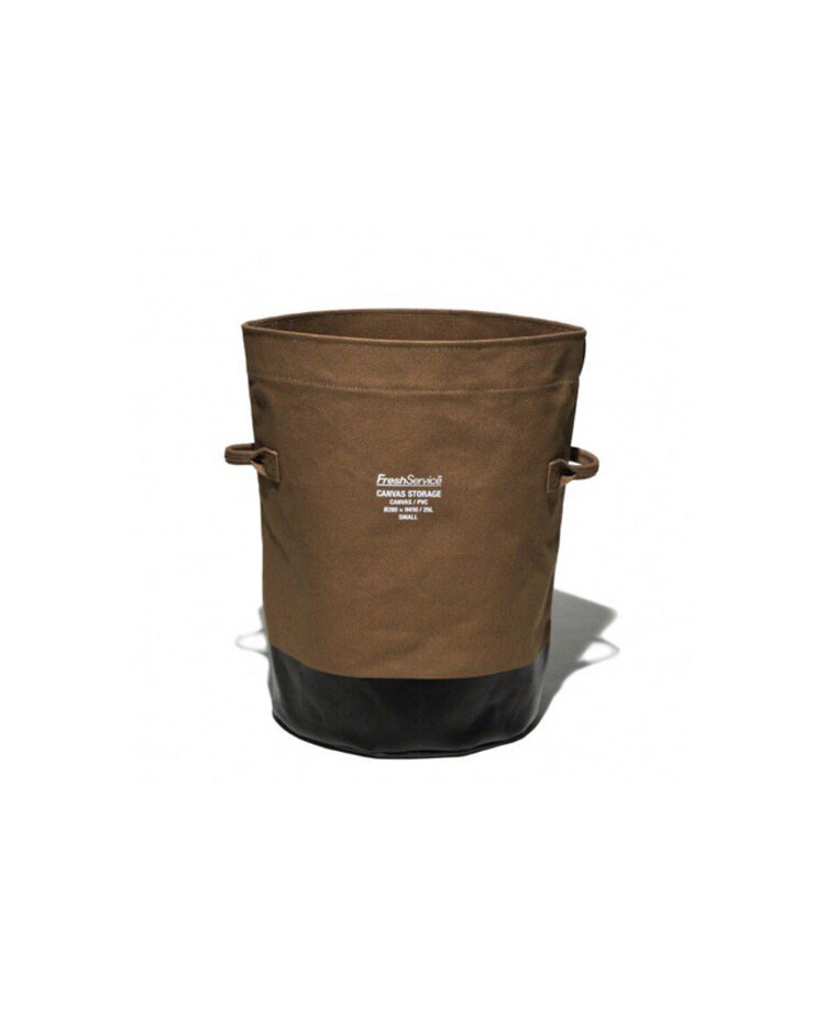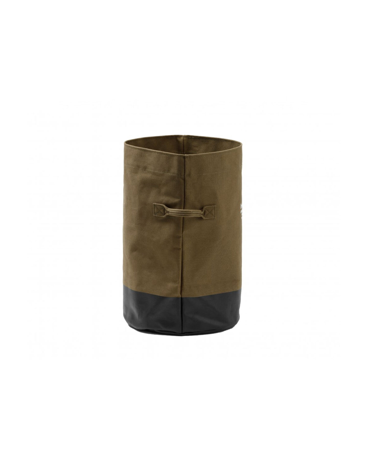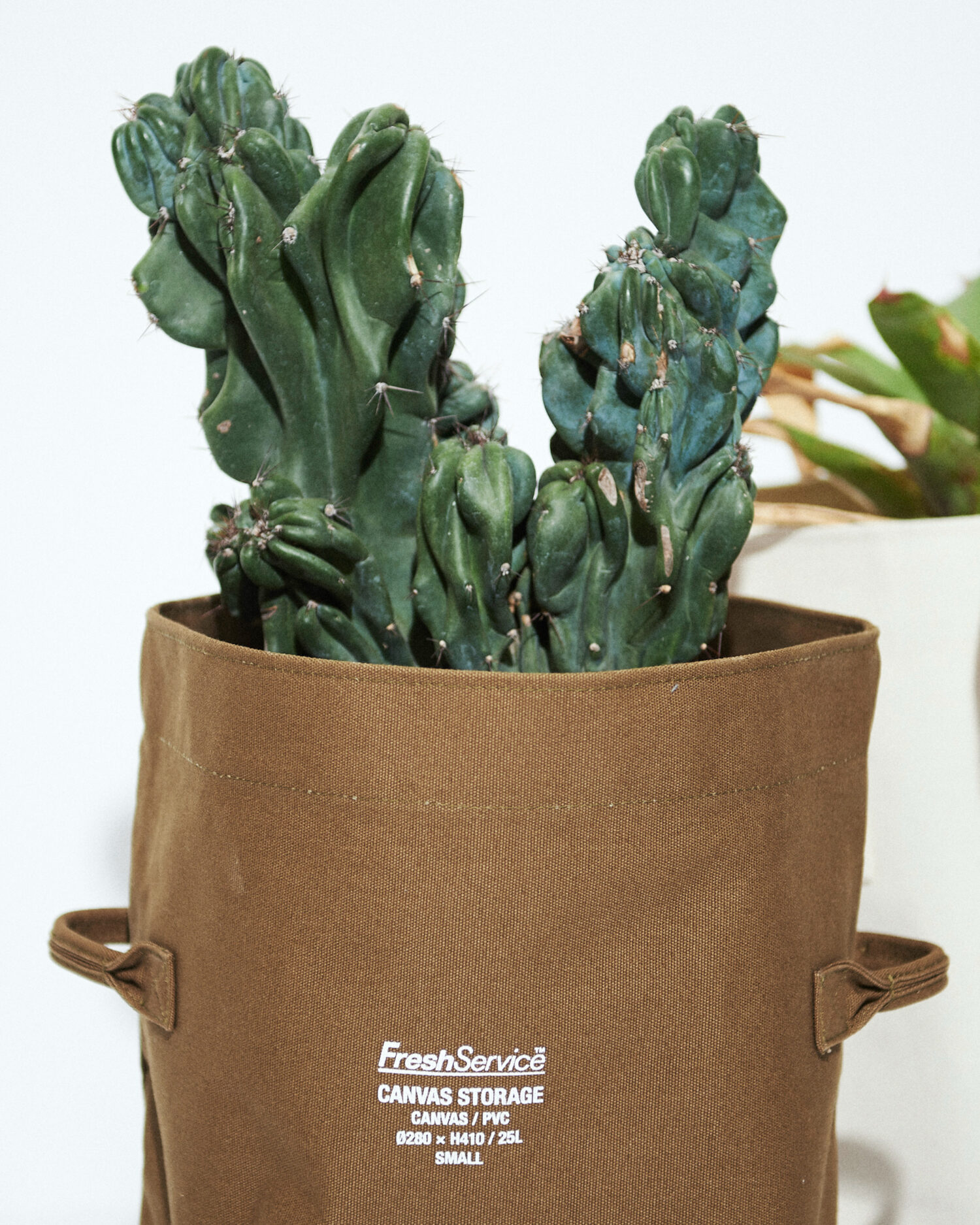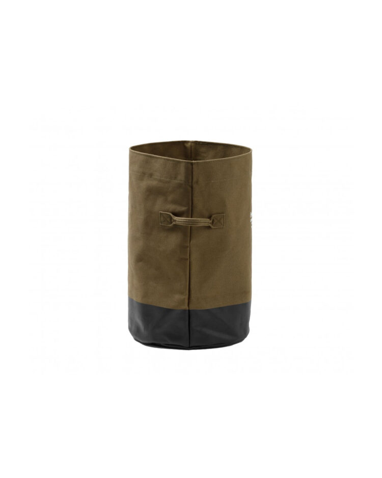 内側に塩ビ加工を施したキャンバス製の収納バスケットでしっかりと自立しやすい作りになっています。汚れも付きにくくお手入れも簡単です。折りたたみもでき、持ち運びにも便利な共生地の取手付きです。下側のラバー印刷とキャンバスのツートンカラーが印象的。ランドリーバッグや、ツールボックスとしても、観葉植物の鉢植えカバーとしても。Size: 直径約280 高さ410