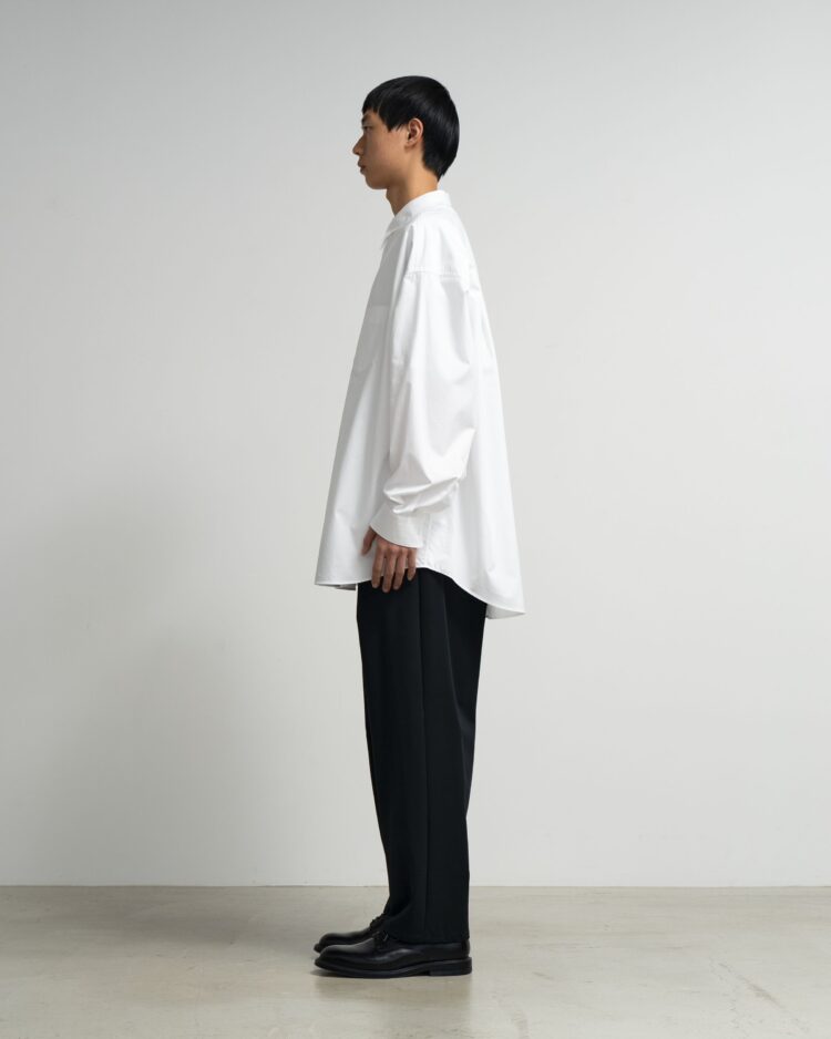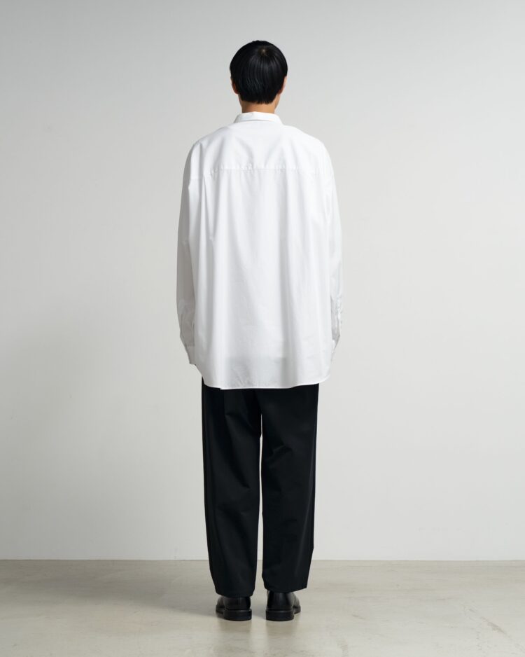 しなやかで適度な光沢感を放つスーピマコットンを用いて限界に近い密度に織り上げたクリアな表情とハリ感が特徴のハイカウントブロード。身幅はたっぷりとボリュームを持たせながら、襟元と袖口はきっちりと決めることでリラックスした雰囲気と上品さを両立。ドレスシャツに使われる接着芯を使用することでグラフペーパーの中でもネクタイ着用を想定したモデル。