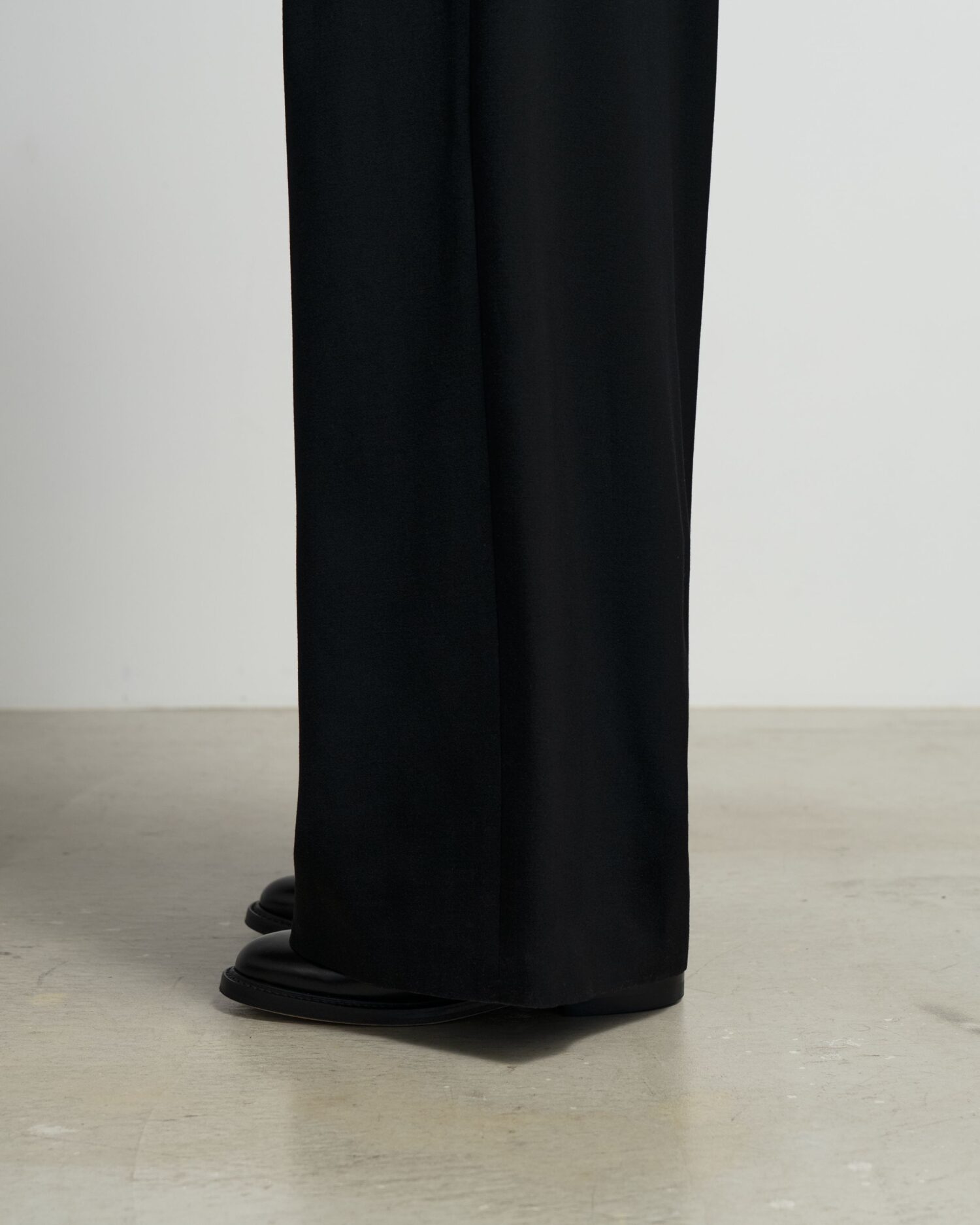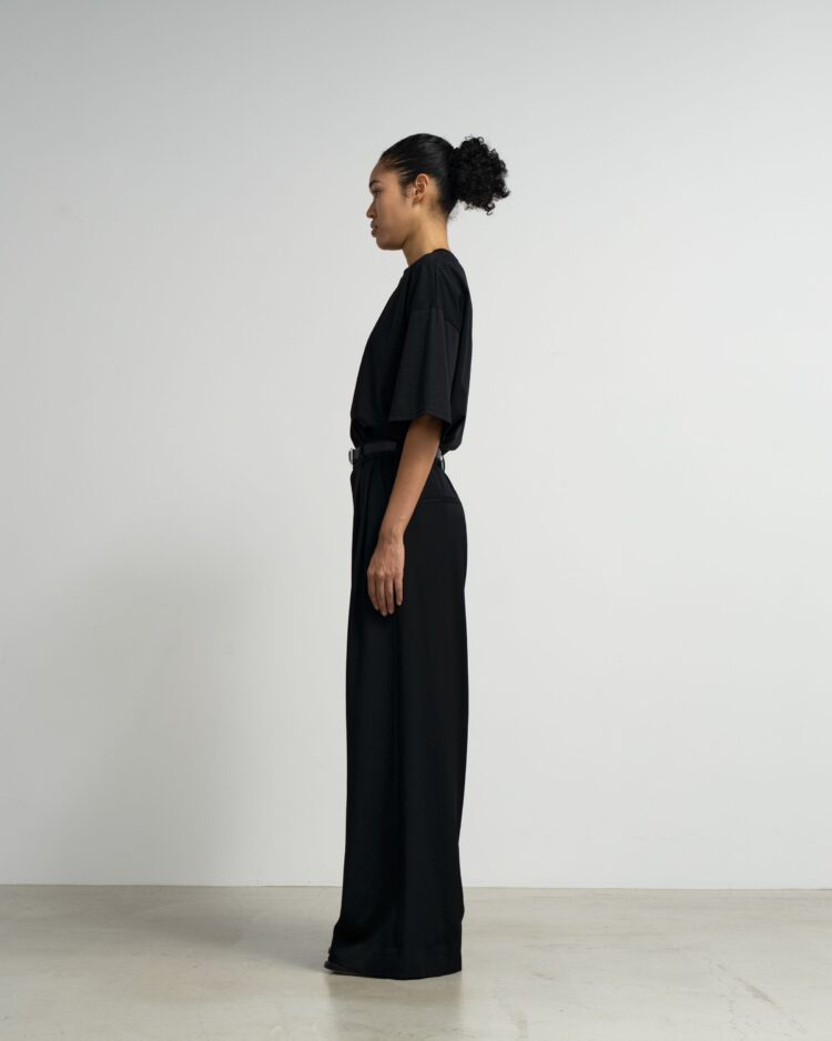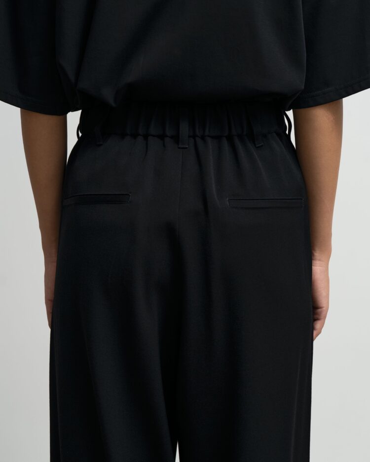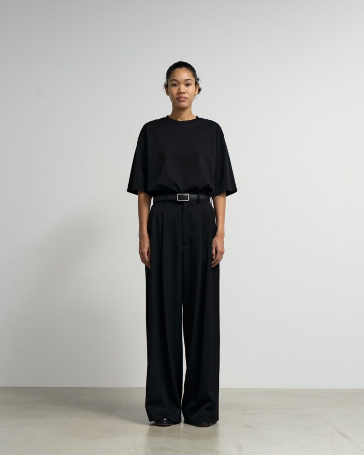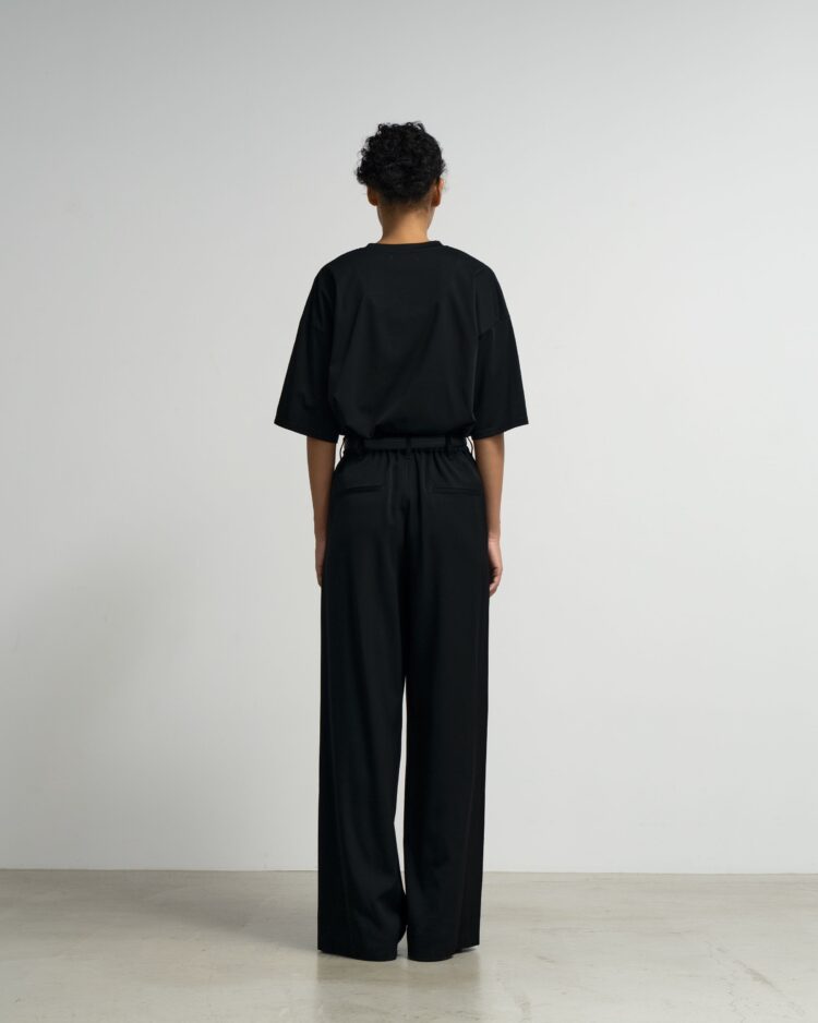 良質なメリノウールを使用した朱子織りのドスキン。一般的にタキシードに使われるような高密素材で柔らかさと光沢感が特徴。通常より染色時間を長くし「黒より黒い」濃染加工をすることでよりシャープで深い黒色を表現している。フロントに2本のタックをあしらい裾に向かって緩やかに広がっていくワイドなトラウザー。後ろウエストにゴムを設けたイージーな着用感。