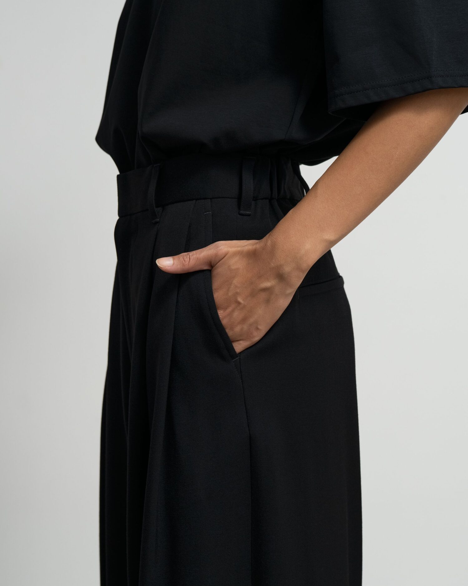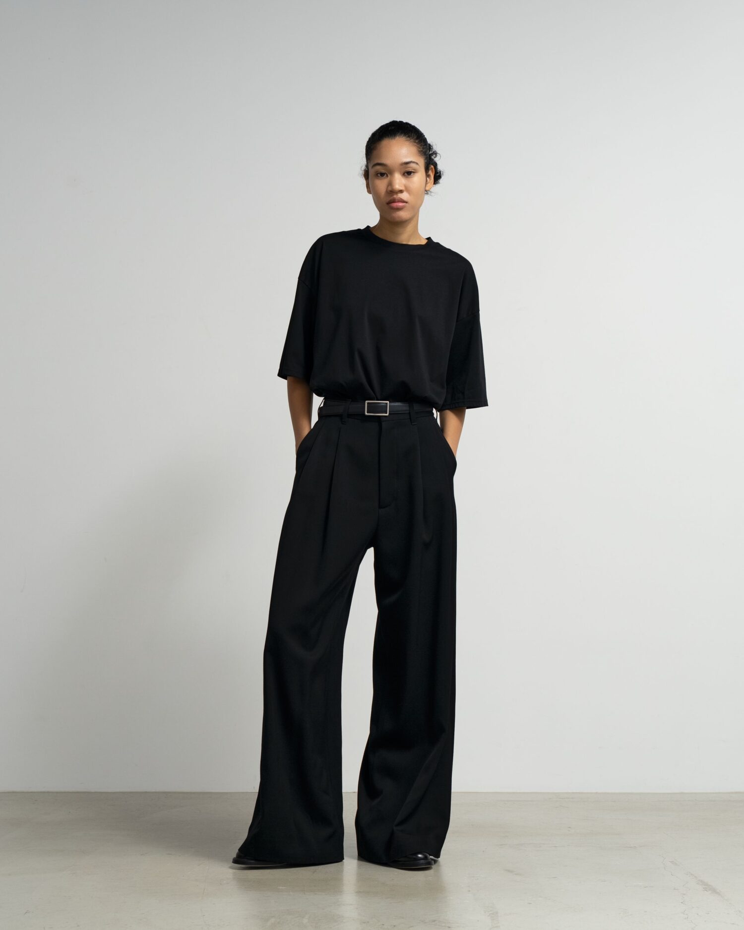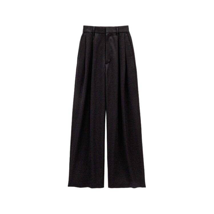 良質なメリノウールを使用した朱子織りのドスキン。一般的にタキシードに使われるような高密素材で柔らかさと光沢感が特徴。通常より染色時間を長くし「黒より黒い」濃染加工をすることでよりシャープで深い黒色を表現している。フロントに2本のタックをあしらい裾に向かって緩やかに広がっていくワイドなトラウザー。後ろウエストにゴムを設けたイージーな着用感。
