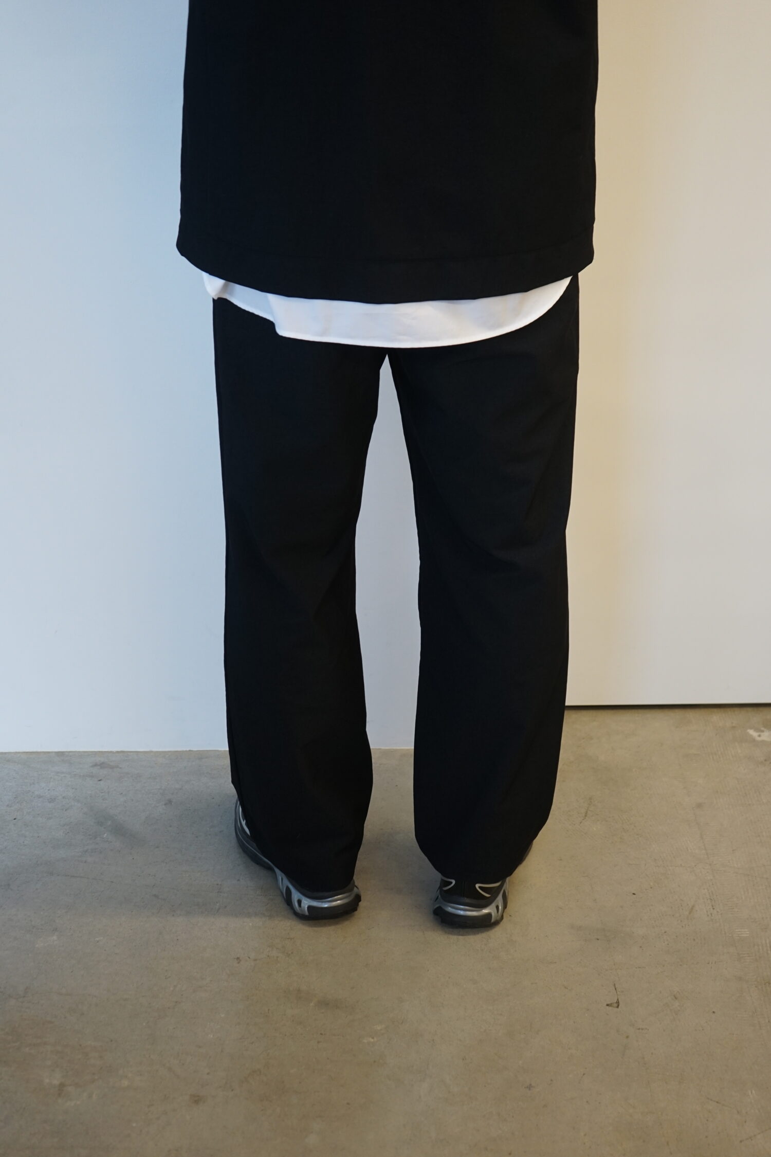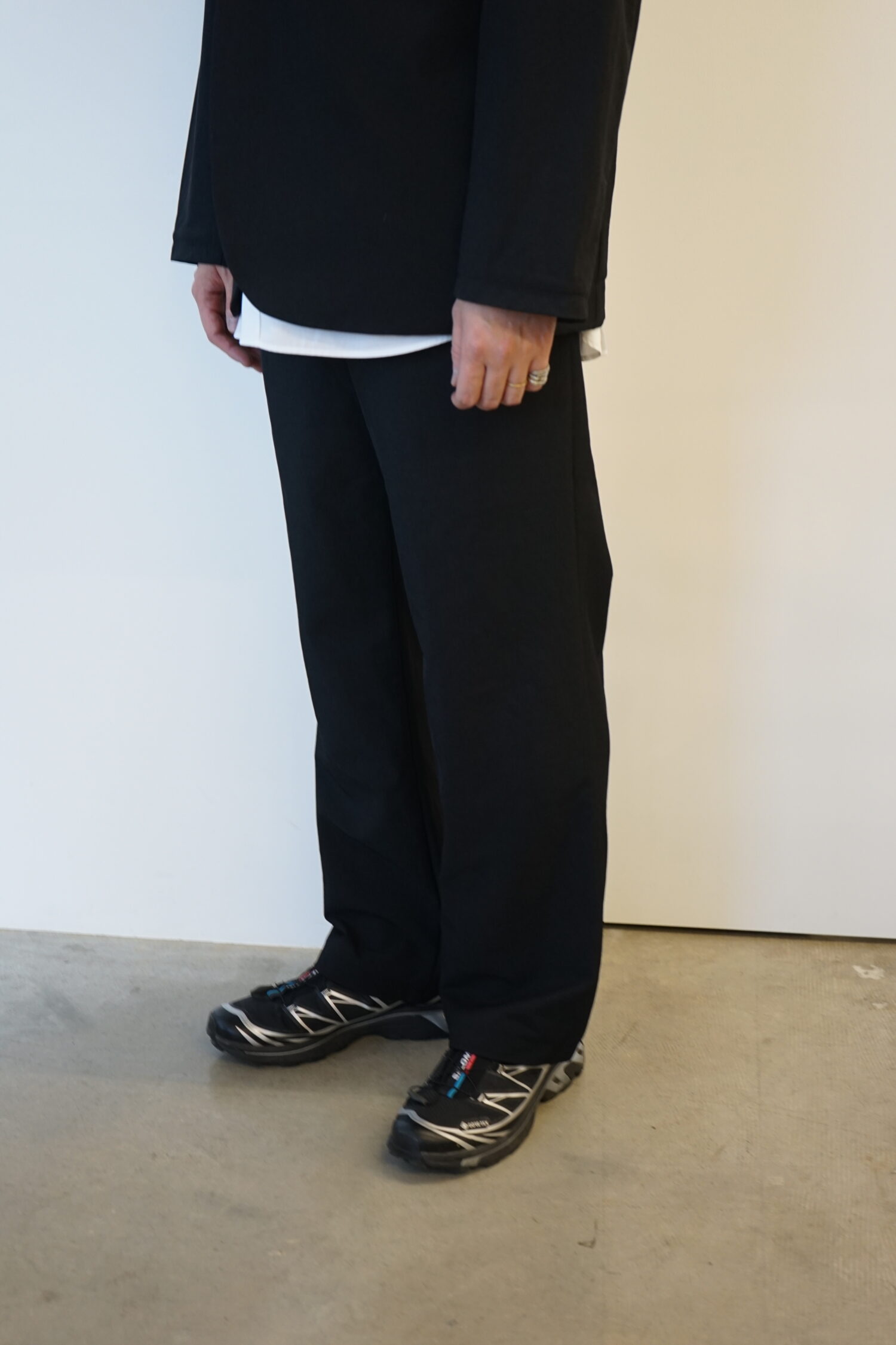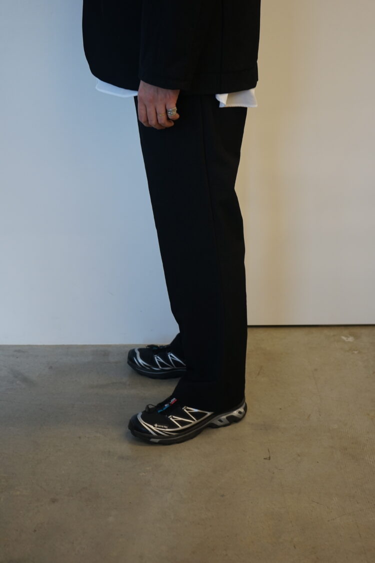 旅行者のために開発されたWallet Pantsは貴重品のセキュリティーにフォーカスしたシリーズ。また、長時間のフライトをより快適にするためのパターンワークが施されています。シャドーと名付けられたGHOST CODEのために開発された特殊なカラーはドレスコードを研究するTEATORAが導き出した黄金比。影を実体化したかのような色彩は品格の中に静けさを内包し、着用者の印象を品よく匿名化します。また、このGHOST CODE専用テキスタイルはクラシカルな佇まいからは想像できない、TEATORA史上最もダイナミックな可動域。人体の動きを一切拘束しないこのシリーズはその大胆な伸縮性と、強靭なキックバックによりあなたに快適な可動域を与えてくれます。