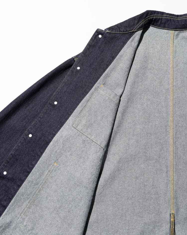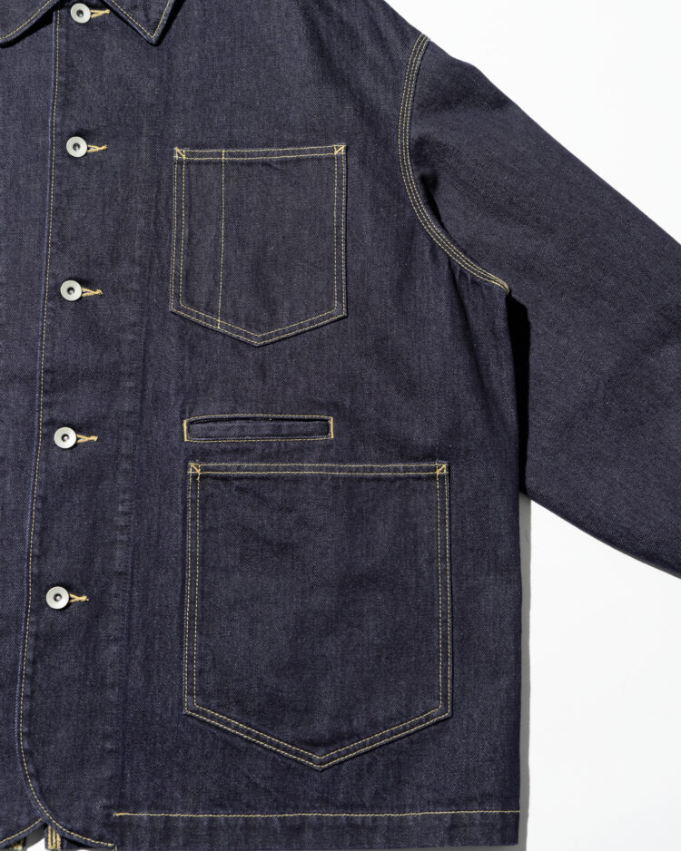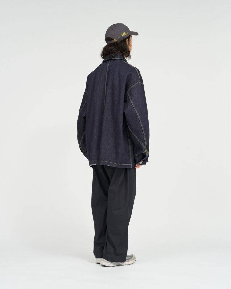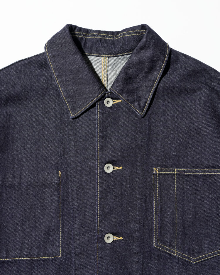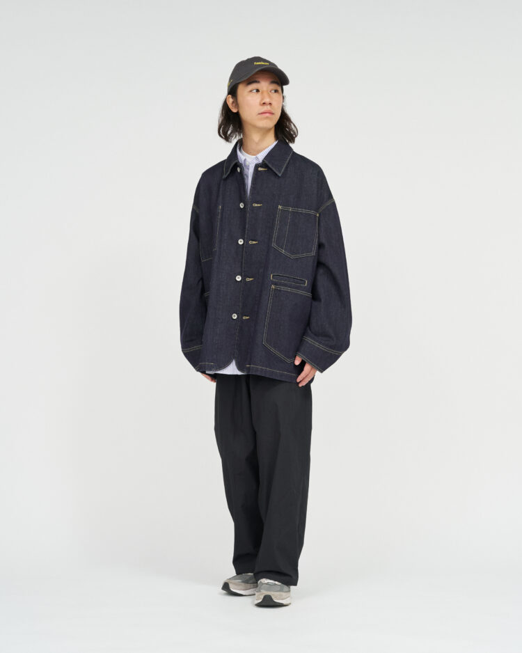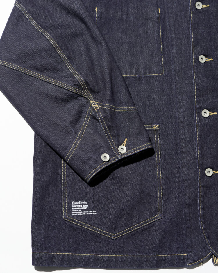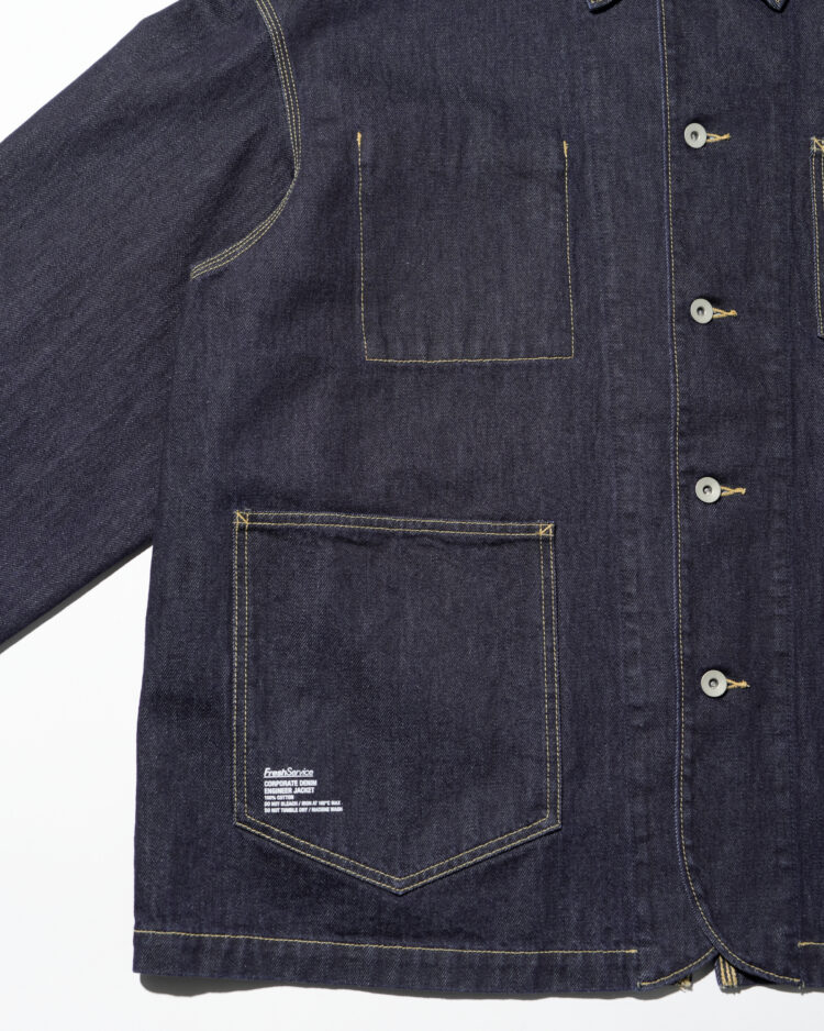 生地には穿き込むほどに表情を深める13.5ozのヘビーオンスデニムを採用。新作のエンジニアジャケットは、FreshServieらしいゆったりとしたドロップショルダーのシルエットで、往年のワークジャケットをベースに、スマートフォン用のポケットなど現代的なディテールをプラスしました。同素材で展開されるCORPORATE DENIM FIVE POCKET PANTSやCORPORATE DENIM とのセットアップもおすすめです。
