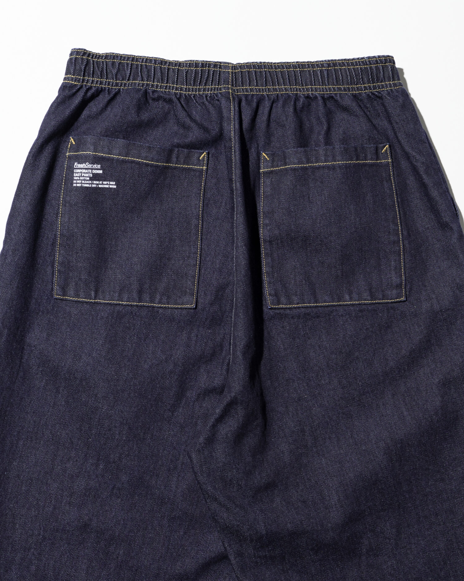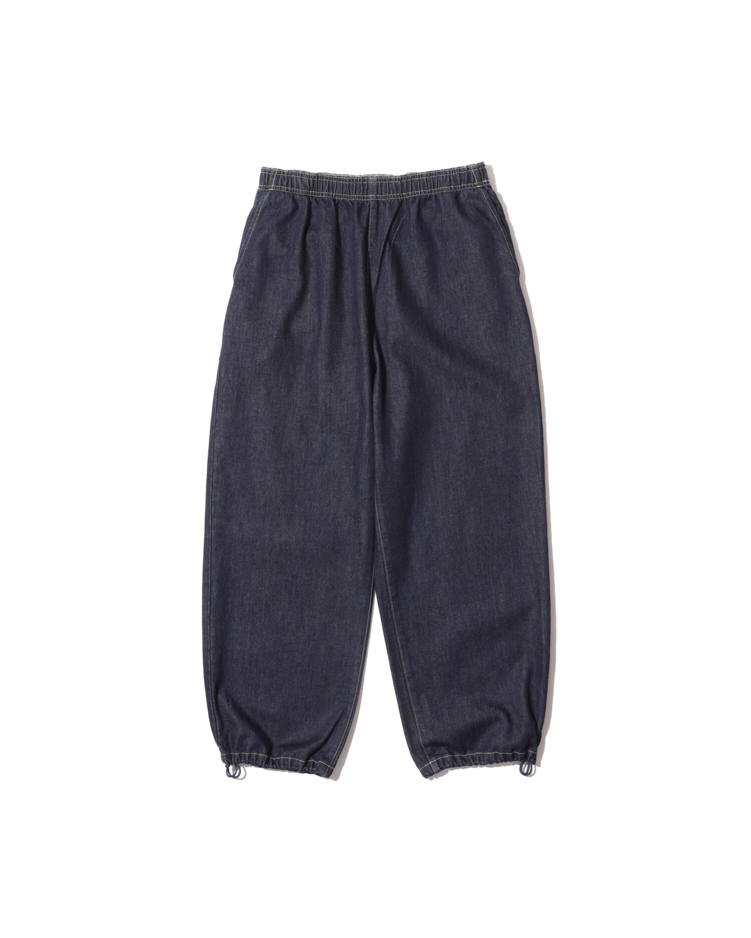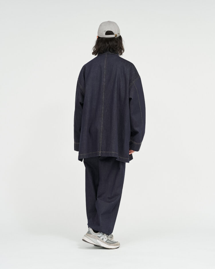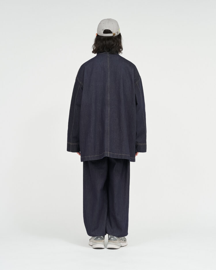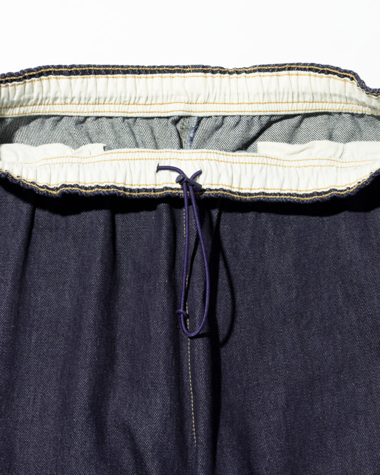 生地には穿き込むほどに表情を深める13.5ozのヘビーオンスデニムを採用。新作のワイドシルエットのイージーパンツは、ウエストに加え裾にもドローコードを備えており、気分やスタイリングに合わせてシルエットの調整が可能。大ぶりなパッチポケットがワークのムードを添えつつ、気負わず穿けるストレスフリーな一本で、同素材のCORPORATE DENIM ENGINEER JACKETとのセットアップはもちろん、カットソーやシャツ、サンダルまでスタイルを問わず合わせやすいのも魅力。