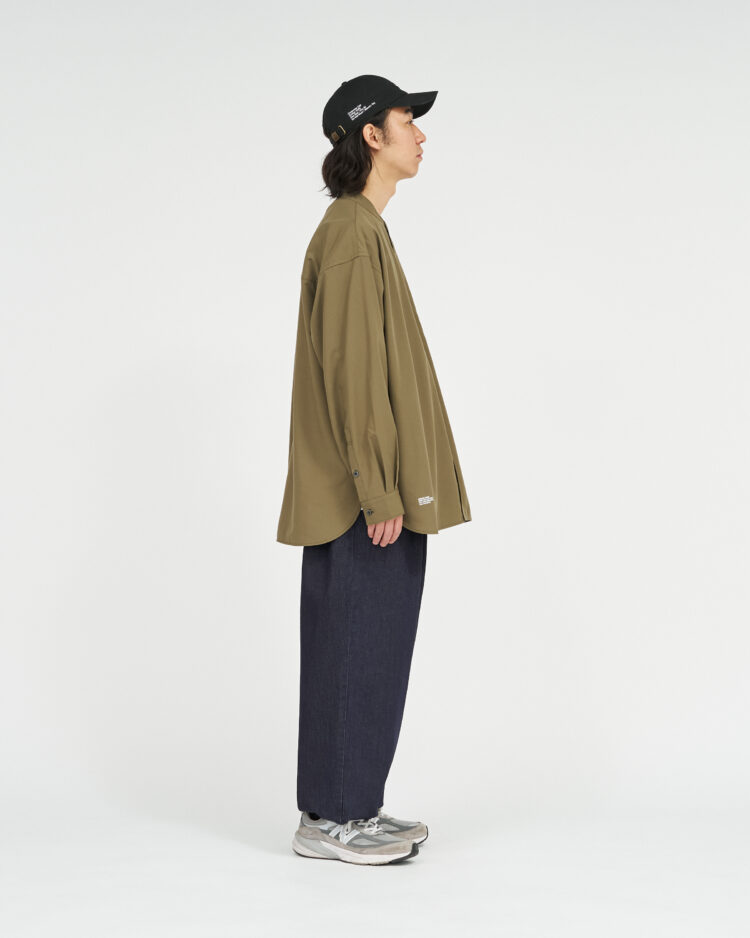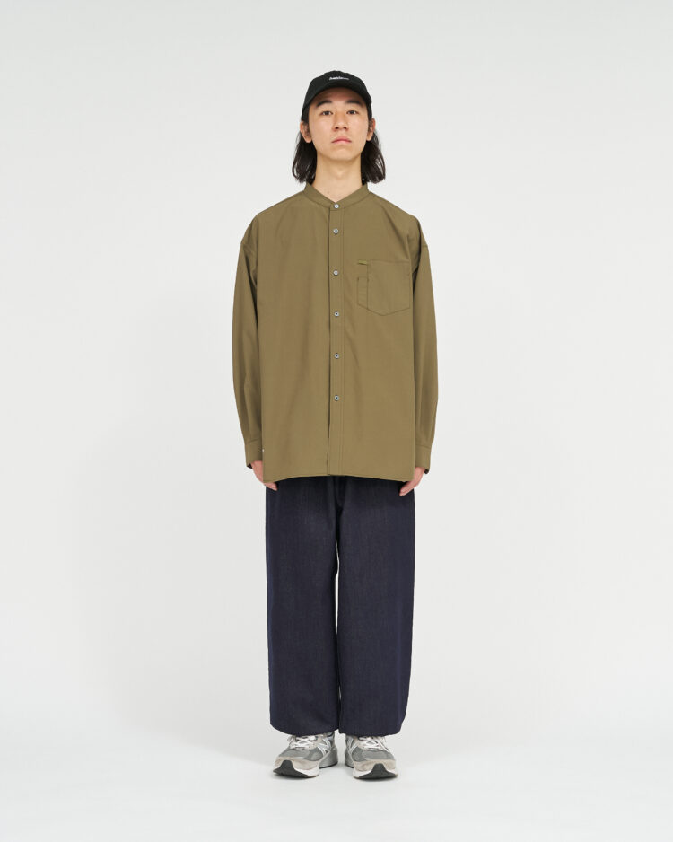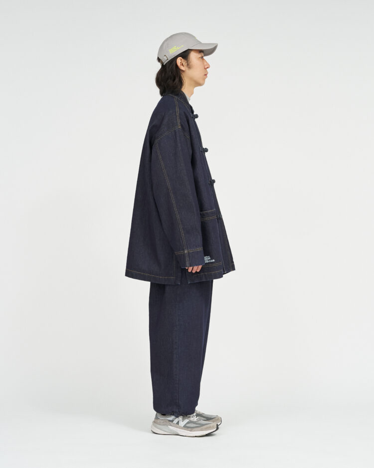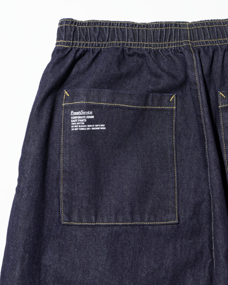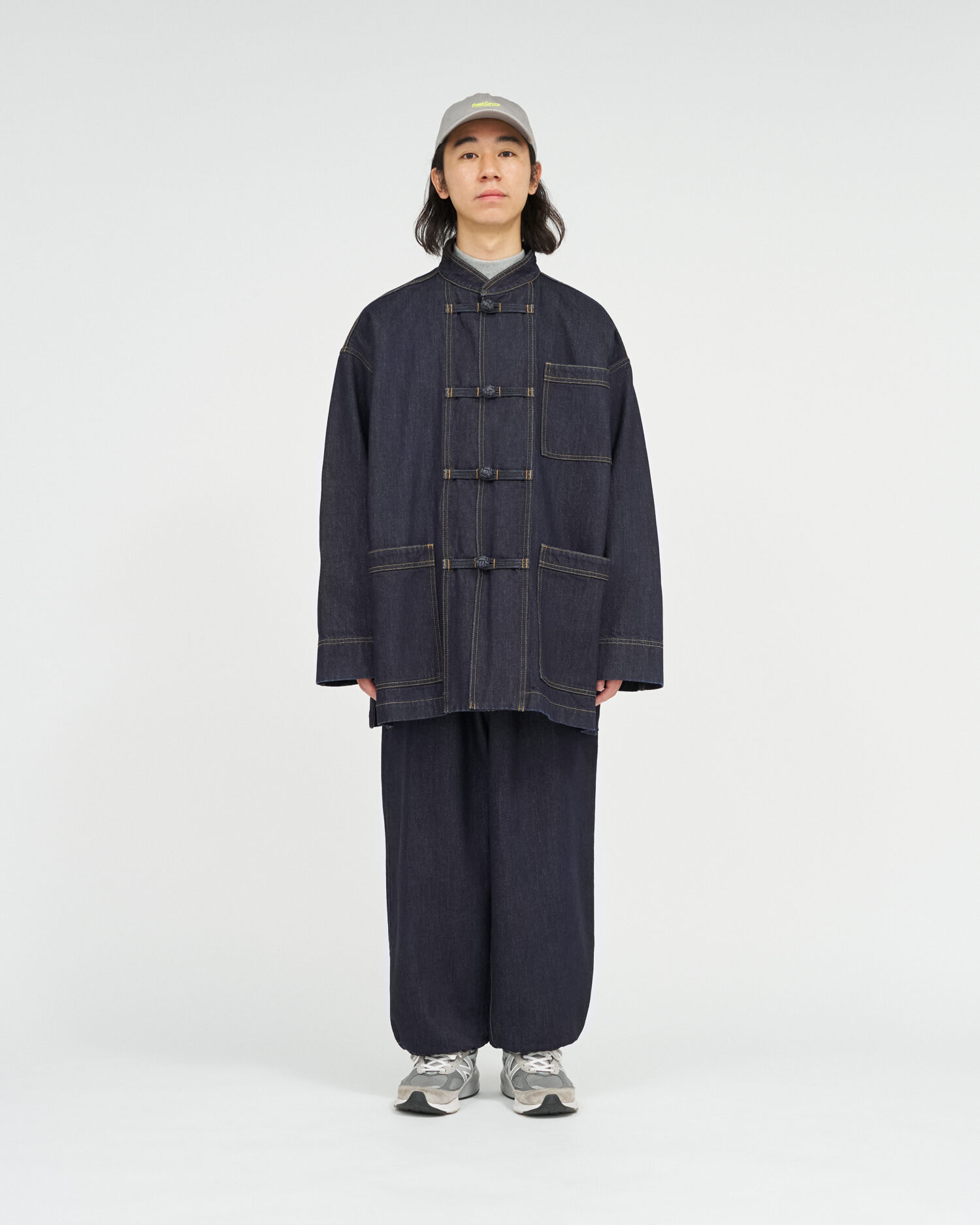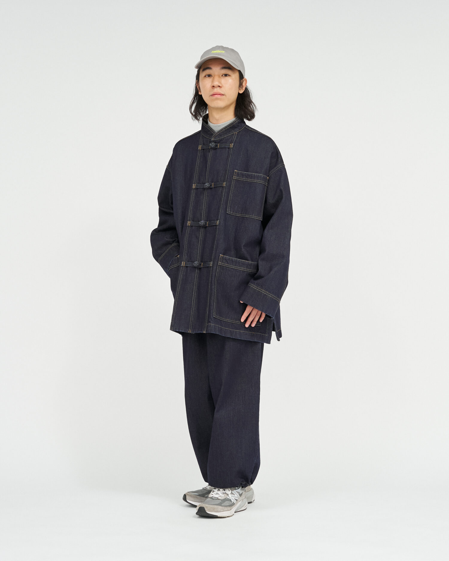 生地には穿き込むほどに表情を深める13.5ozのヘビーオンスデニムを採用。新作のワイドシルエットのイージーパンツは、ウエストに加え裾にもドローコードを備えており、気分やスタイリングに合わせてシルエットの調整が可能。大ぶりなパッチポケットがワークのムードを添えつつ、気負わず穿けるストレスフリーな一本で、同素材のCORPORATE DENIM ENGINEER JACKETとのセットアップはもちろん、カットソーやシャツ、サンダルまでスタイルを問わず合わせやすいのも魅力。