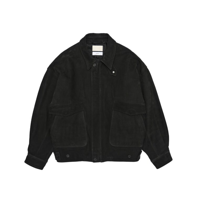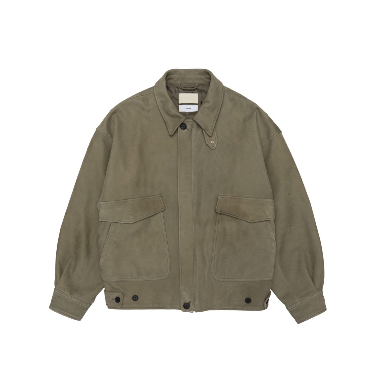 ミリタリーのマスターピースである「A-2」をベースに、リブを排除し共生地で仕立てることで、カジュアルさを抑えたミニマルなルックスに仕上げた一着。後身頃の裾には平ゴムを配し、程よい絞りを加えています。前身頃にはボタンで調整可能なタブを備え、シルエットの変化が可能。通常より大きく設定した腰ポケットが、シンプルなデザインの中でアクセントとなっています。背面にはクッションプリーツを施し、可動域を確保。襟元にはドットボタン仕様のチンタブを備え、スタンドカラーとしての着用も可能です。素材にはCOW NUBUCK LEATHERを使用。シボ革の銀面を削ることで、マットで柔らかな風合いを持たせつつ、スエードよりも高い堅牢性を備えています。着用を重ねることで、起毛が潰れ光沢のある表情へと変化します。