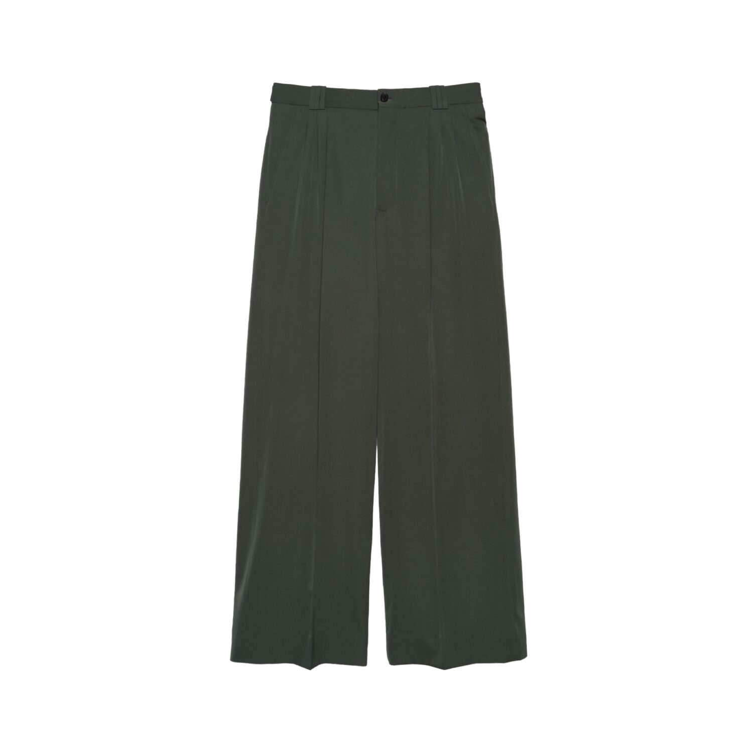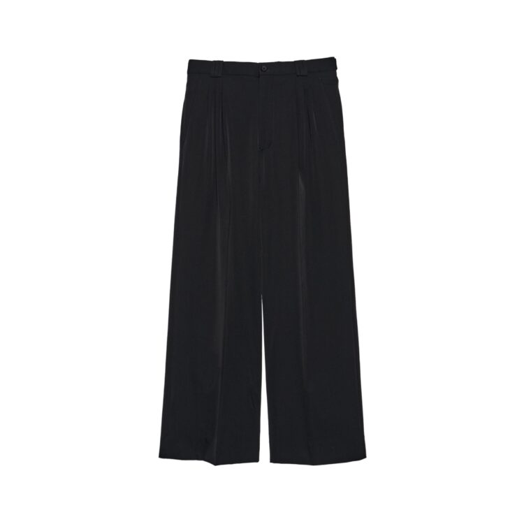 YOKEを代表する定番アイテム「3pleated Wide-leg Trousers」に、Graphpaperオリジナルのハイブリッドギャバジンを採用した特別なモデル。ウールの美しい質感と、ナイロンによる高い耐久性・形状安定性を兼ね備えています。広い裾幅と、フロントに施された象徴的な「3タック・3ループ」により、ボリューム感のある洗練されたワイドシルエットを形成。左の後ろポケットには、玉縁を貫通させたボタンを配しています。ウエストサイドにはアジャストタブを備え、ベルトレスでの着用やシルエットの微調整が可能です。