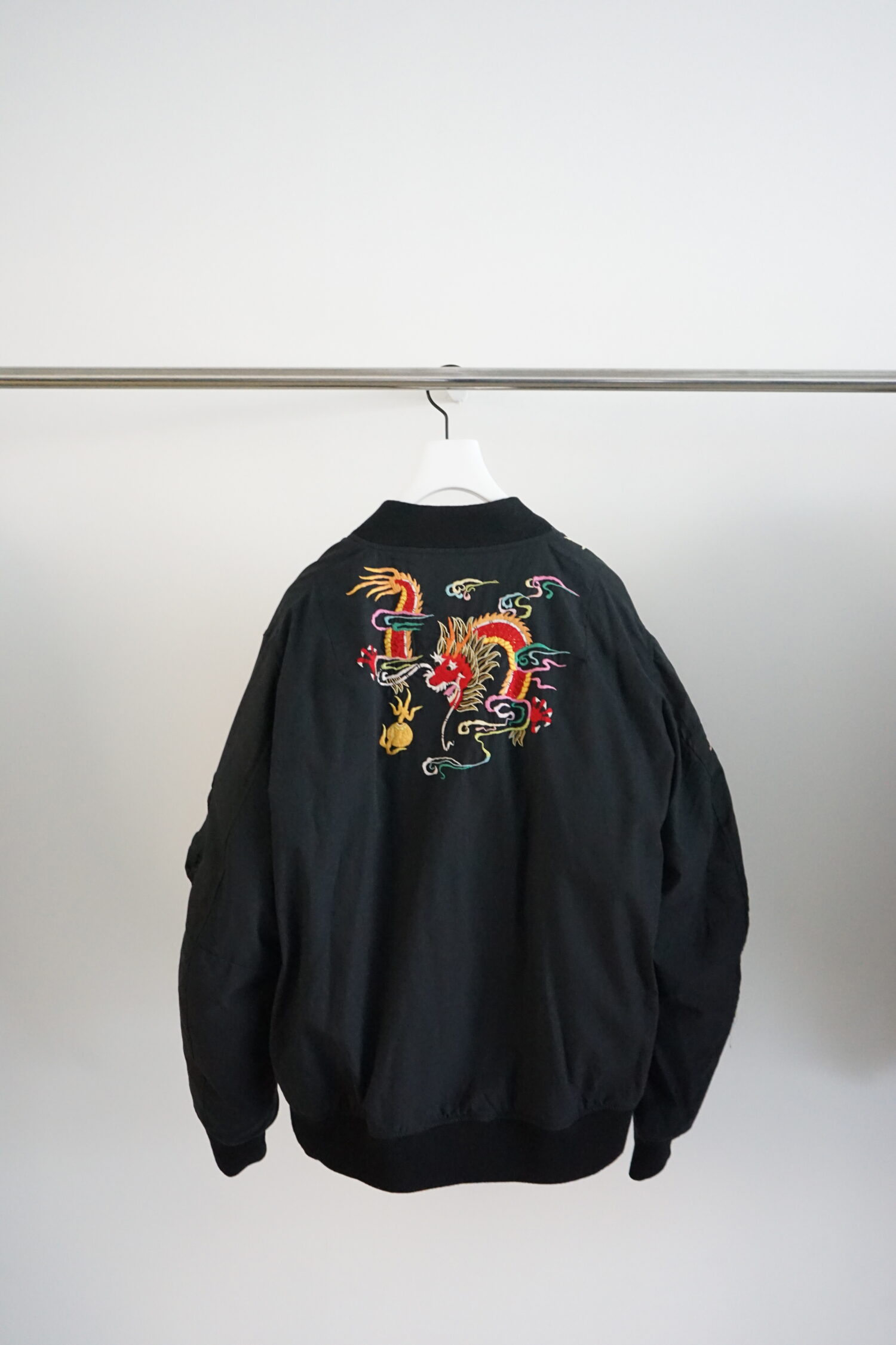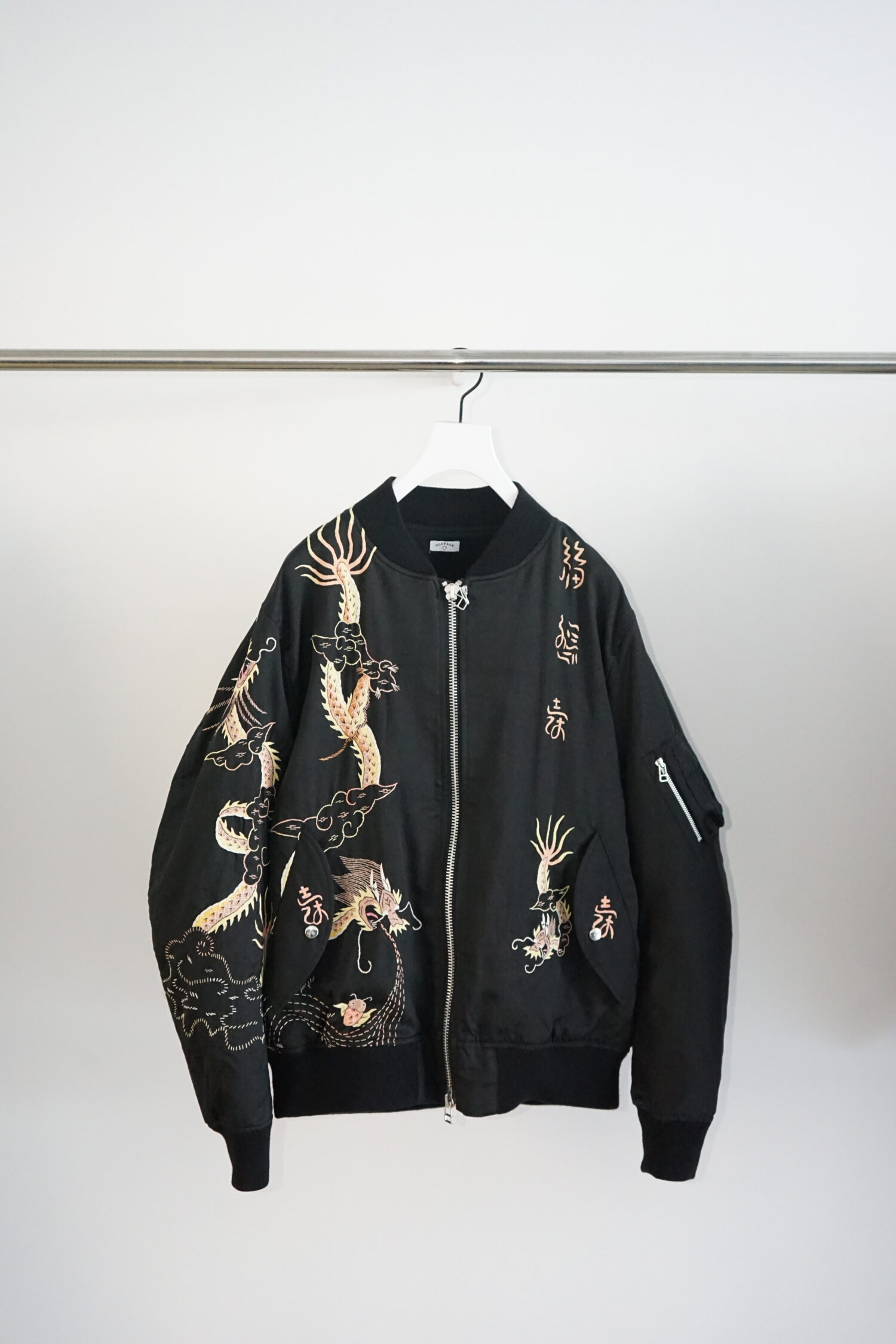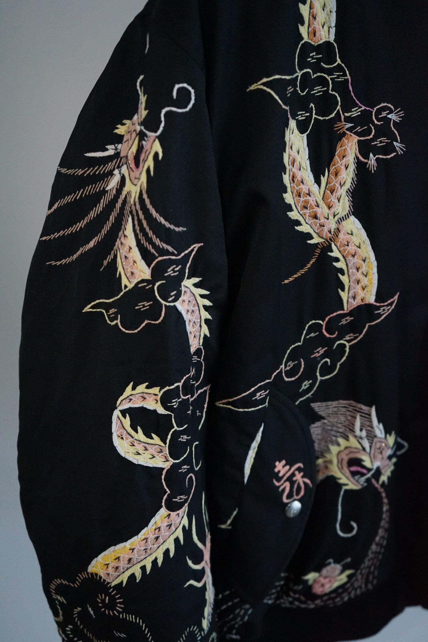 古着の龍刺繍のガウンを解体して再構築された"FLIGHT JACKET"。 胸、背中、袖にそれぞれ刺繍が施されています。 二重仕立てでシーズンレスで着用できる仕様です。 ※stirwiseのみのエクスクルーシブアイテム仕様となります。