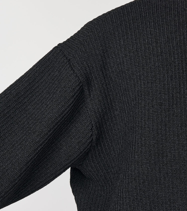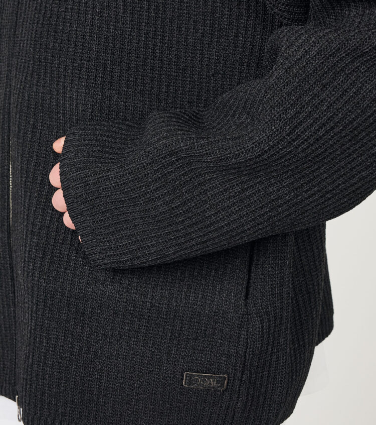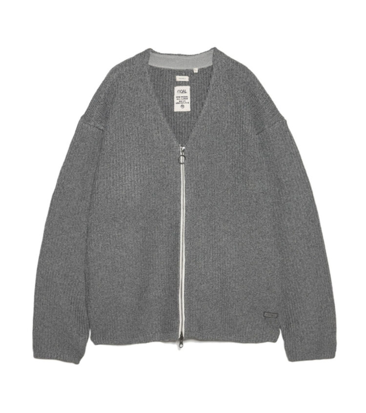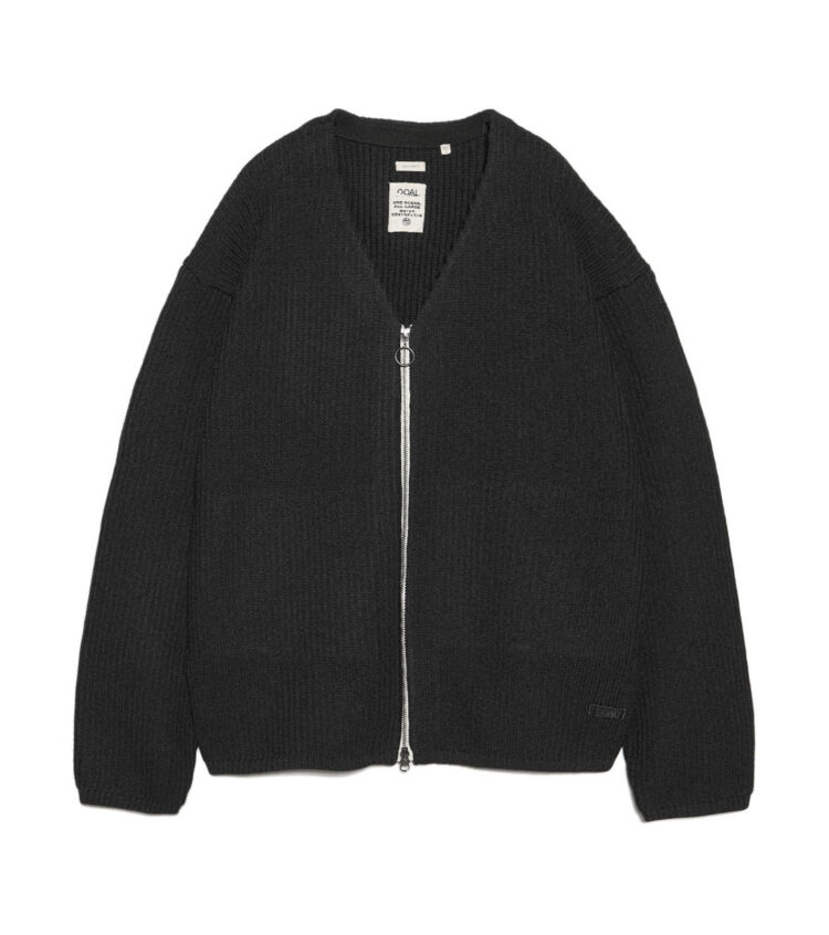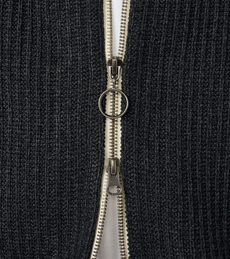 ・5G変形畦編みで仕上げたジップアップカーディガン。