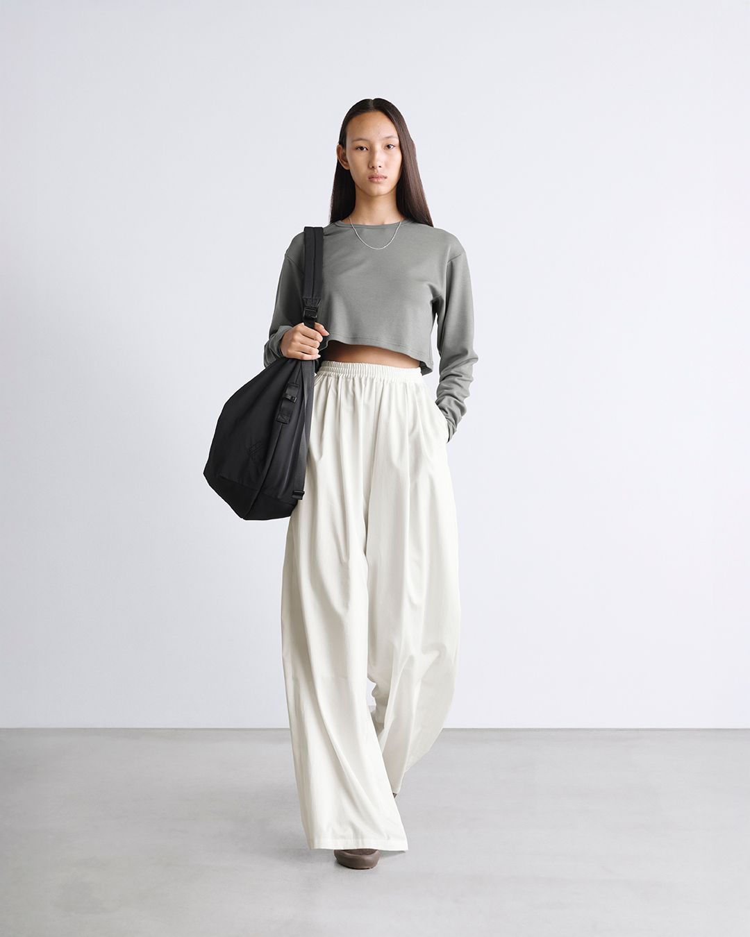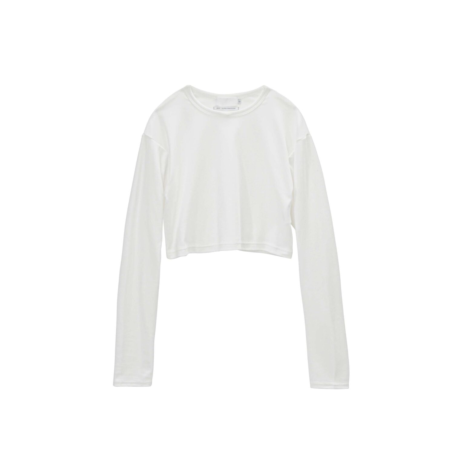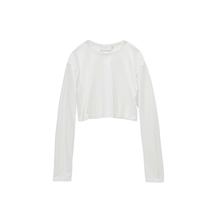 細くてしなやかな糸で編み上げたコットンスムース素材。独自の仕上げで微細な毛羽を残すことで綿本来の自然な柔らかさに品のある風合いを加えた。大胆にカッティングしたレングスが特徴の、コンパクトなロングスリーブTシャツ。