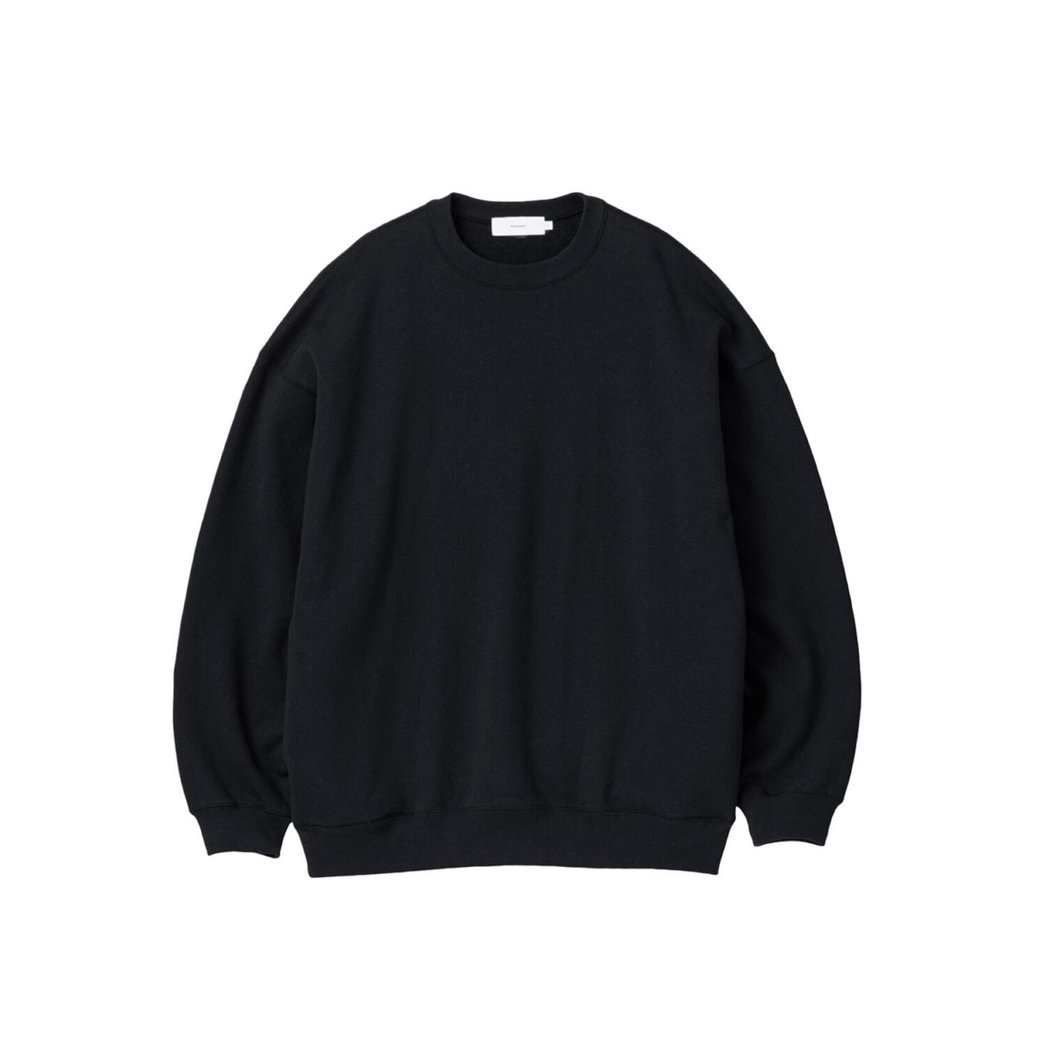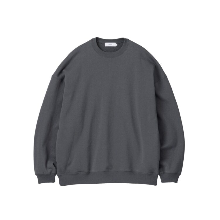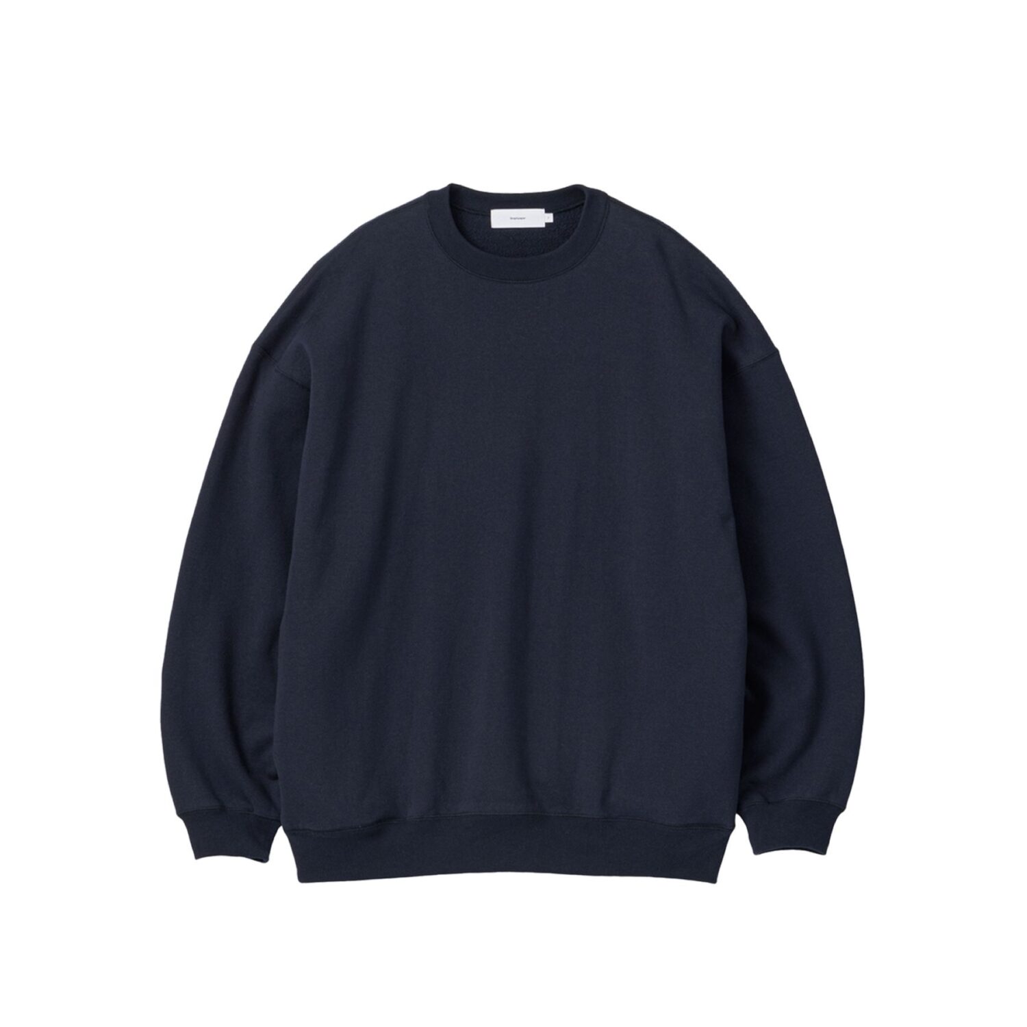 アズマ機という旧式編機を使用したオリジナルの裏毛。表面のきれいに揃った天竺目、膨らみとハリ感、裏面のループ分量まで幾度も調整を重ねた拘りの素材。度目を詰めることで実現したダレにくさもポイント。詰まったコンパクトな首元、程よくゆったりとしたボディのクルーネック。