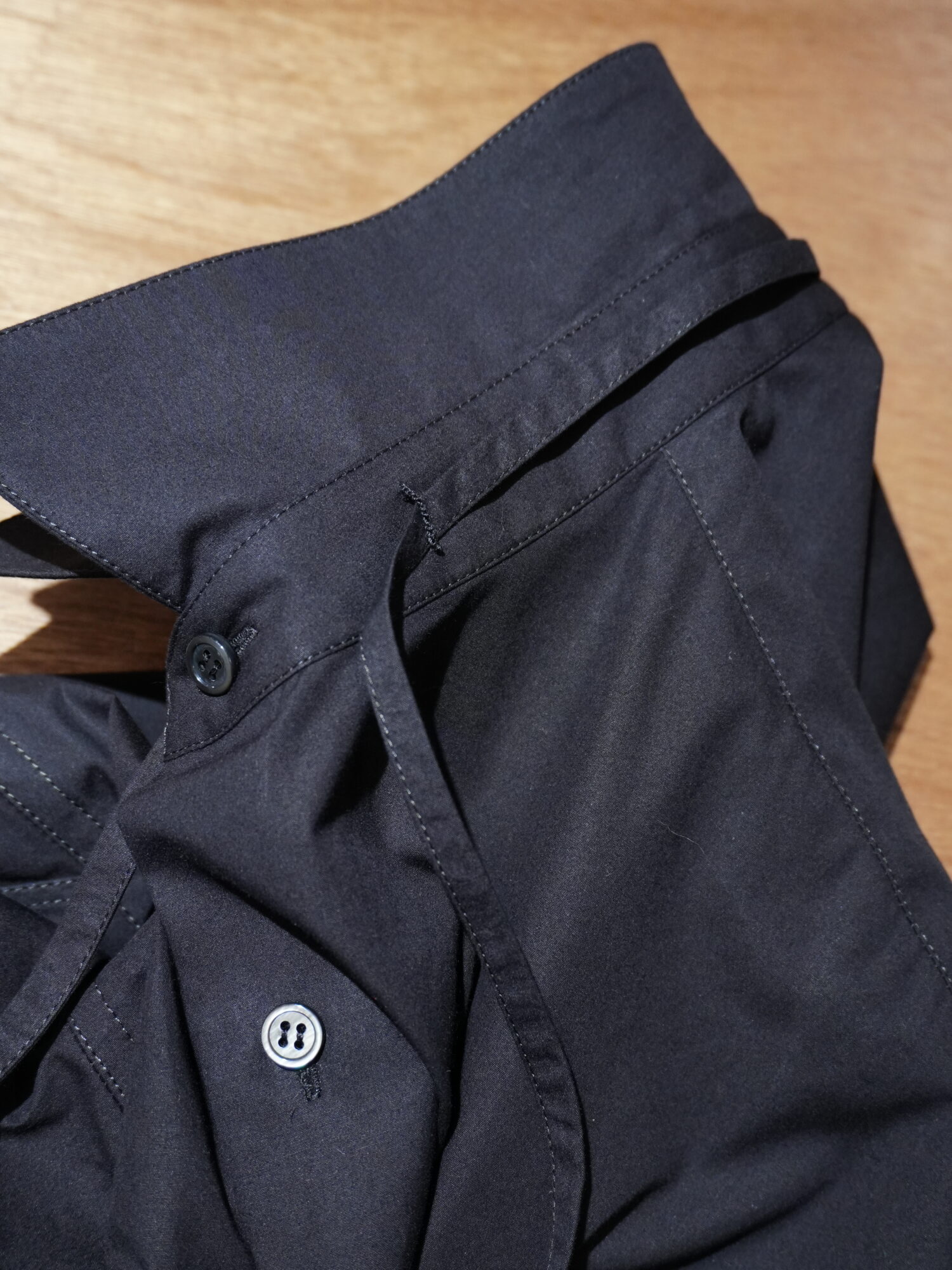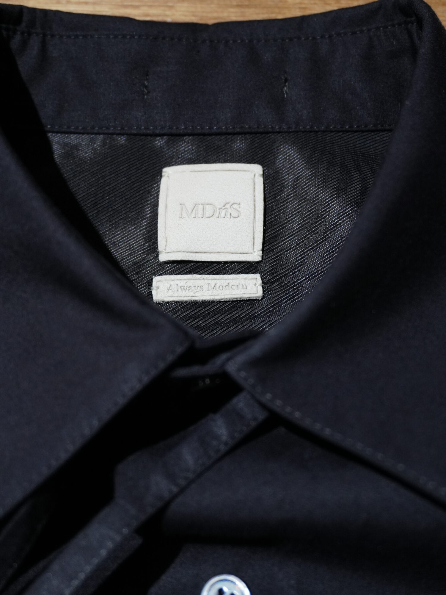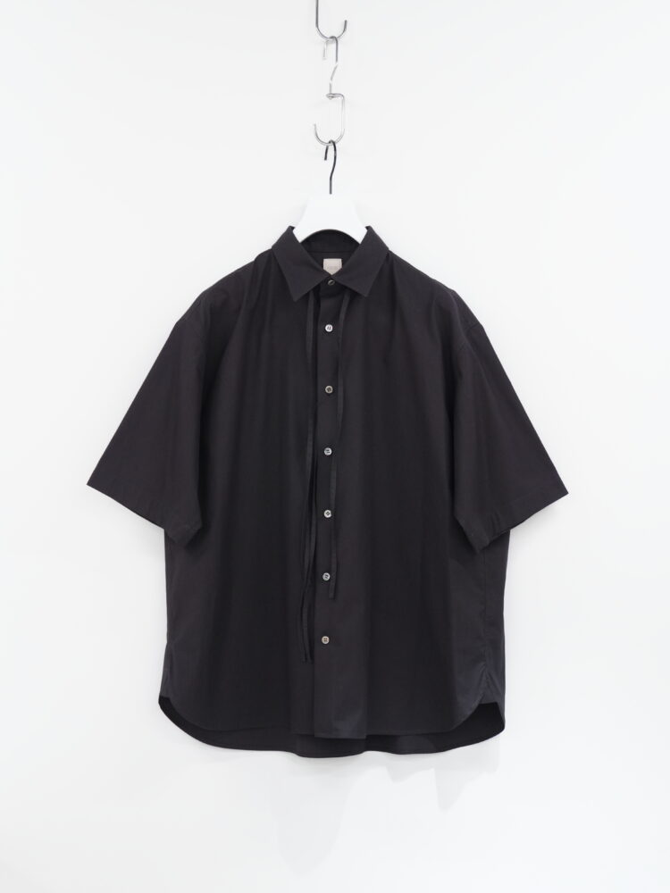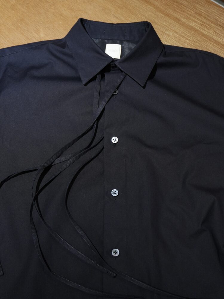 シグネチャーの長い紐ディテールは台襟の後ろ中心と前立ての2番目ボタン横に取り付け、アクセントにしています。