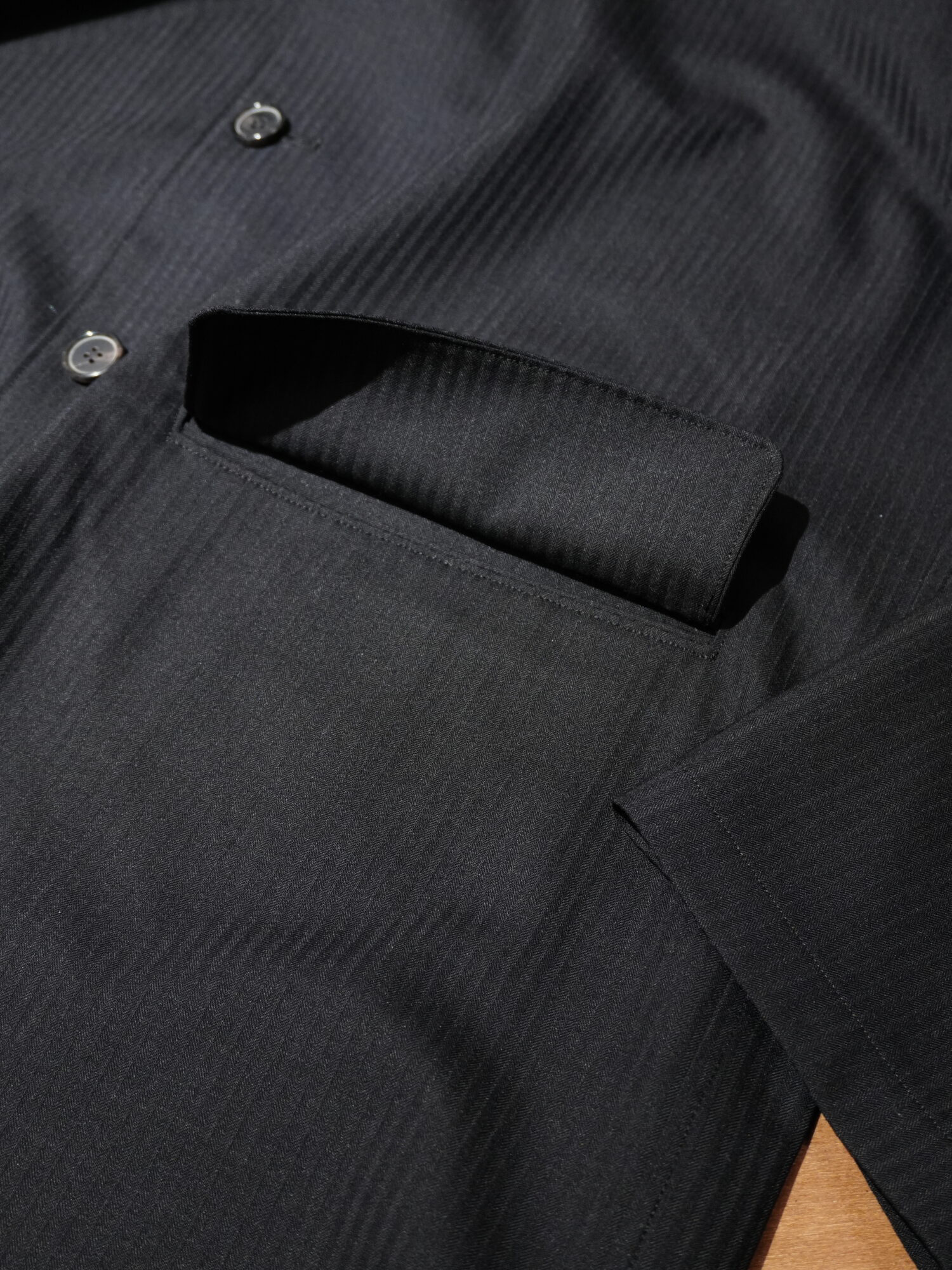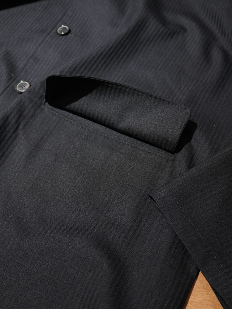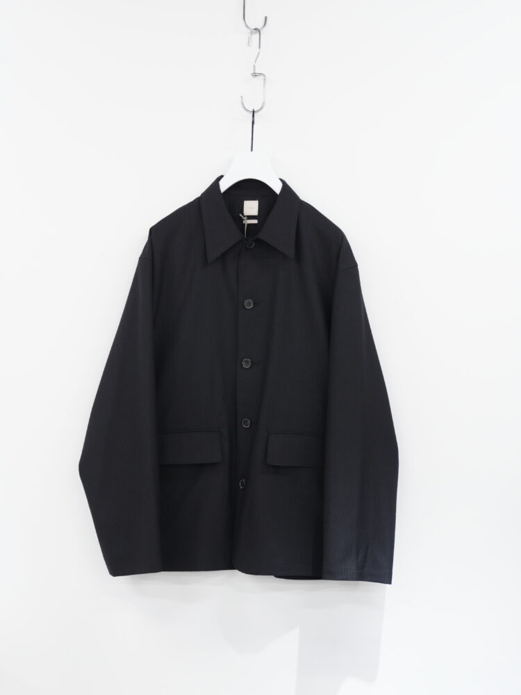 ウール、ポリエステル、シルク混の生地を使用したシャツジャケット。極細番手ならではの繊細な風合いと、シルク混による上品な光沢感が魅力です。クラシックなテーラードではなく、裏地のない軽やかな仕立てで、カーディガン感覚で羽織れる一着。リラックスしたシルエットとミニマルなディテールが、現代的な上品さを演出します。