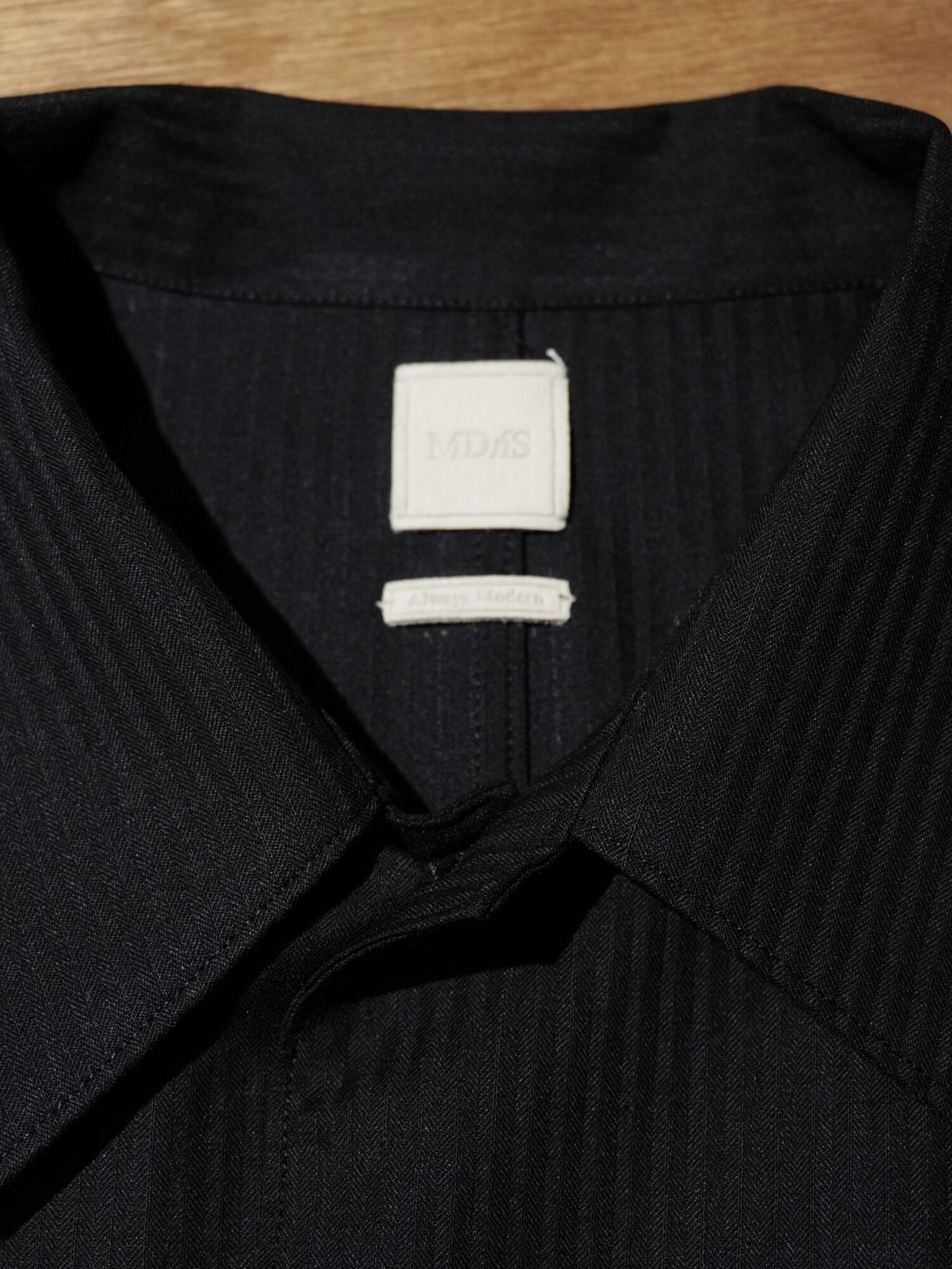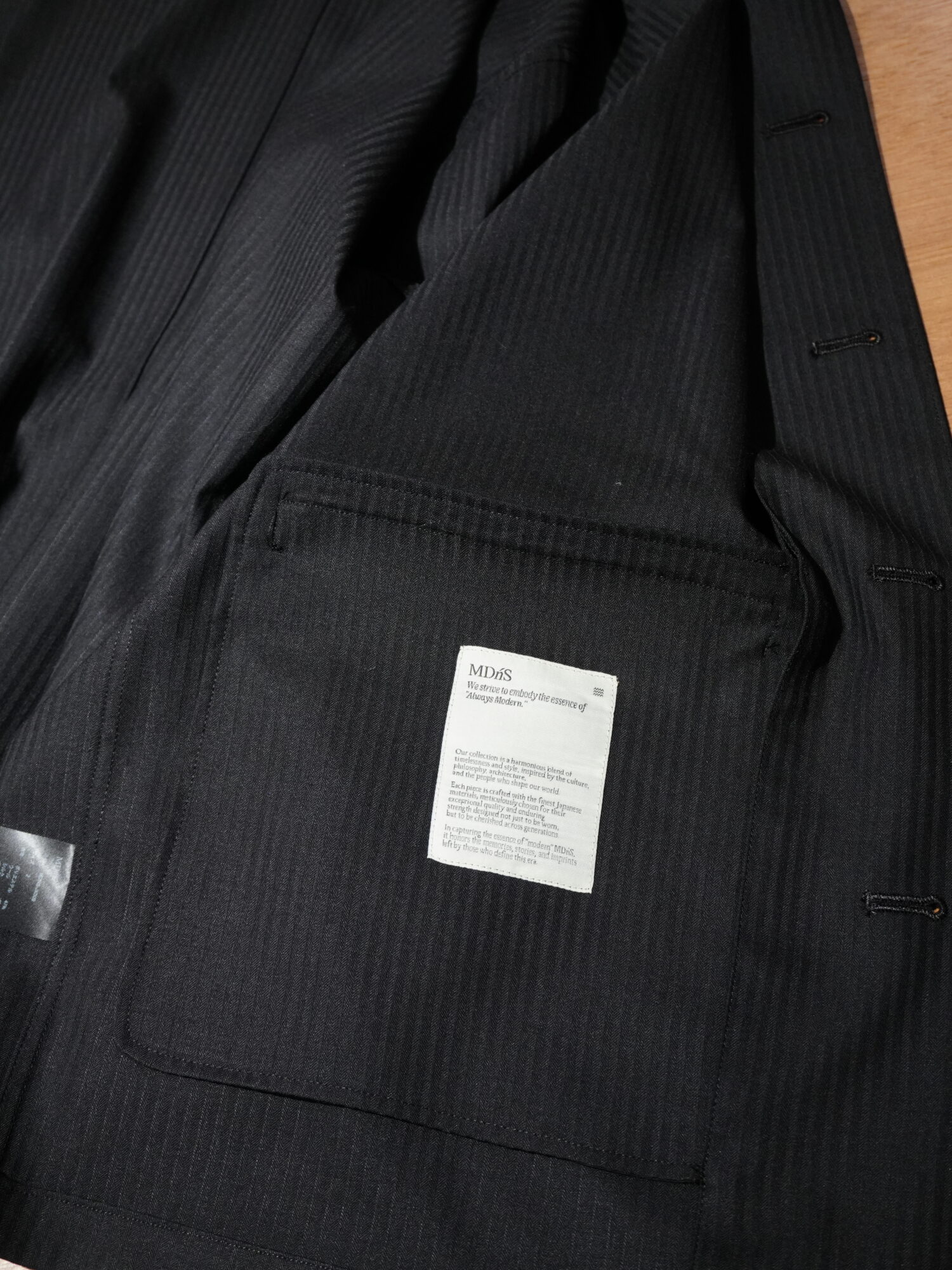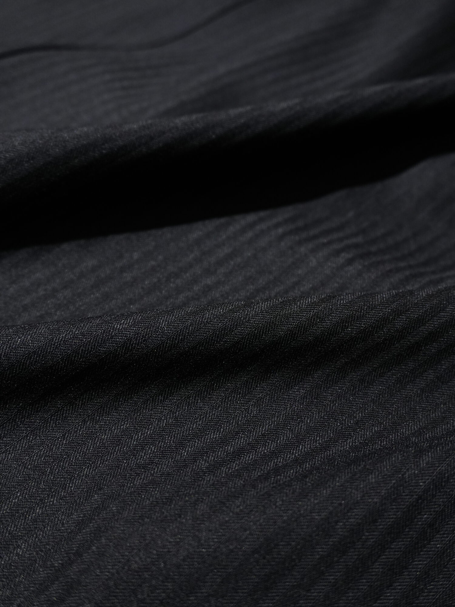 ウール、ポリエステル、シルク混の生地を使用したシャツジャケット。極細番手ならではの繊細な風合いと、シルク混による上品な光沢感が魅力です。クラシックなテーラードではなく、裏地のない軽やかな仕立てで、カーディガン感覚で羽織れる一着。リラックスしたシルエットとミニマルなディテールが、現代的な上品さを演出します。
