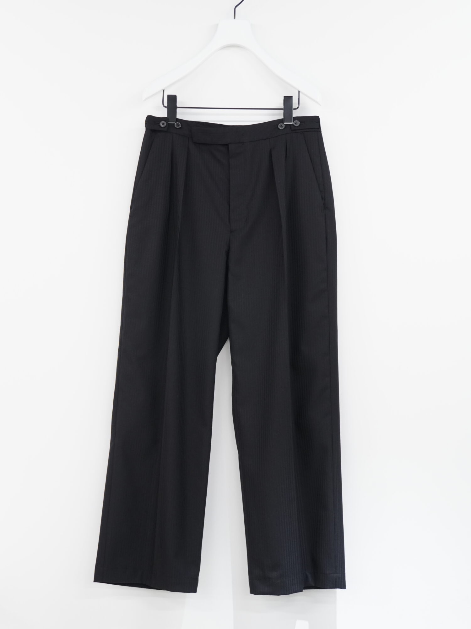 ウエストにはアジャスターを備え、ベルトレスでもサイズ調整が可能。ゆとりあるワイドストレートシルエットにタックを入れることで立体感と動きやすさを確保。落ち感のある生地が美しいドレープを生む上な一本です。