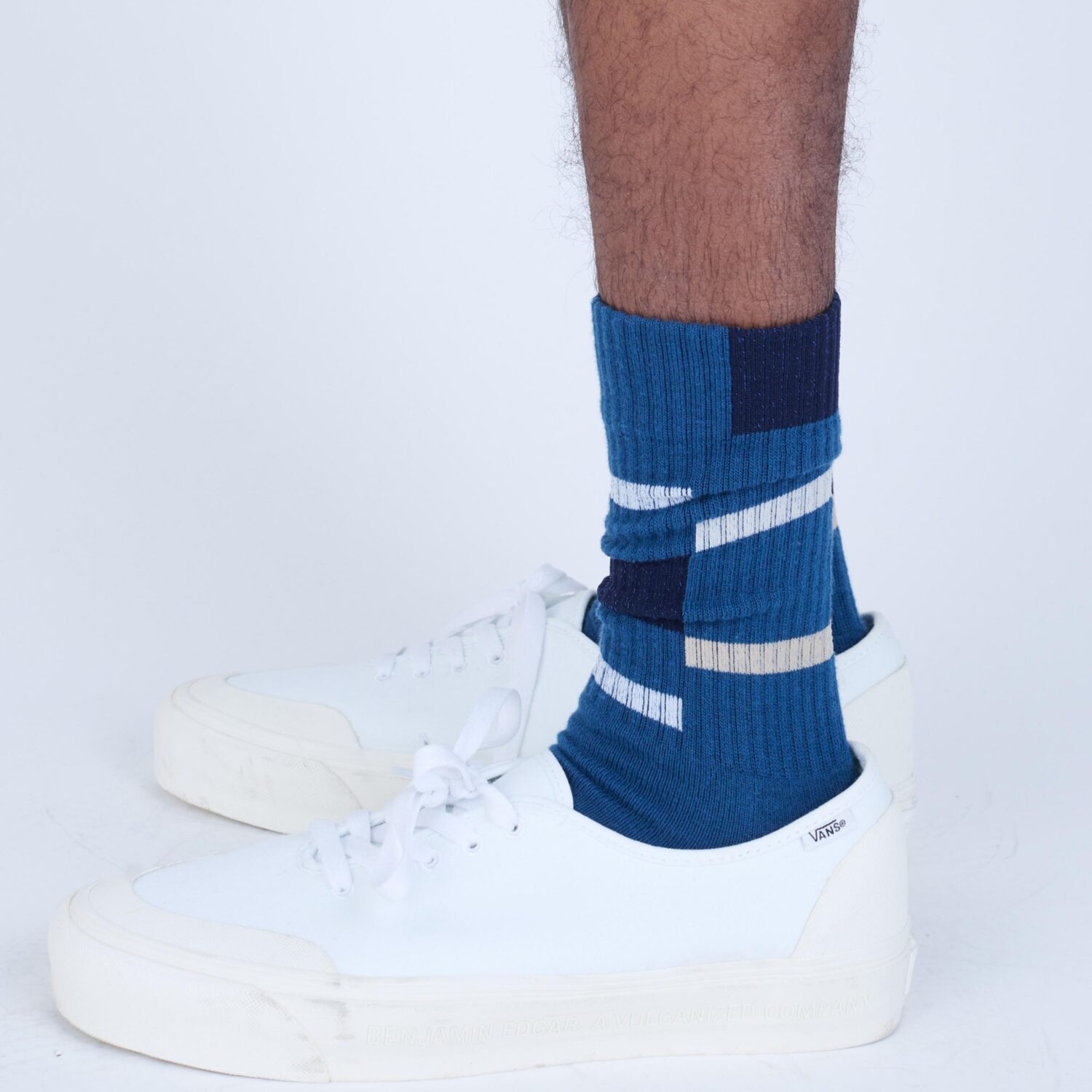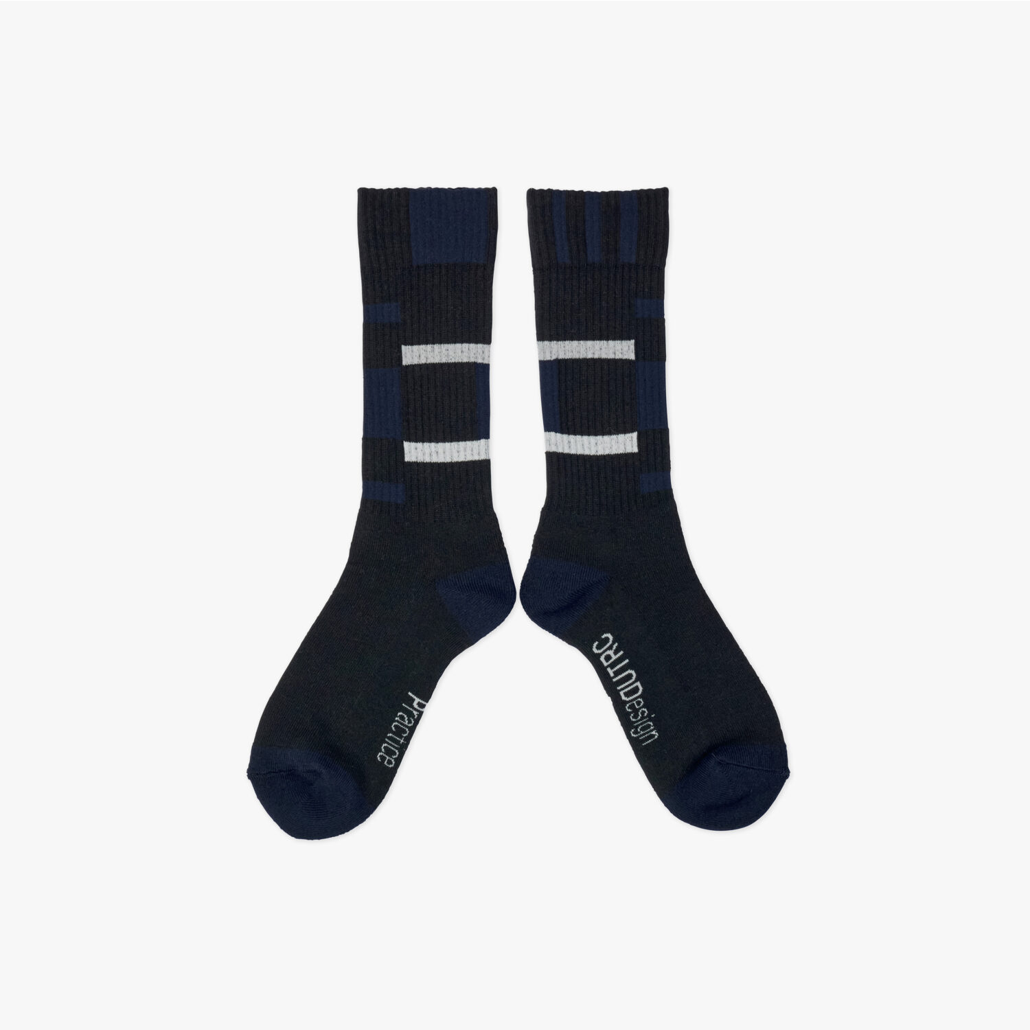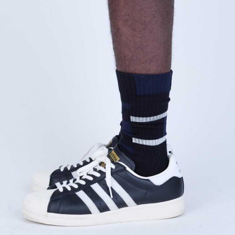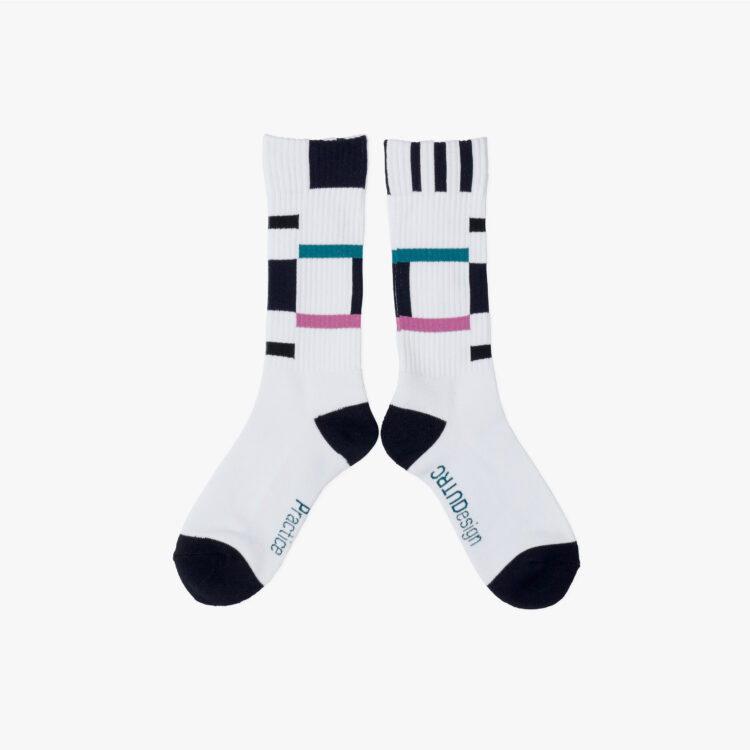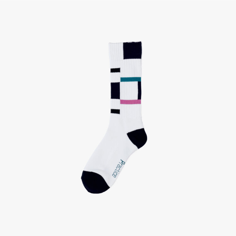定番のグラフィックソックス。左右対称の色面構成のグラフィックをあしらいました。今シーズンはWHITE、BLACKに加え、SLATE BLUEを展開。