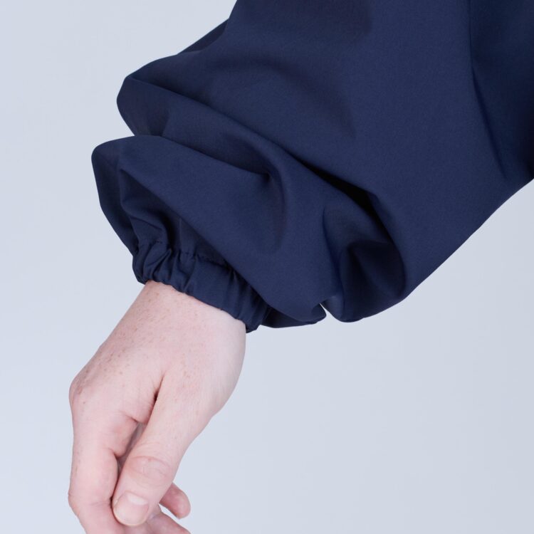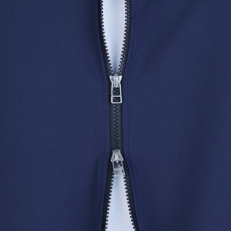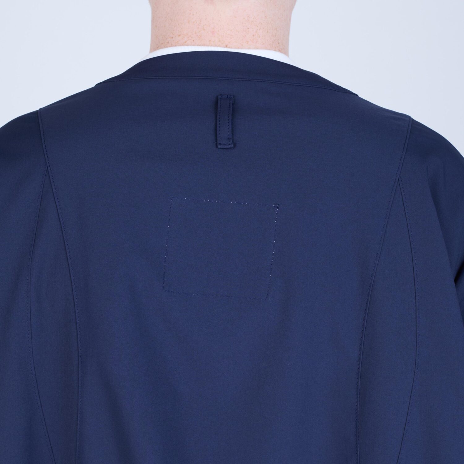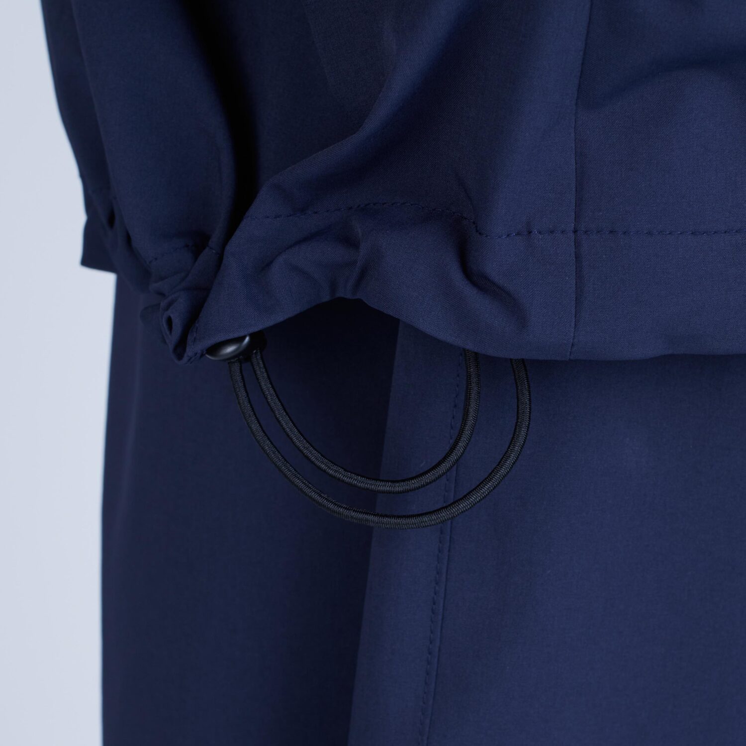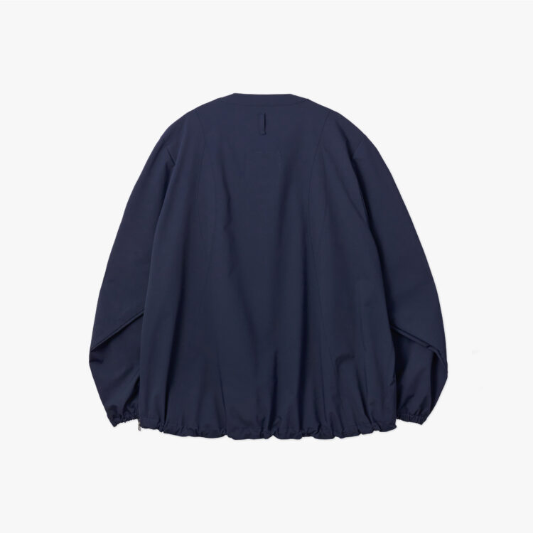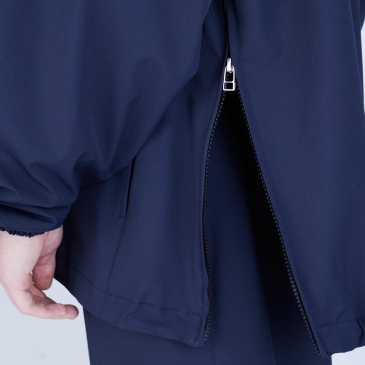 右裾にはスピンドル、左裾にはジップを配し、シルエットや通気性の調整が可能。機能性と美しさを兼ね備えた一着です。