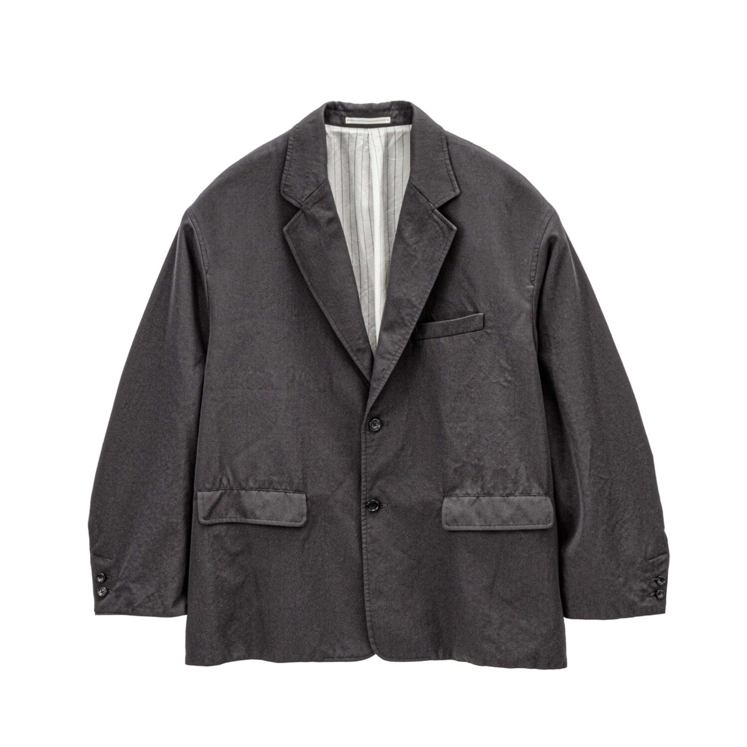 縦糸と横糸の密度設計で綾目をシャープに際立たせながら、ハリ感とドレープ性を両立させたウールツイル。スケールの改質処理によって、綾目が一層クリアになり、染色性も向上。その結果、深みのある陰影が生まれ、独特の風合いを醸し出している。ゆったりとしたオーバーサイズシルエットのテーラードジャケットは製品でさらに縮絨加工を施すことで生まれる歪みやシワ、擦れやアタリが独特なまい。