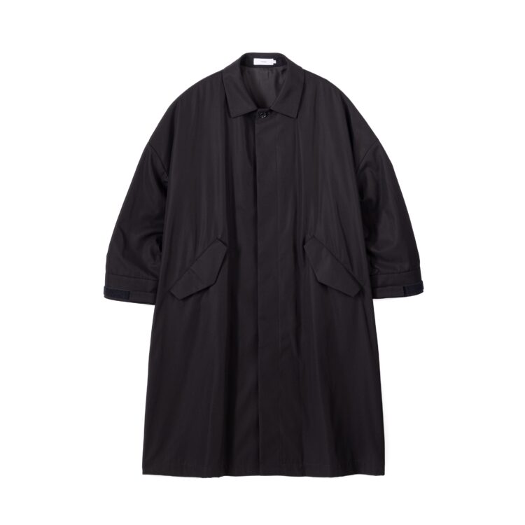 大胆なオーバーサイズシルエットに最小限のステッチワークと比翼仕立てによるミニマルなステンカラーコート。コットンの強撚糸をガス焼きして、毛羽立ちを押さえ合繊のようなクリアな質感を表現した高密度ギャバジンは、まるで梳毛のような品のある光沢とシャリ味のあるタッチ、シワになりにくい反撥感のある風合いが特徴の素材です。