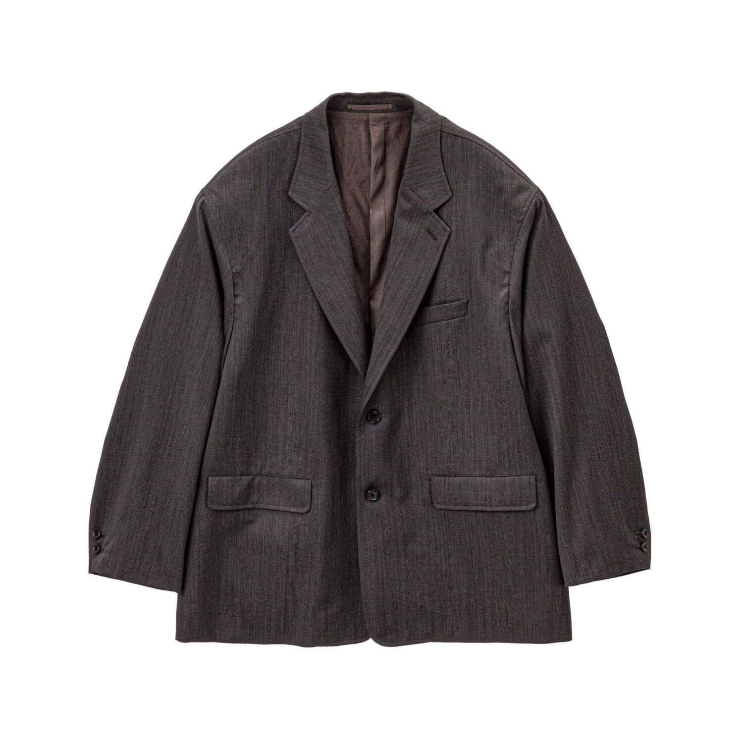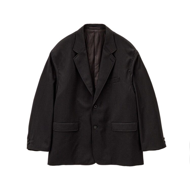 80'sのムードを纏う組織感の際立つメランジウールのミニヘリンボン生地。膨らみのあるウールとポリエステルを限界まで撚糸することで細かいチラついた撚り杢の表情が印象的。アメリカンアイビーのテーラードを再編集したオーバーサイズ2ボタンジャケット。フラワーホールでも留めることのできる仕様。