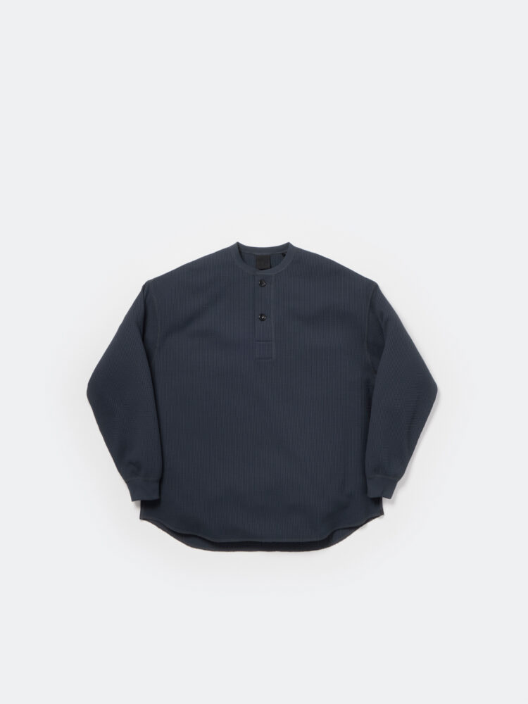 アメリカ軍の代表的な防寒インナー、ワッフル素材を使用したサーマルヘンリーネックロングスリーブTシャツ。クラシックな特徴を活かした裾のラウンドカットはフリミシンにて処理。レイヤリング、春先から初夏にかけて活躍する一枚。