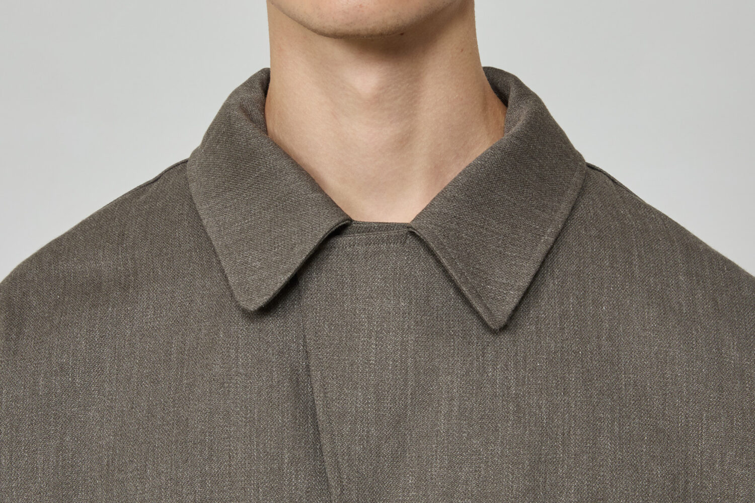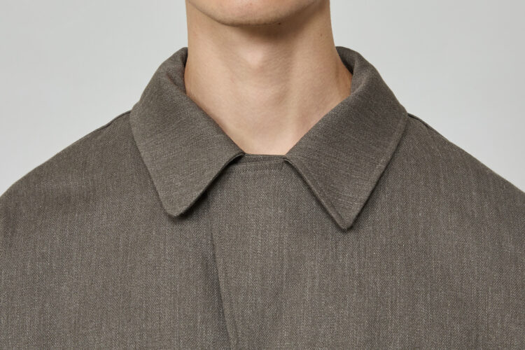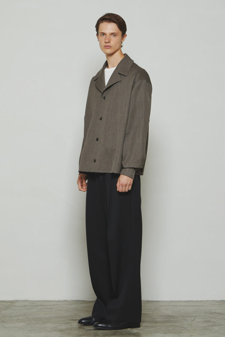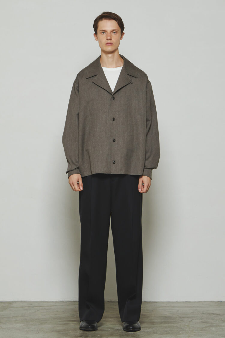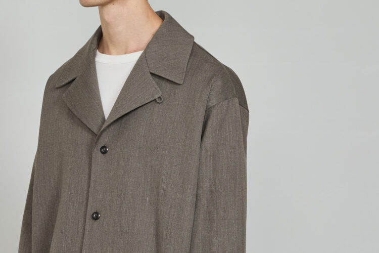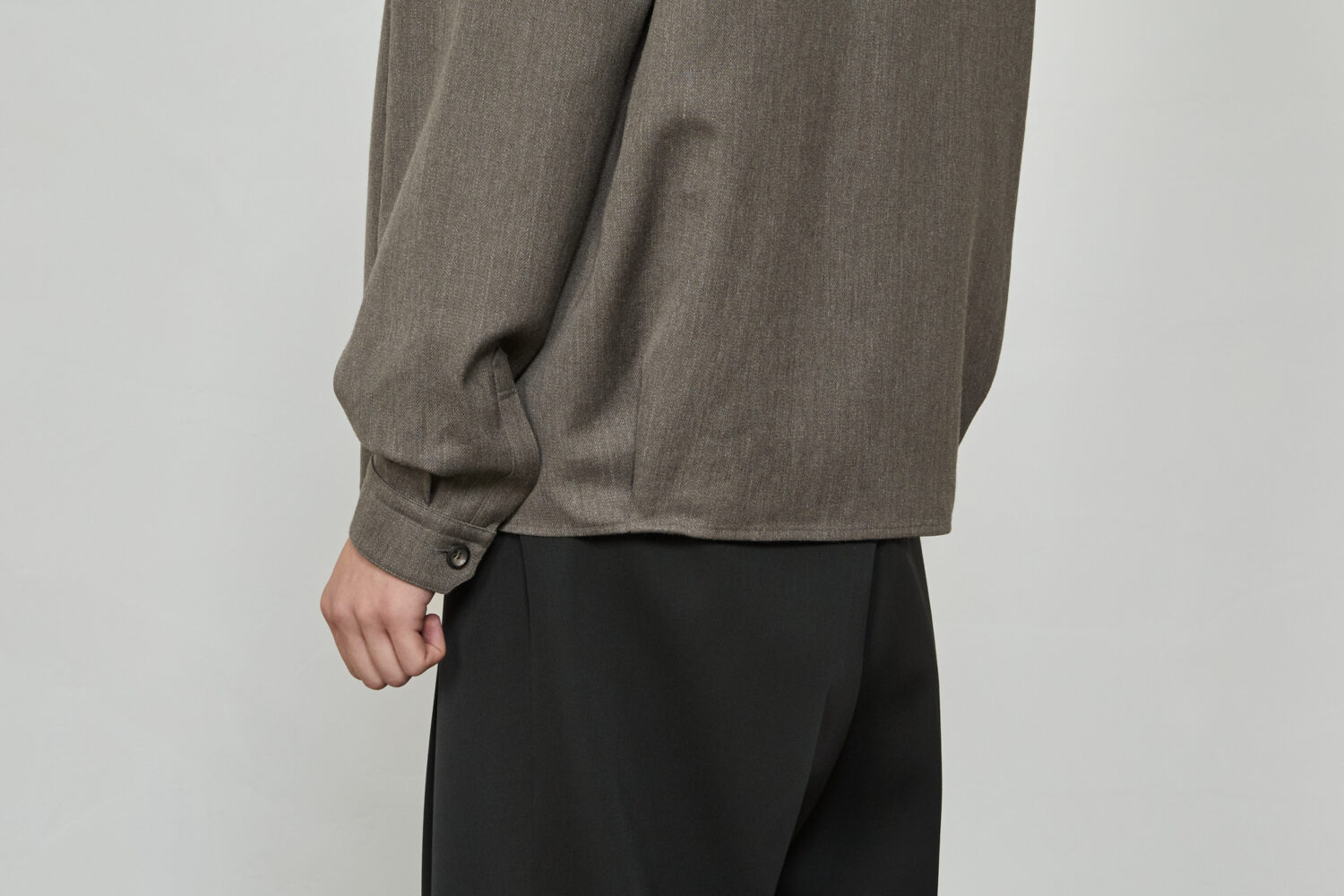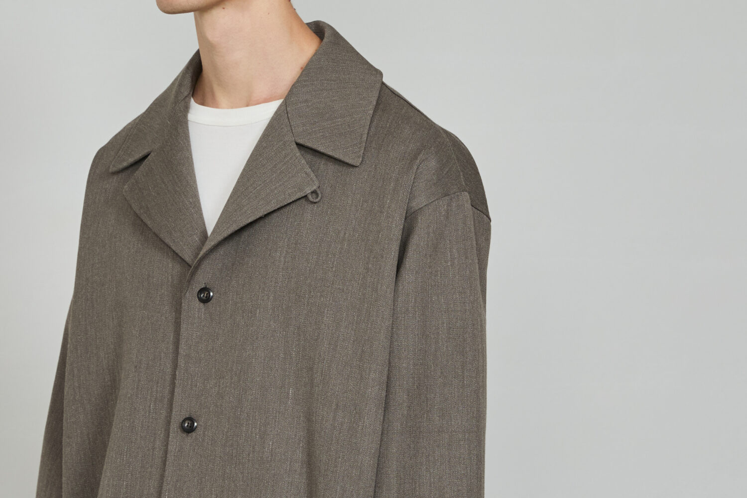 ウールとラミーを組み合わせたバックサテン素材を使用したオープンカラーイージージャケット。Pコートの衿をベースにしたやや大きめのオープンカラーが特徴で、身頃はシェイプを入れずストレートに落ちるラインに全体的にゆとりを持たせたパターン設計により、ドロップショルダーは自然に直下しアームホールに余計なシワが出ずバストラインも美しく見えるよう計算されています。袖はやや長めに設計されカフスが自然にブラウジングされる柔らかな表情を演出し、袖口のタックで立体感を加えています。裾は後身頃の両脇にタックを入れ丸みのあるブラウジングラインを形成し、フロントはストレートなボックスシルエットでどのボトムスにも合わせやすいバランスに整えています。ハリとしなやかさを併せ持つバックサテン素材は、シャツとしてはもちろん軽めのジャケットとしても活躍する汎用性の高い一枚です。